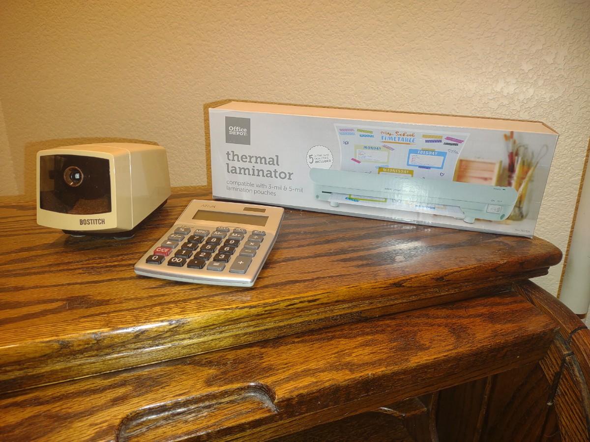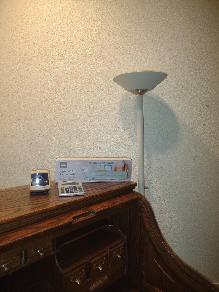 NEW THERMAL LAMINATOR, ELECTRIC PENCIL SHARPENER & TORCHIERE FLOOR LAMP