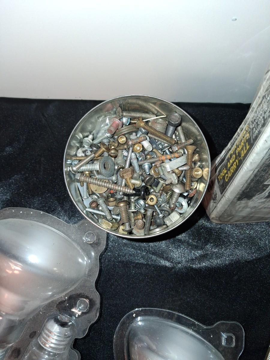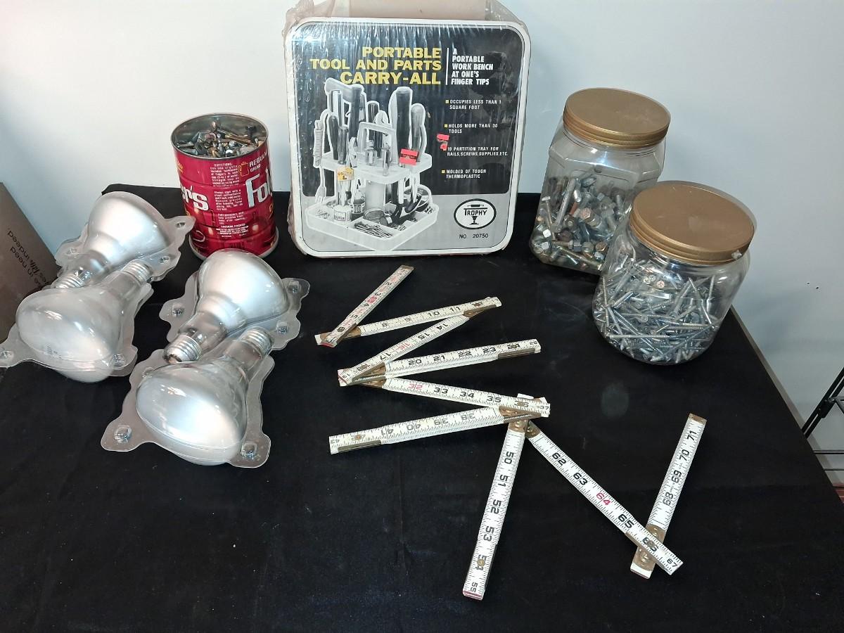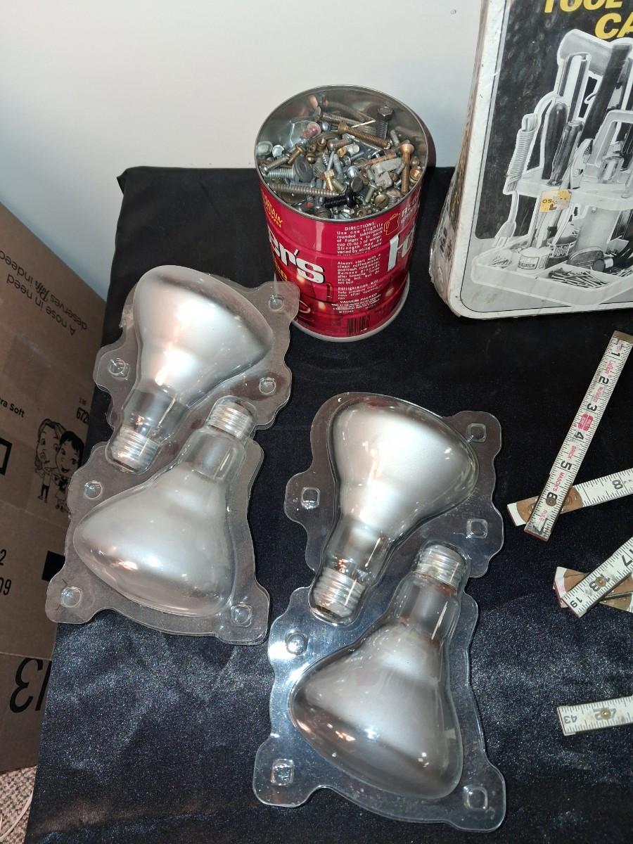 NEW TOOL/HARDWARE CADDY, SPOT LIGHT BULBS, HARDWARE AND FOLDING RULER