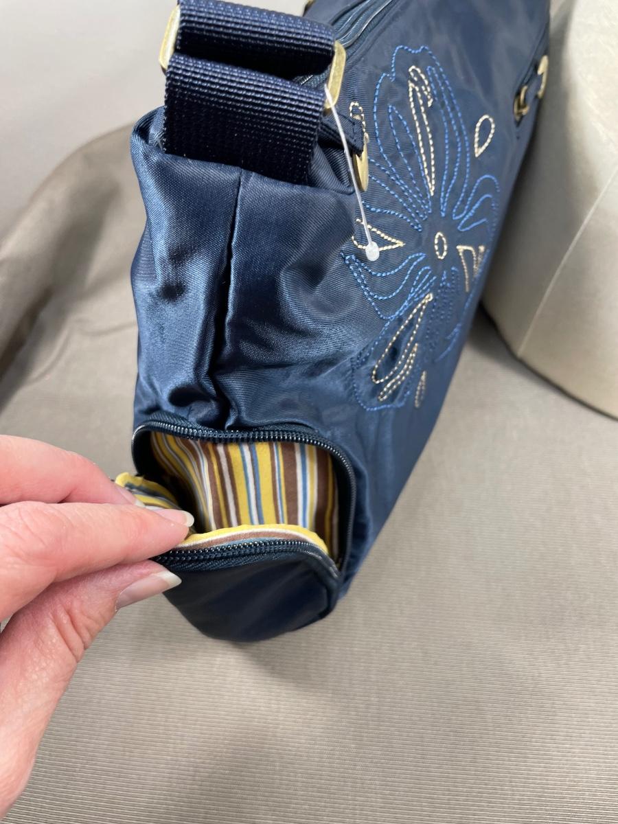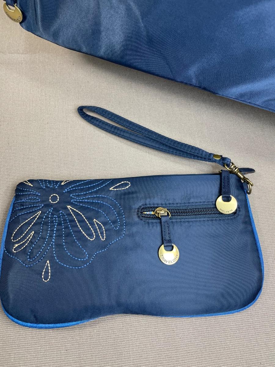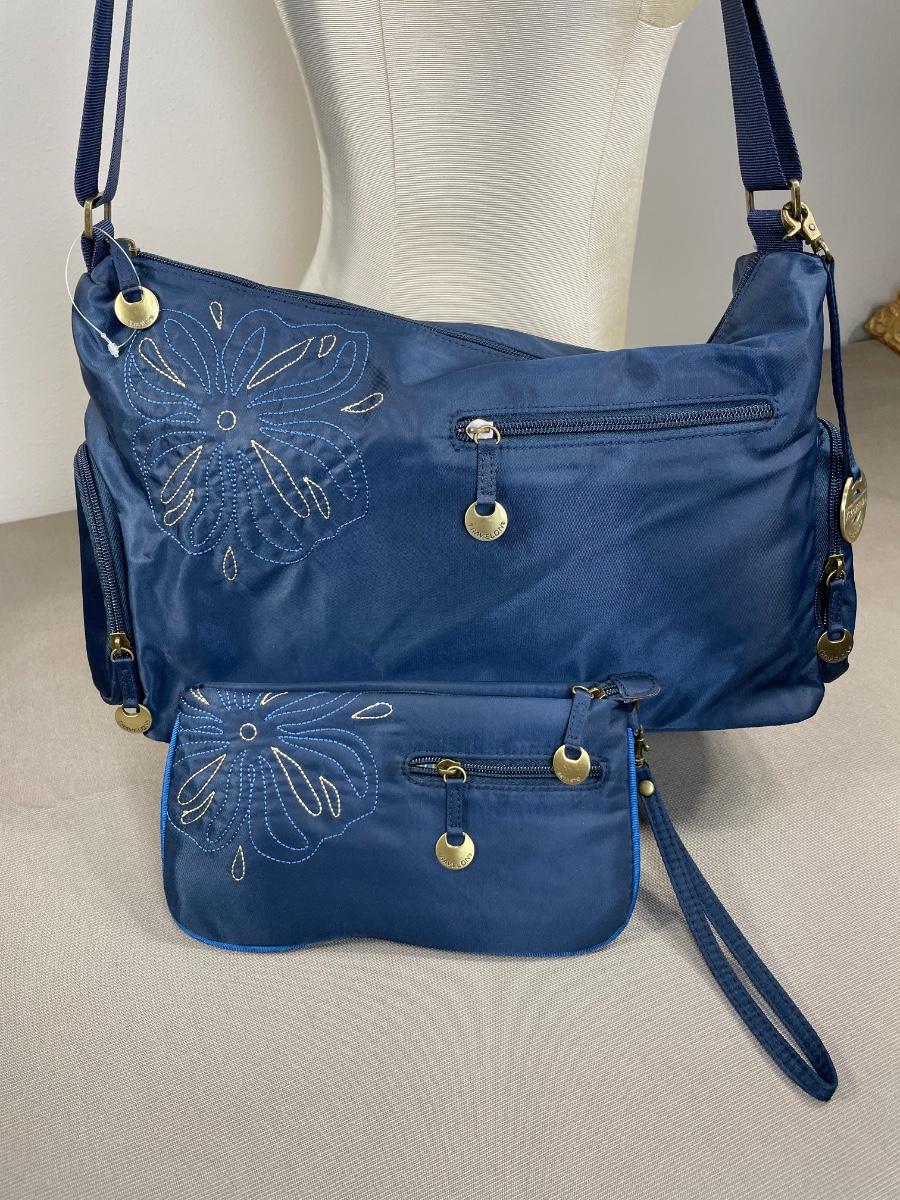 NWOT in excellent condition. With floral embroidered design. Lightweight for travel. Bag has detachable webbed strap. 15” by 9” on the bag with 9” by 5” wallet.