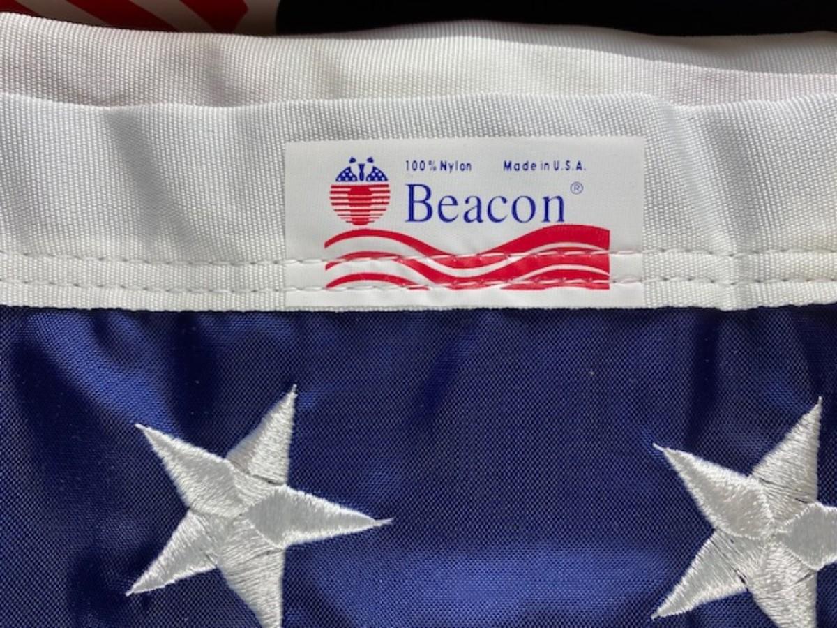 This auction lot is for a United States of America Flag. Our Stars and Stripes. This flag is new and has never been unfurled, made by Beacon. 100% Nylon, made in the USA. Measures about 3-foot by 5-foot. Great home display size.