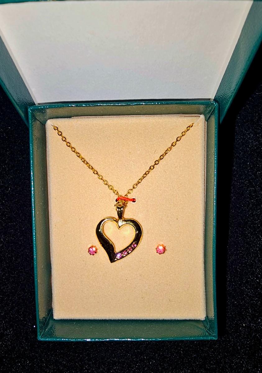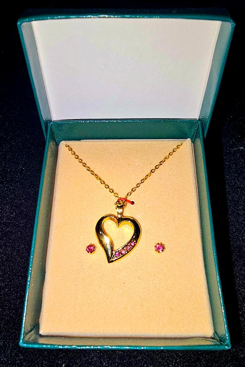 New Vintage Gold Pink Diamond Heart Necklace and Ping Diamond Stud Earrings