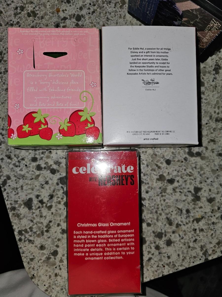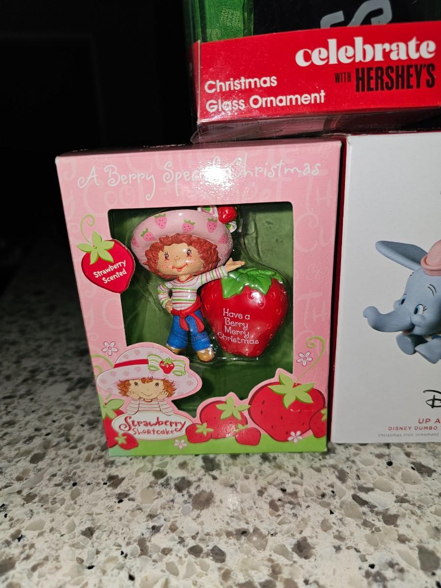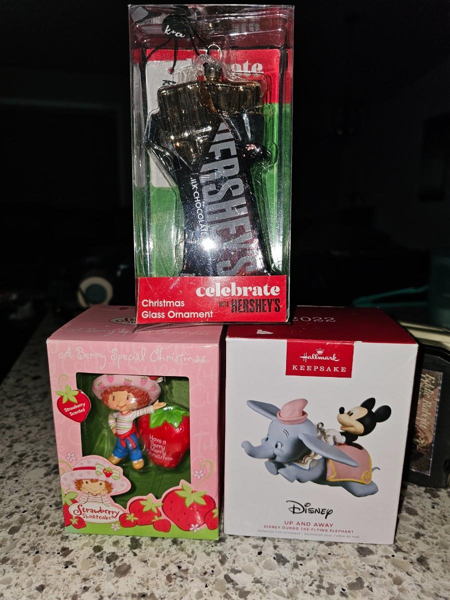 All 3 are new in package vintage limited edition Ornaments. Hershey's is handcrafted rare limited, Strawberry Shortcake, and Mickey/Dumbo Collector's Editions. All Excellent new condition.