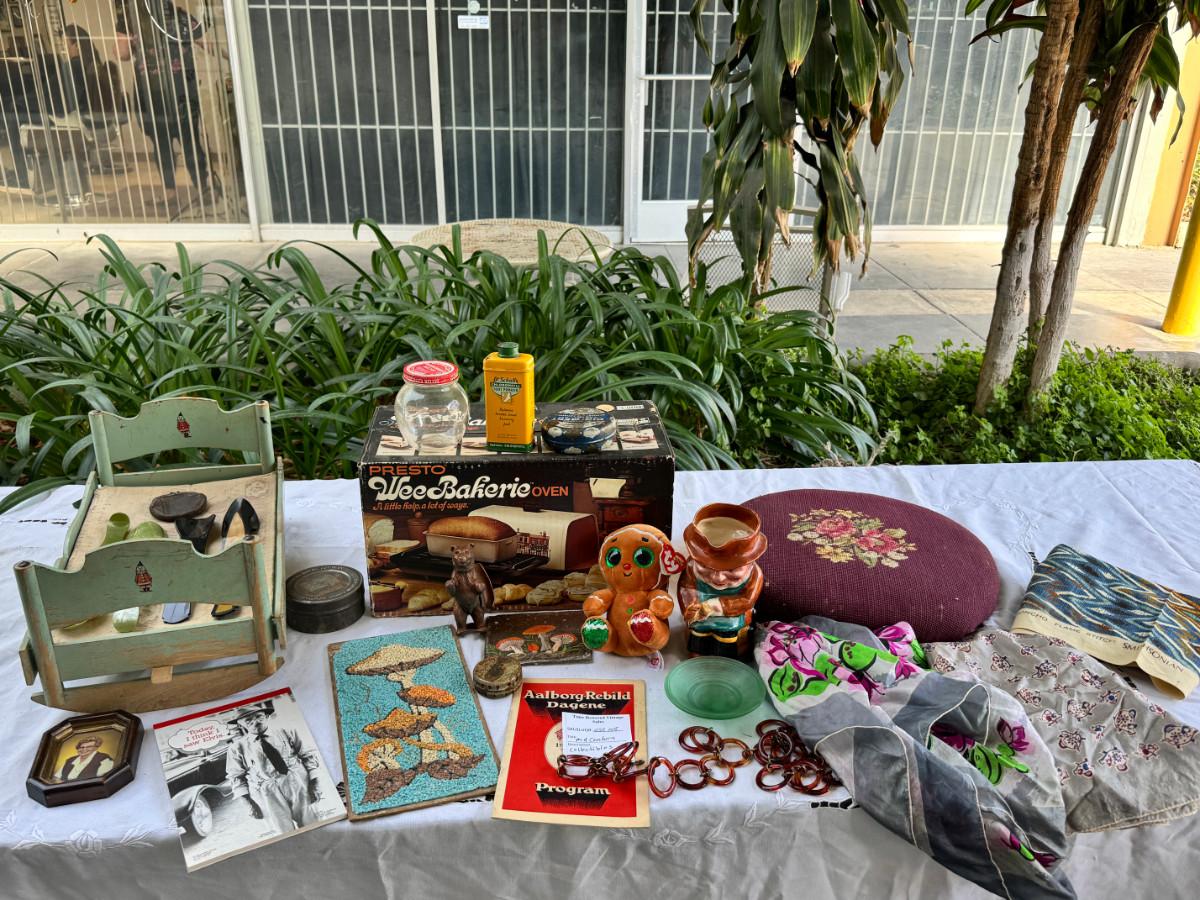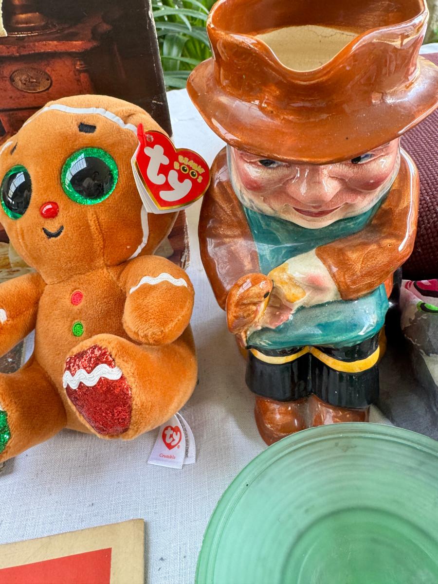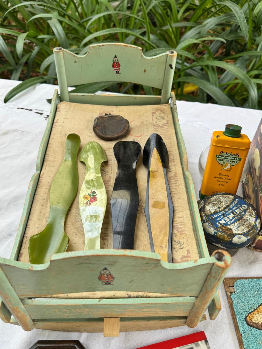 silk scarves, Ceramic Toby, TY Ginger bear, 1940s crib, 1940s shoe horns, vintage containers.