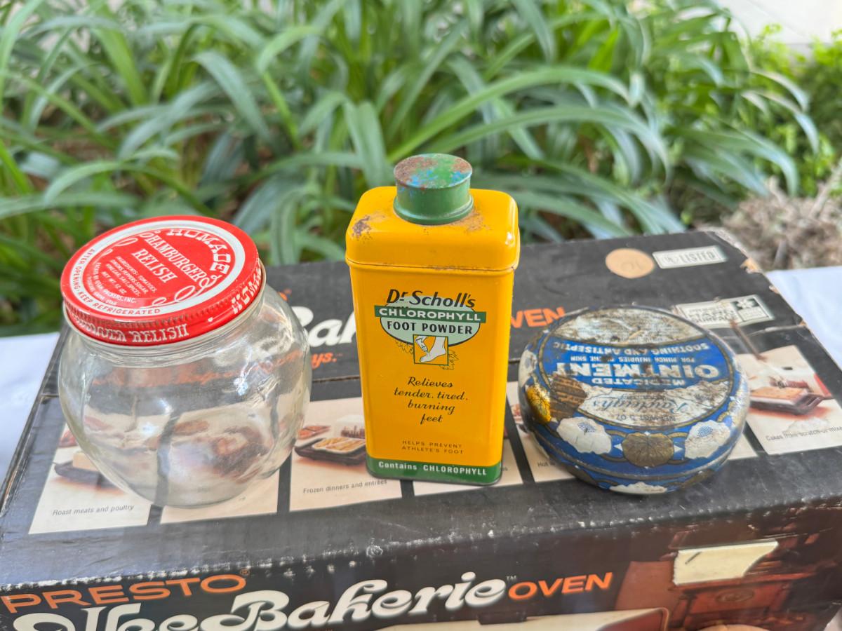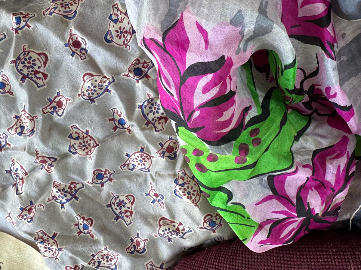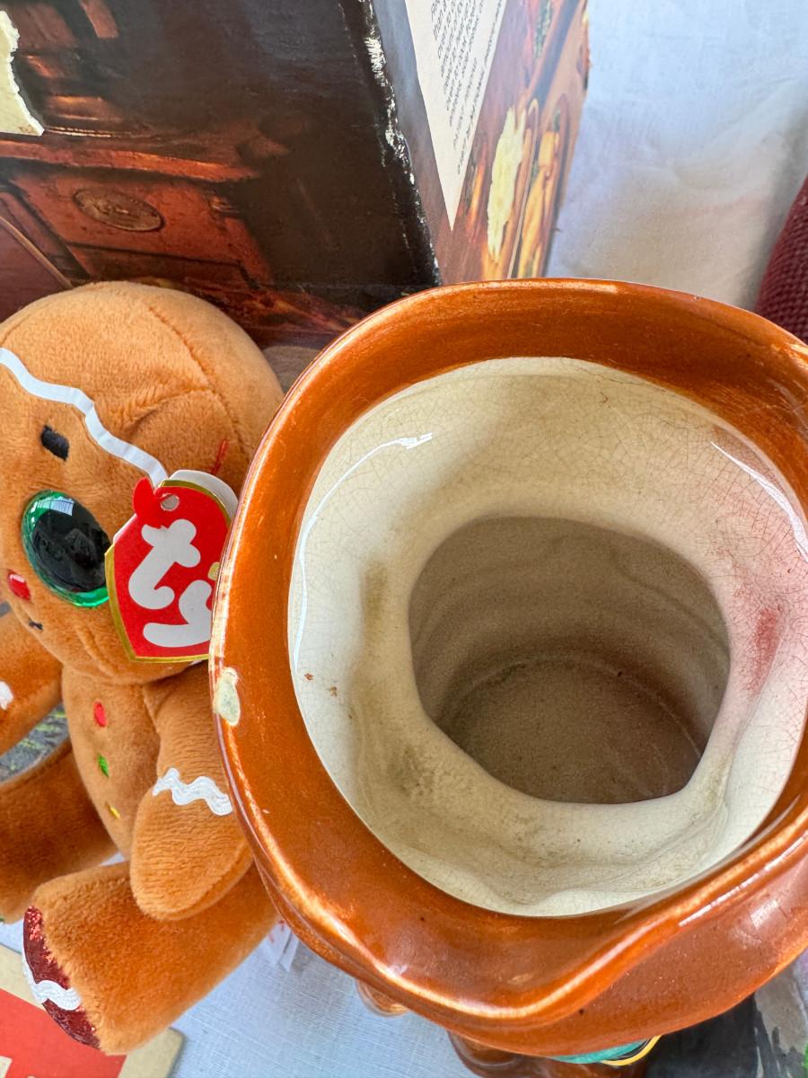silk scarves, Ceramic Toby, TY Ginger bear, 1940s crib, 1940s shoe horns, vintage containers.