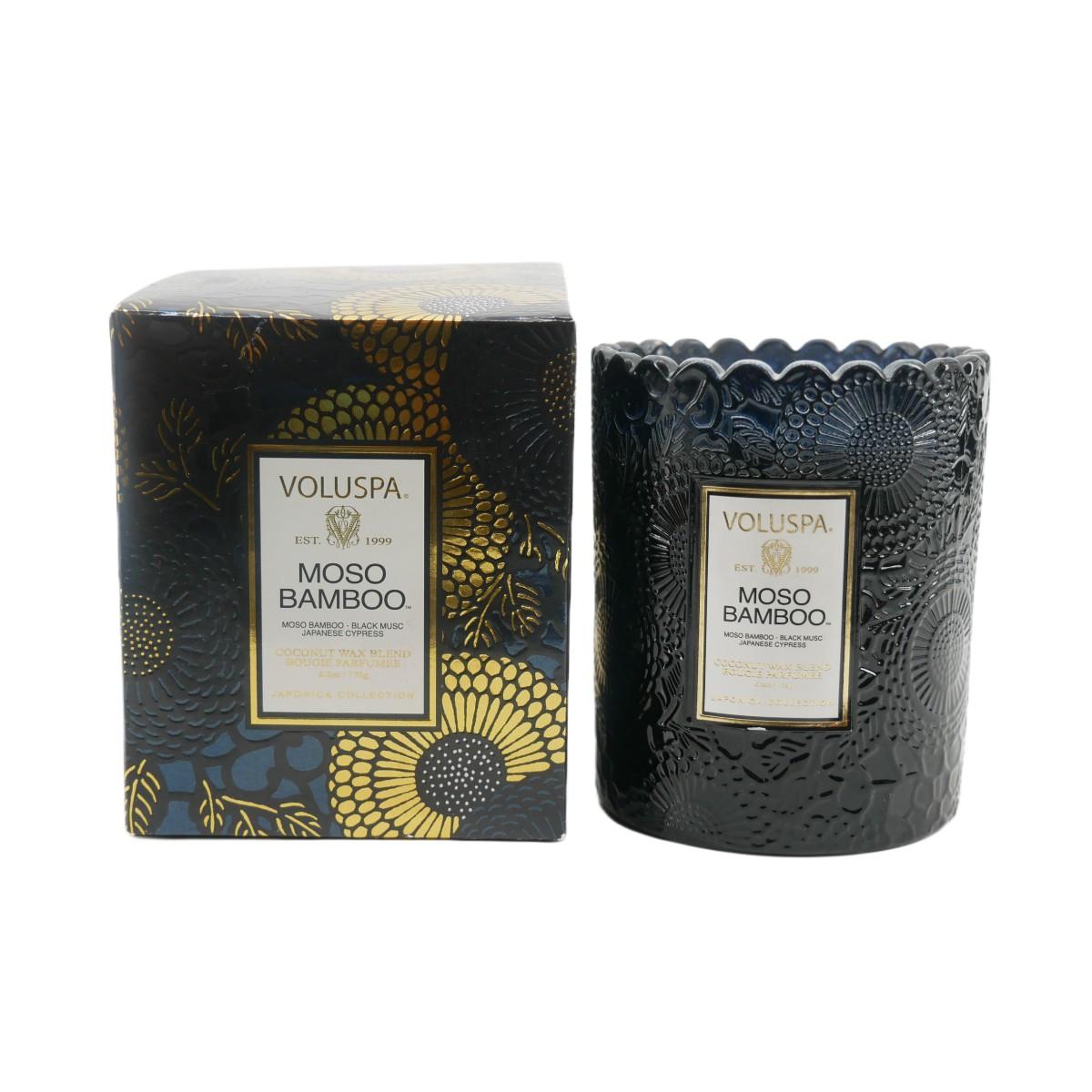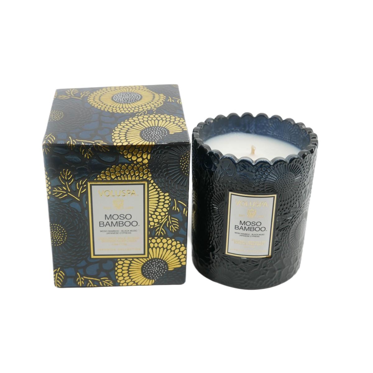 New in open box, Voluspa Moso Bamboo scalloped glass 6.2 oz candle. Coconut wax blend hand poured bougie parfumee candle. Fragrance notes: moso bamboo, black musc Japanese cypress.