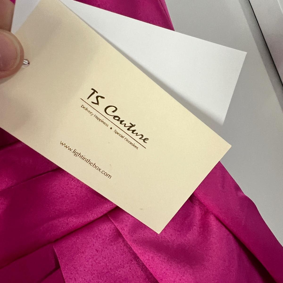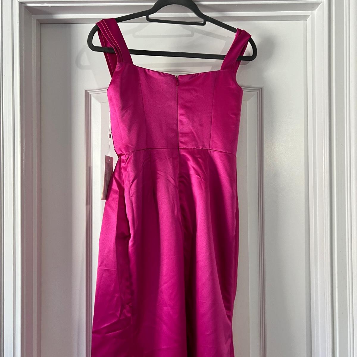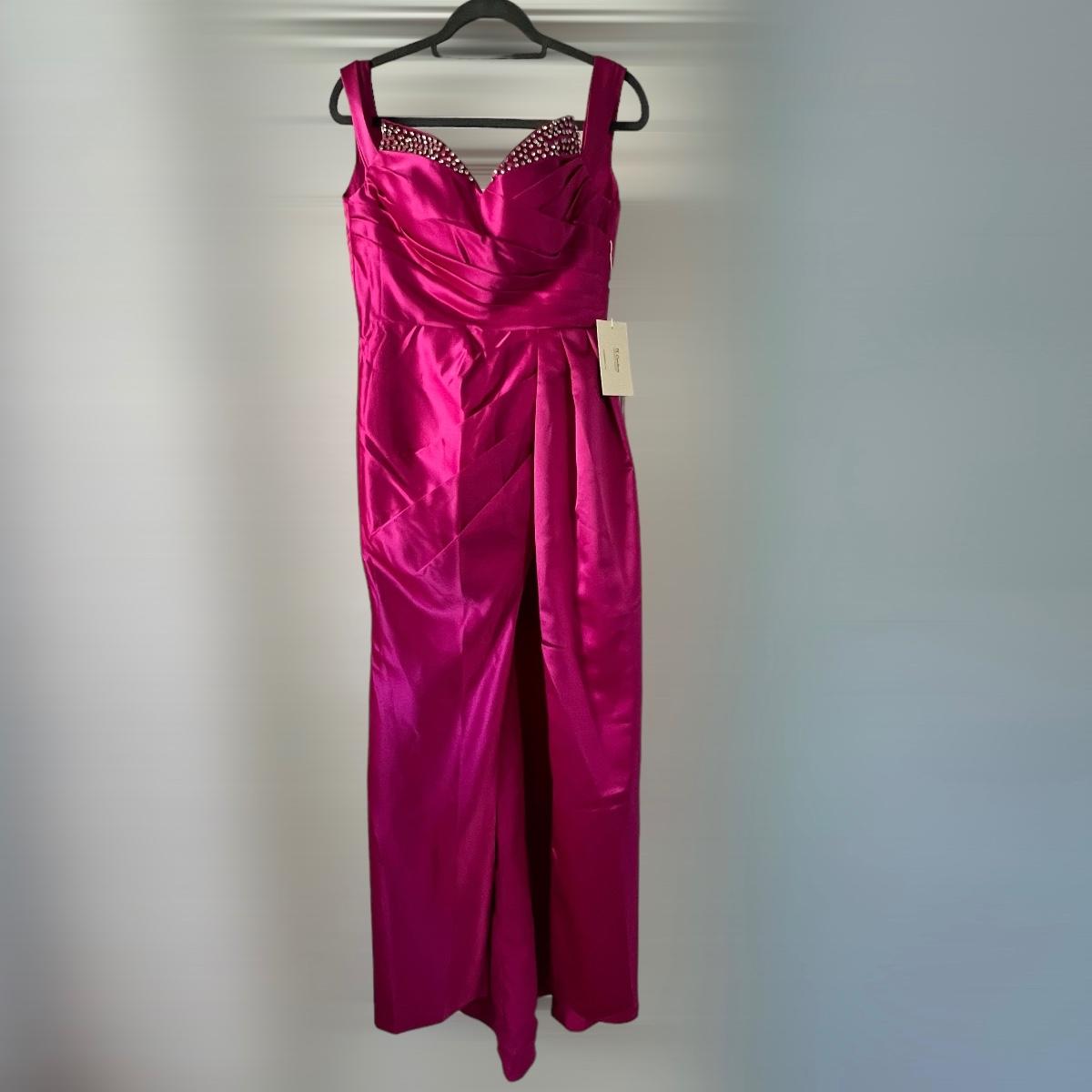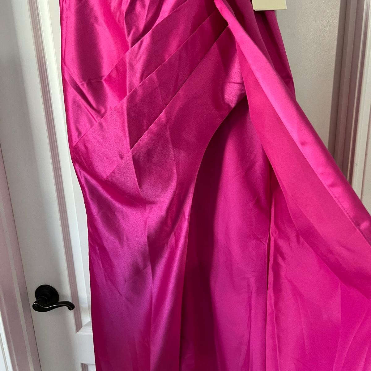 New with tags fuchsia gown with rhinestone trim. High slit, straight back with hidden zipper. Believed to be size small.