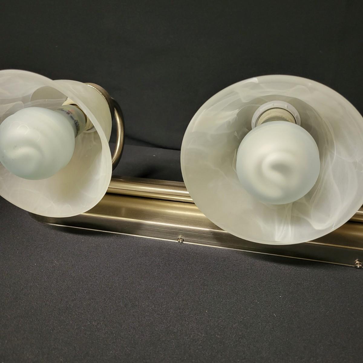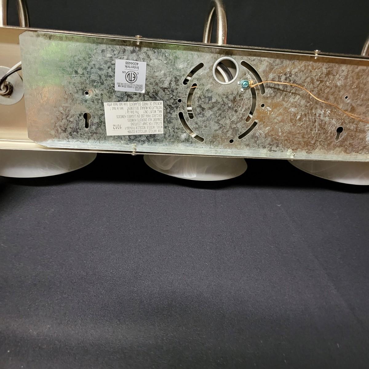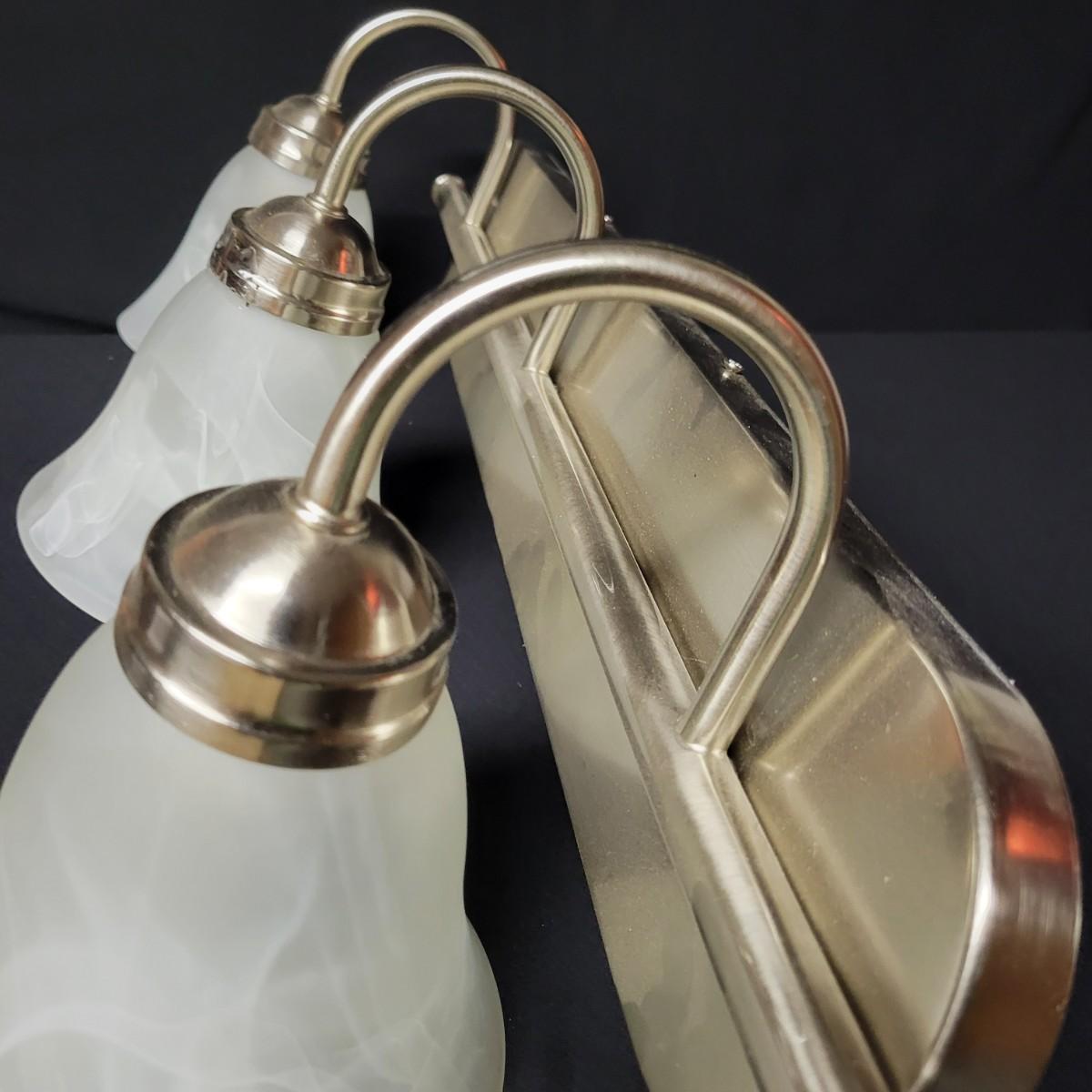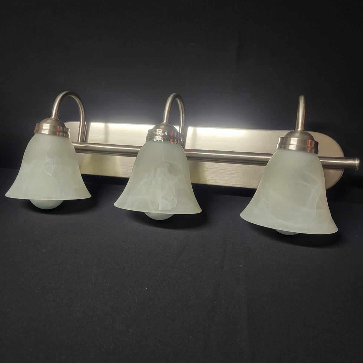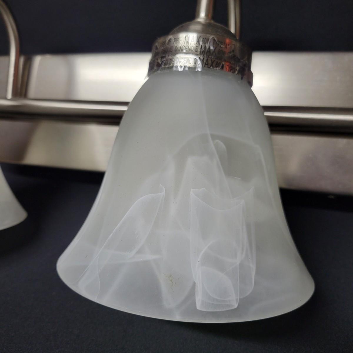 An unused wall mounted light in excellent condition. This item could not be tested, but is new and unused. Light features 3 bulbs, matte silver fixture with smoke white light covers. Fixture measures approximately 26" x 9" x 8"