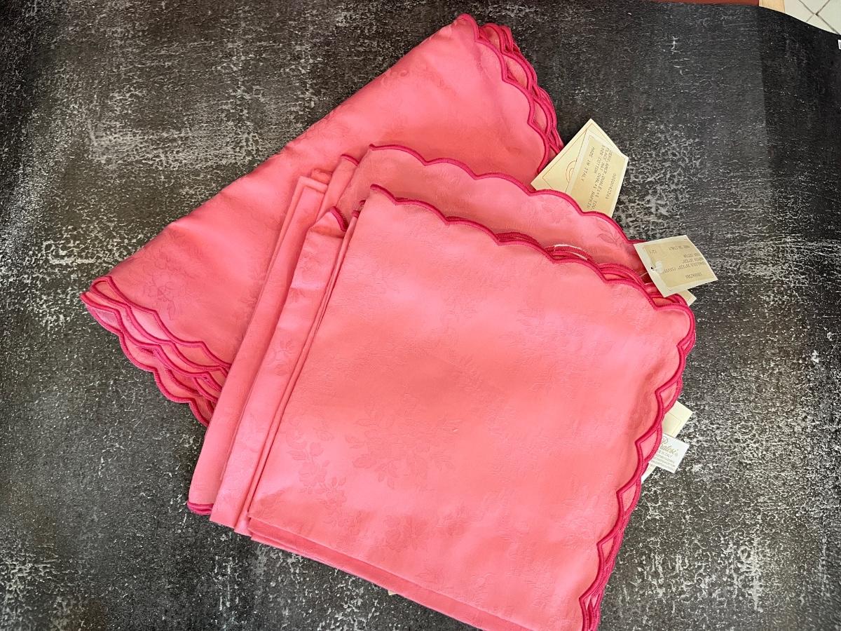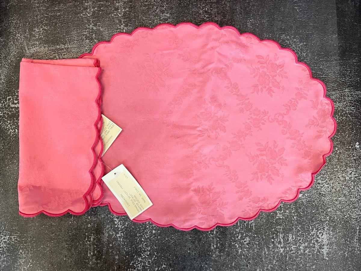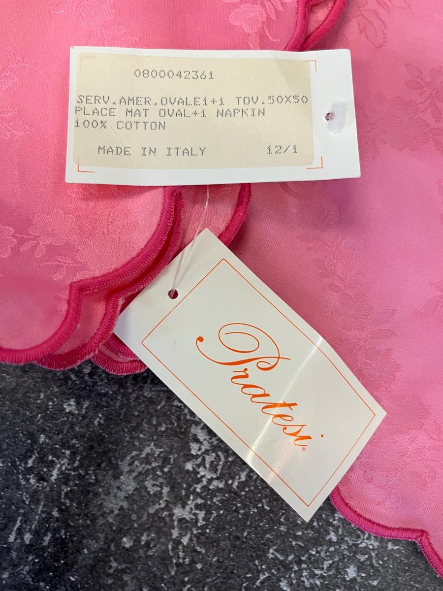 A set 12 placemats and napkins by Pratesi“”new with tags! The placemats and napkins are a delicious shade of raspberry pink with darker pink scalloped borders on a damask design of roses and garlands. Just in time for spring! This would make a beautiful Easter table.