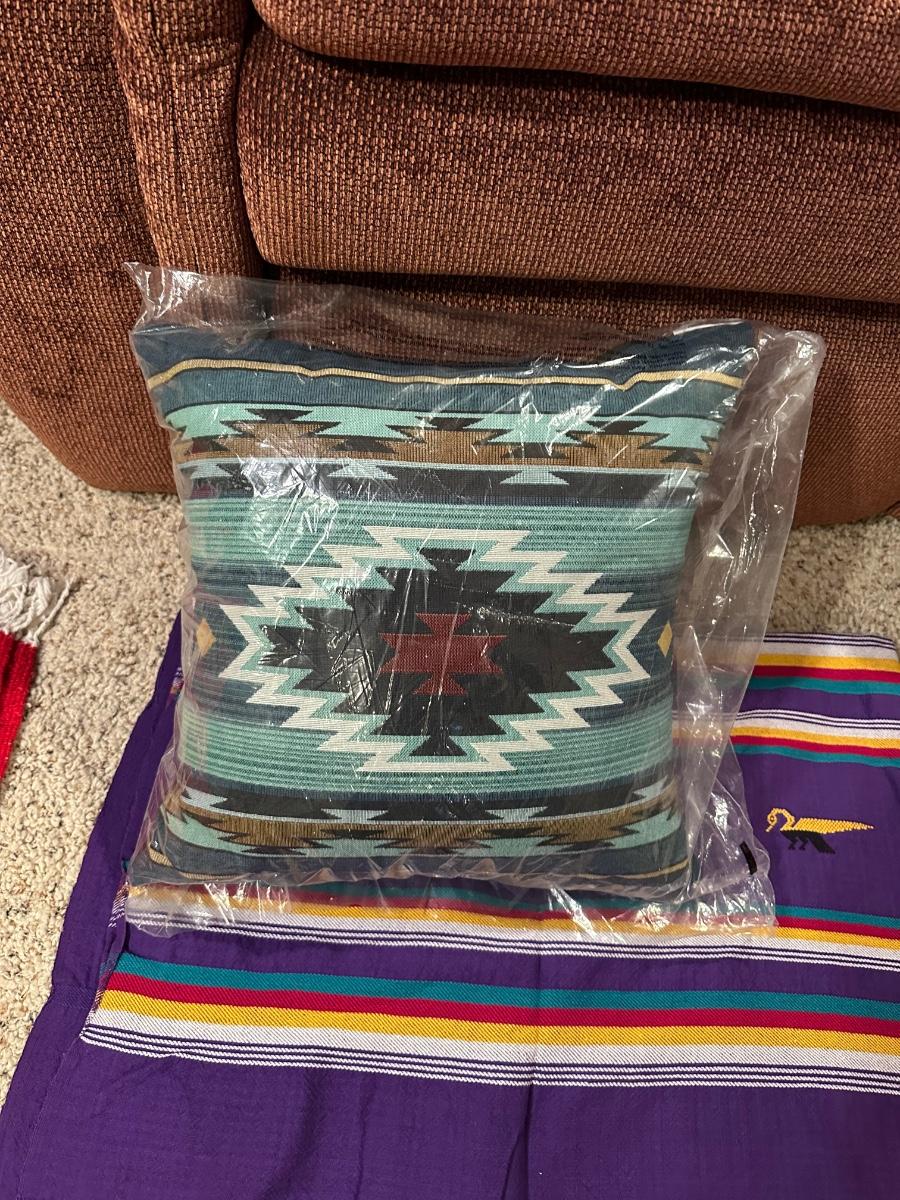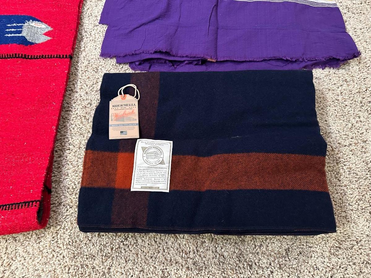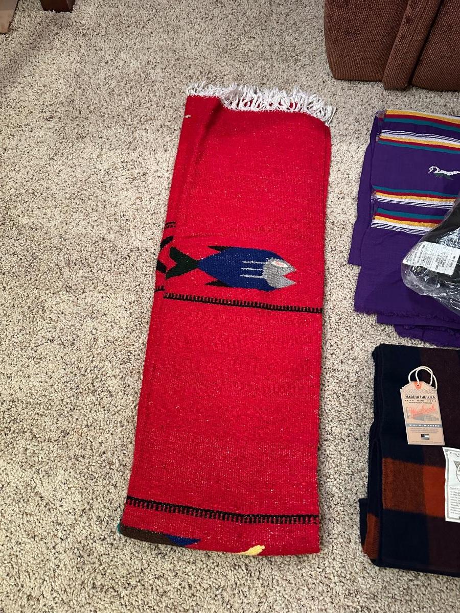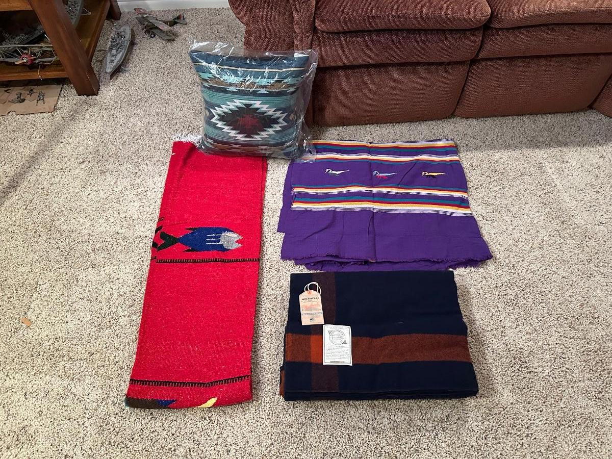 NEW WOOLRICH WOOL THROW, 2 MEXICAN SARAPES AND A NEW THROW PILLOW
