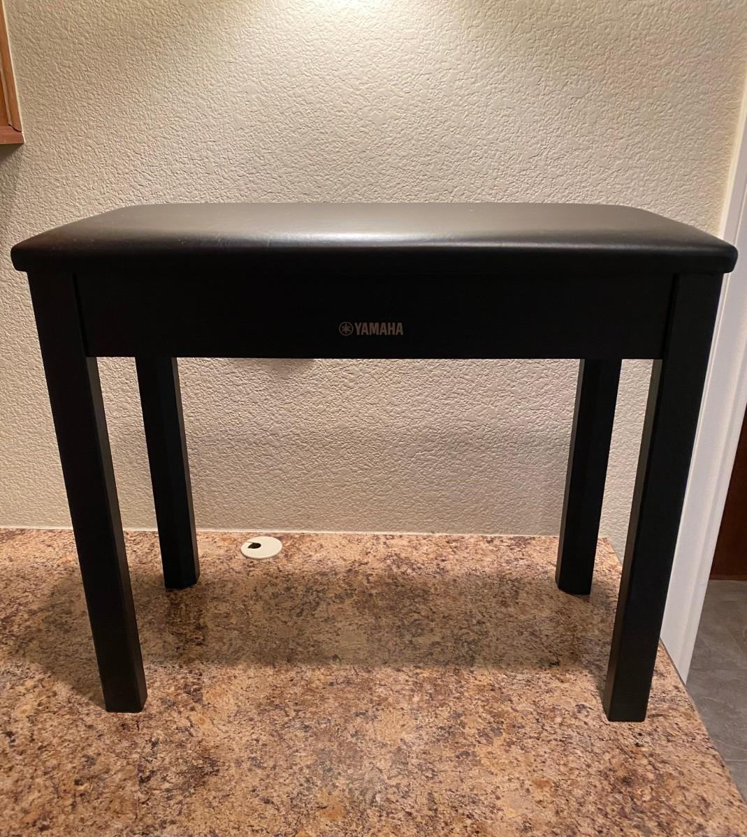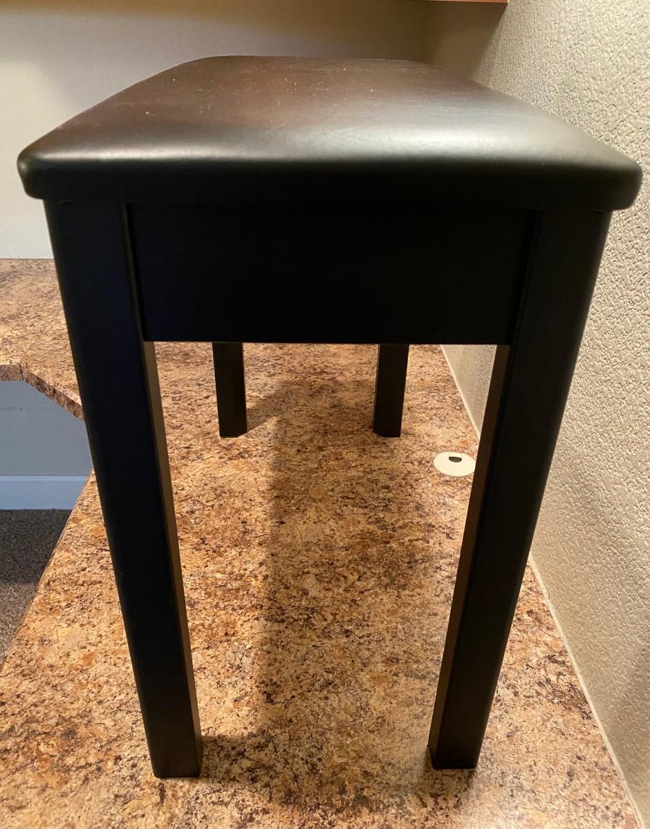 Black padded seat, black wood base. Excellent condition. 19 inches tall by 12 inches wide by 23.5 inches long