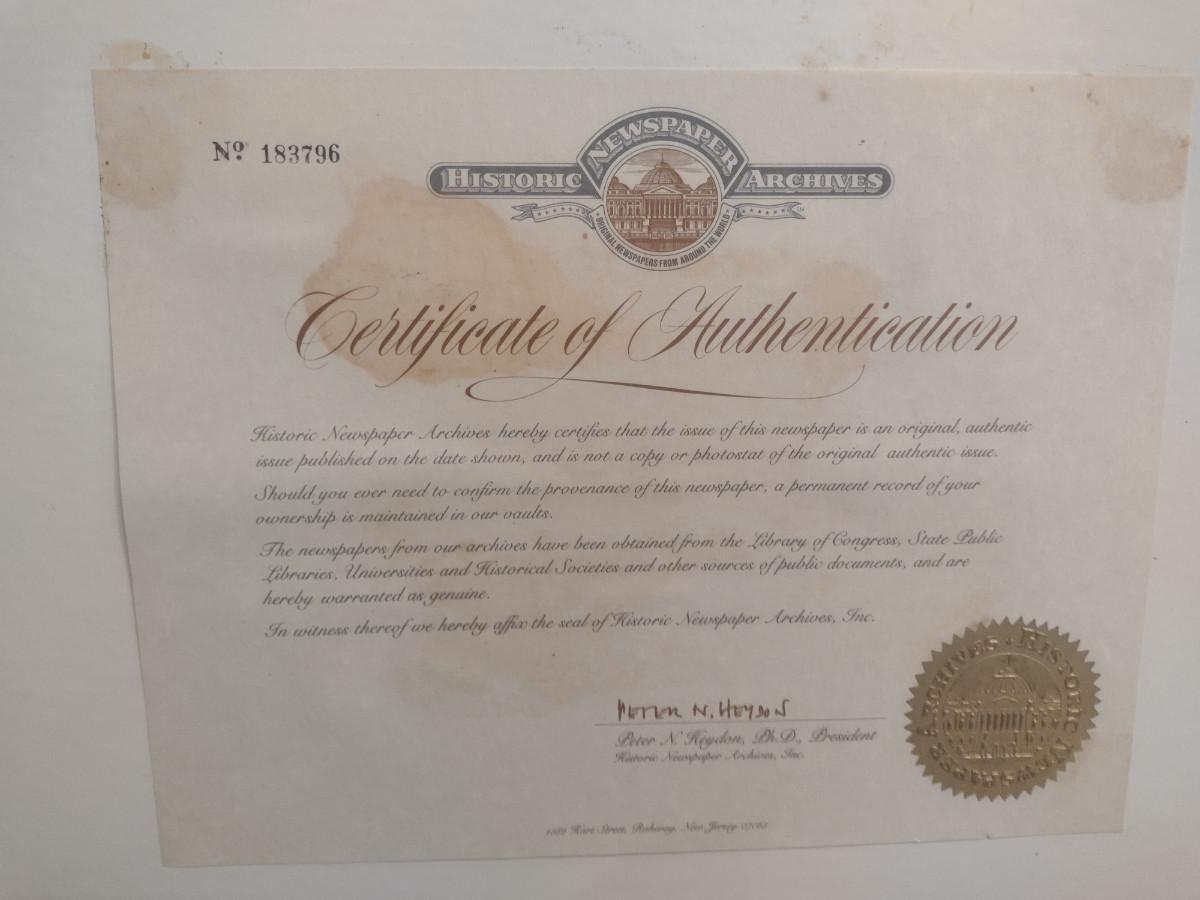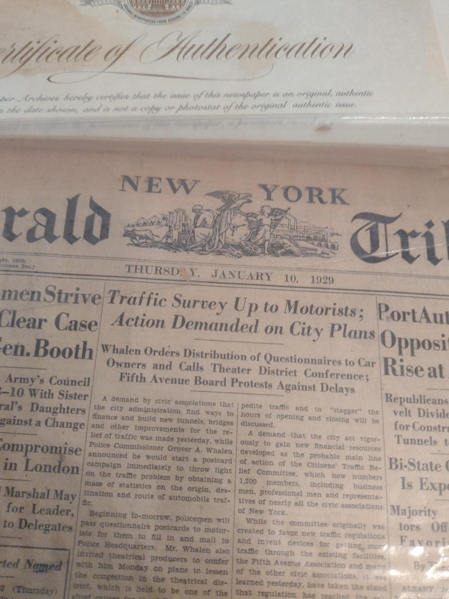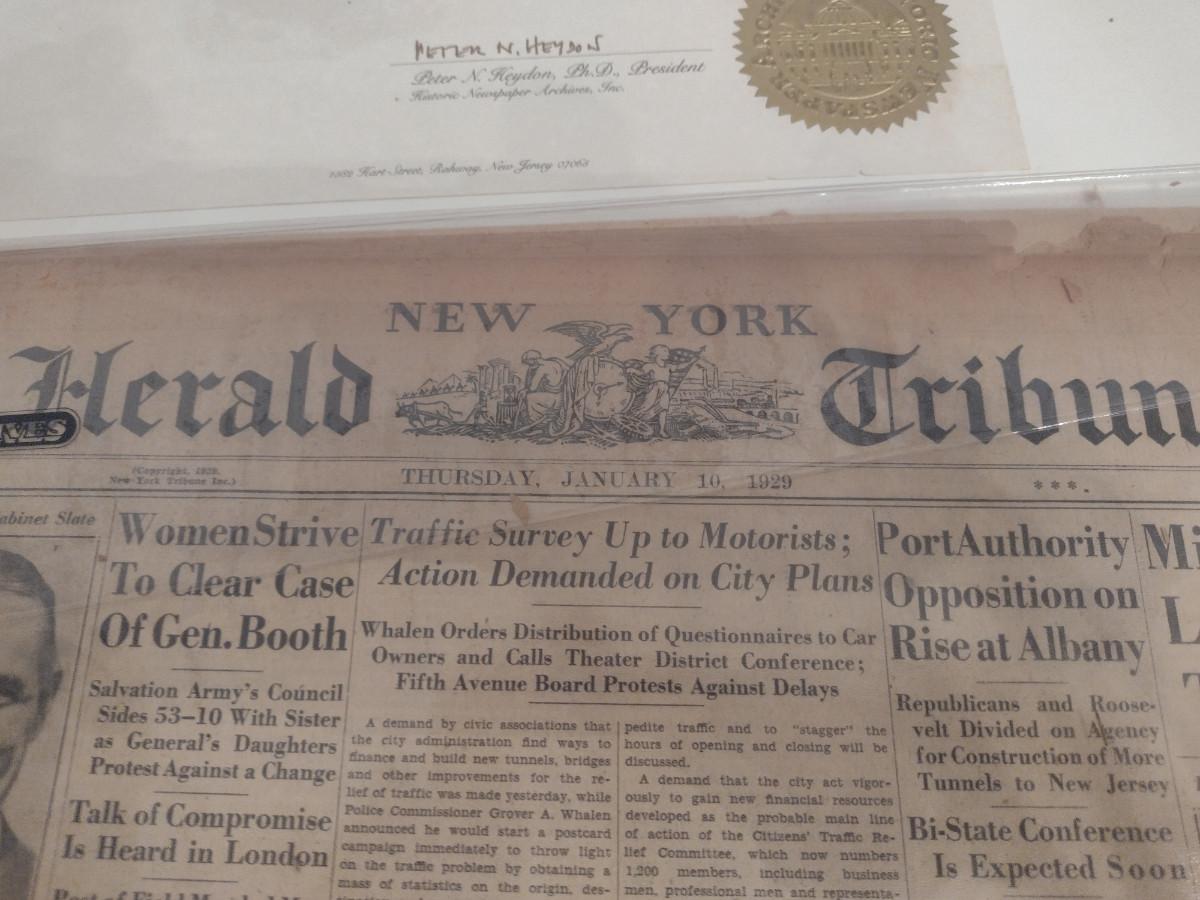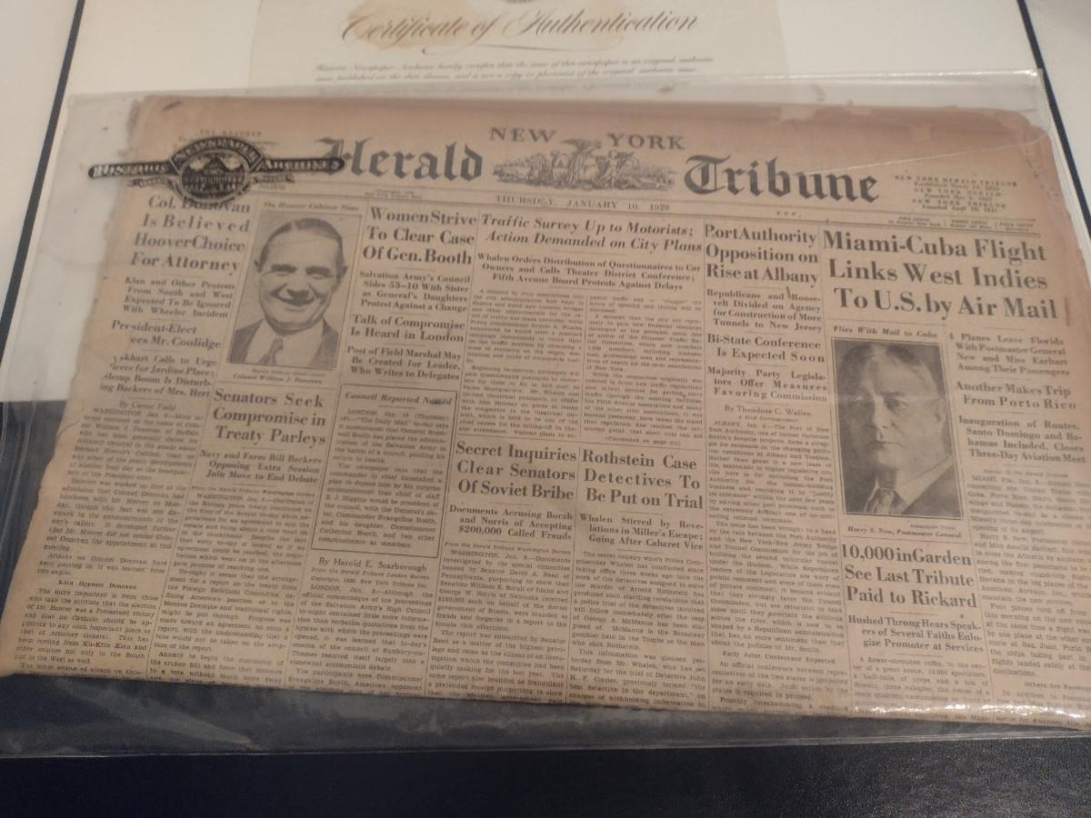 New York Herald Tribune Issue January 10, 1929 with COA. Comes with monogrammed portfolio case for storage.