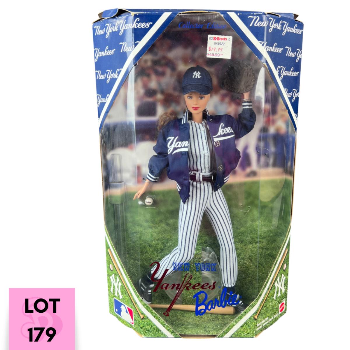 Barbie is gonna throw out the first pitch at the season opener this year! This doll, in classic New York Yankees pinstripes, was produced by Mattel in 1999. This doll has not been out of its box. The box does have some wear, and doesn't stand particularly well. **|** Please see photos for details and condition. ::: Shipping is available on this lot. If you require shipping you must let us know at the close of the auction. We will coordinate with you after the item has been won. Shipping fees will include insurance up to or exceeding the value of all items being mailed. If you have any questions regarding this lot please contact the auctioneer either via this website, by direct email or by phone. PICK UP TIMES and other important information can be found in the TERMS and DESCRIPTION of the auction. Please take a look for pertinent information. Thanks!