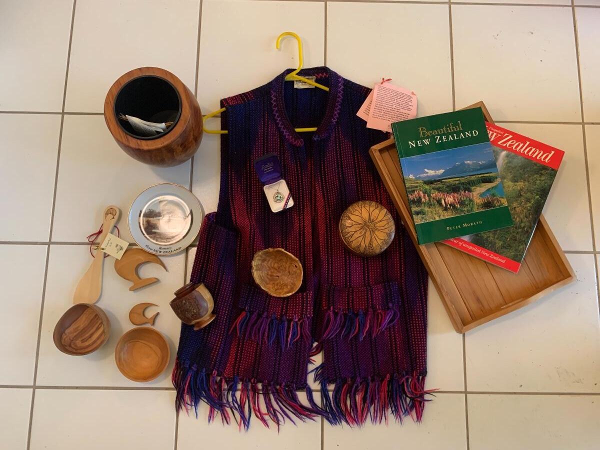 Rimu Timber Wood, Turned Bowls, NZ Souviner Items, Ariki Paua Shell Palladium Plate Necklace, Travel Books, and Wool Vest.