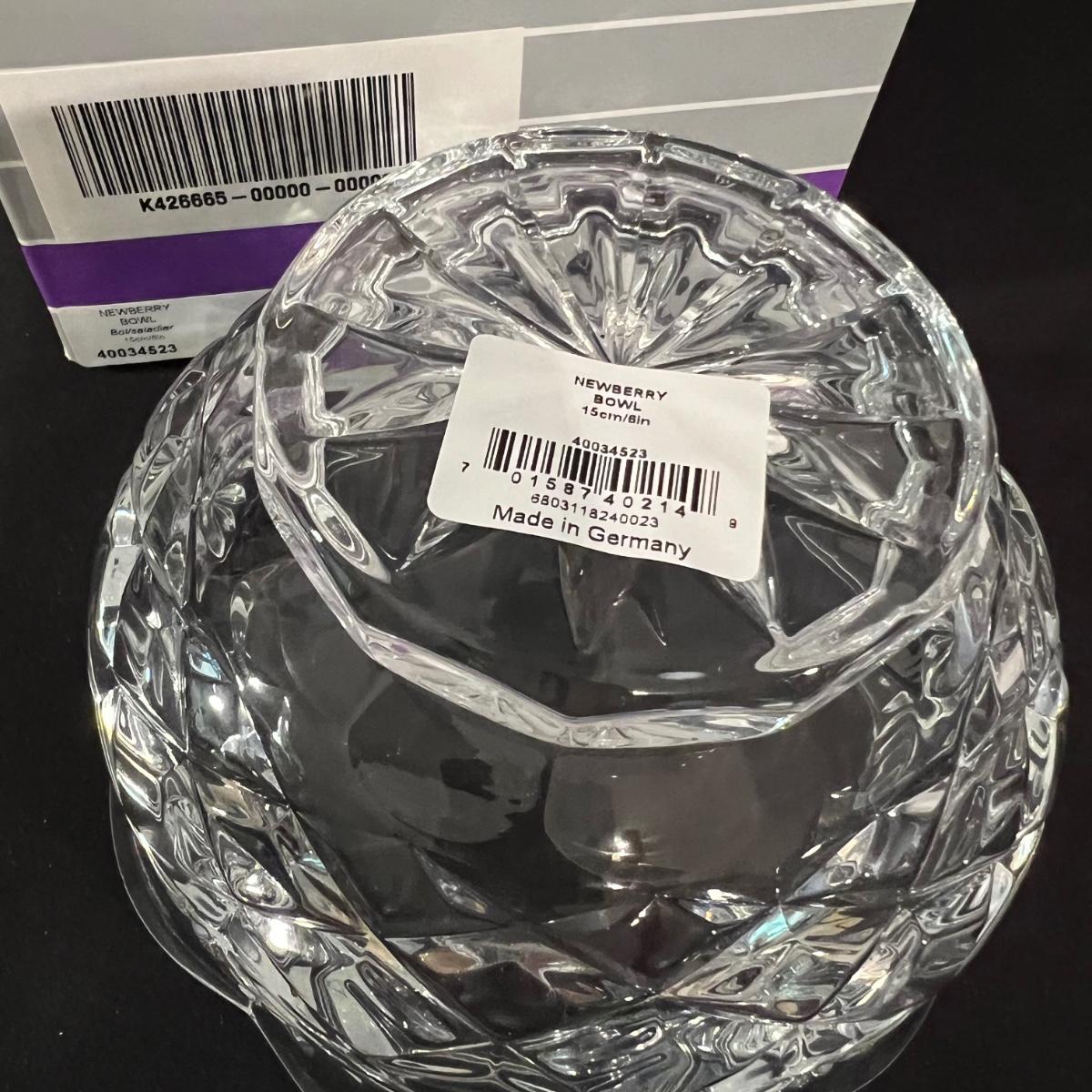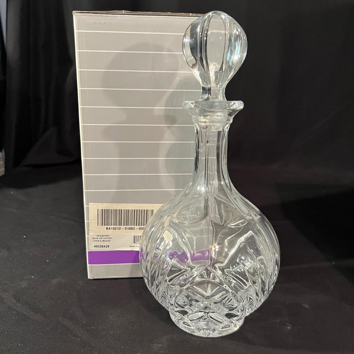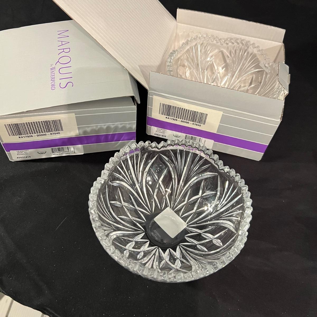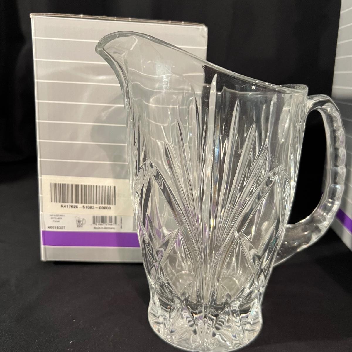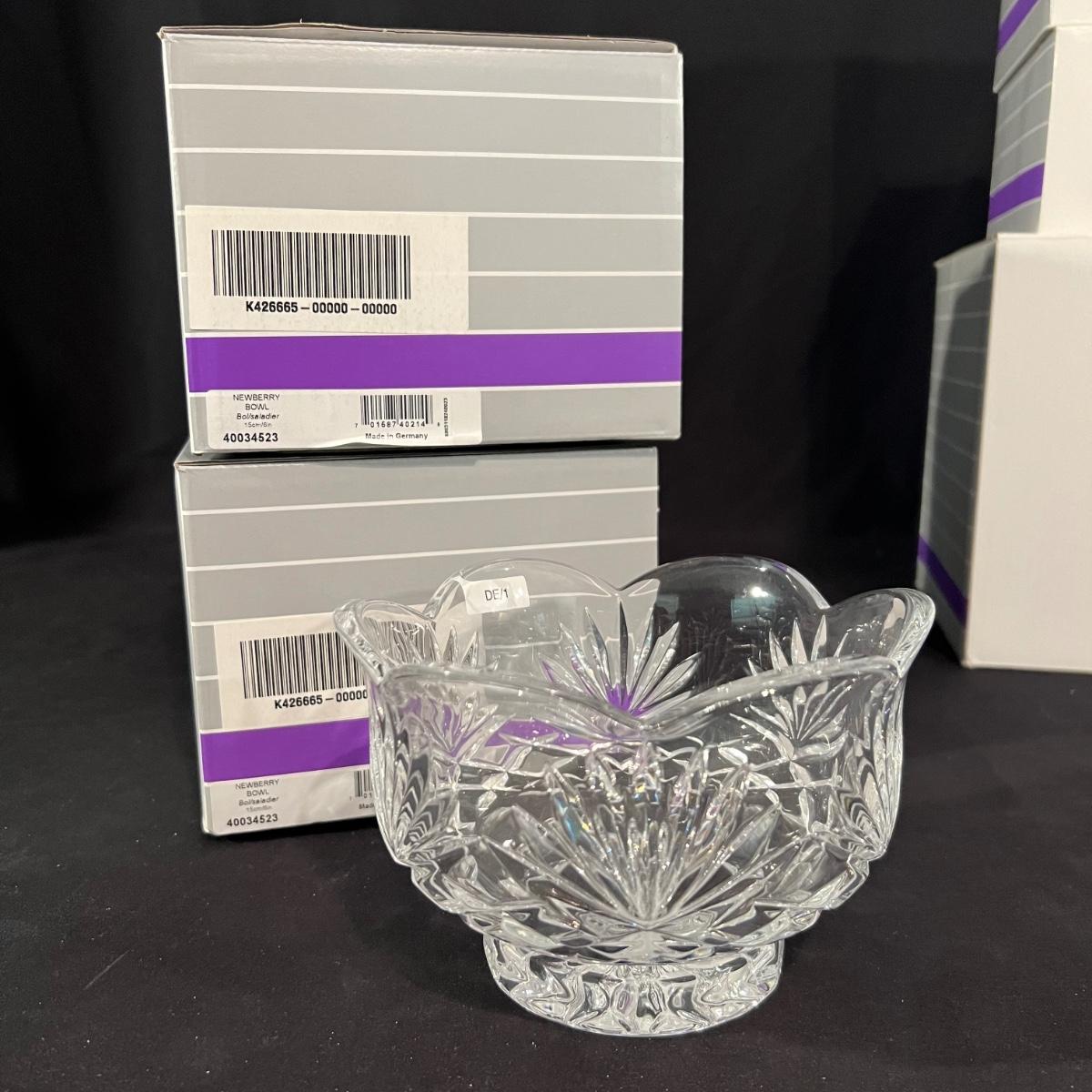 Over 35 pieces of Waterford crystal in their Newberry pattern. Lot includes pitcher, decanter, bowls, tumbler and iced beverage glasses plus more. Most items appear to be new in box; decanter and pitcher were not stored in their boxes and were out on display. See images for sizes and full inventory and note that there are duplicates of some items. The iced beverage and tumbler glasses are in packs of 6 and there are a total of 12 of each.