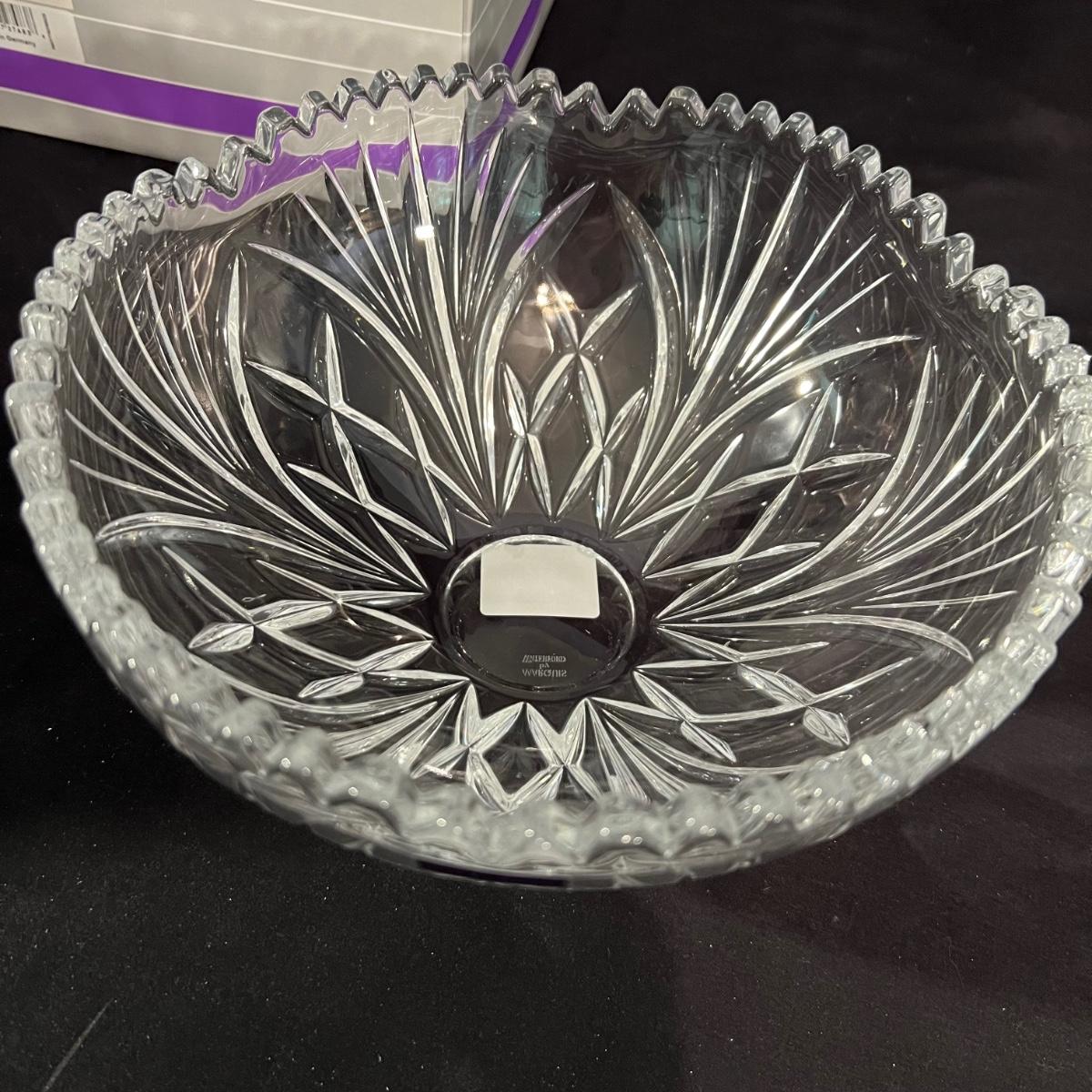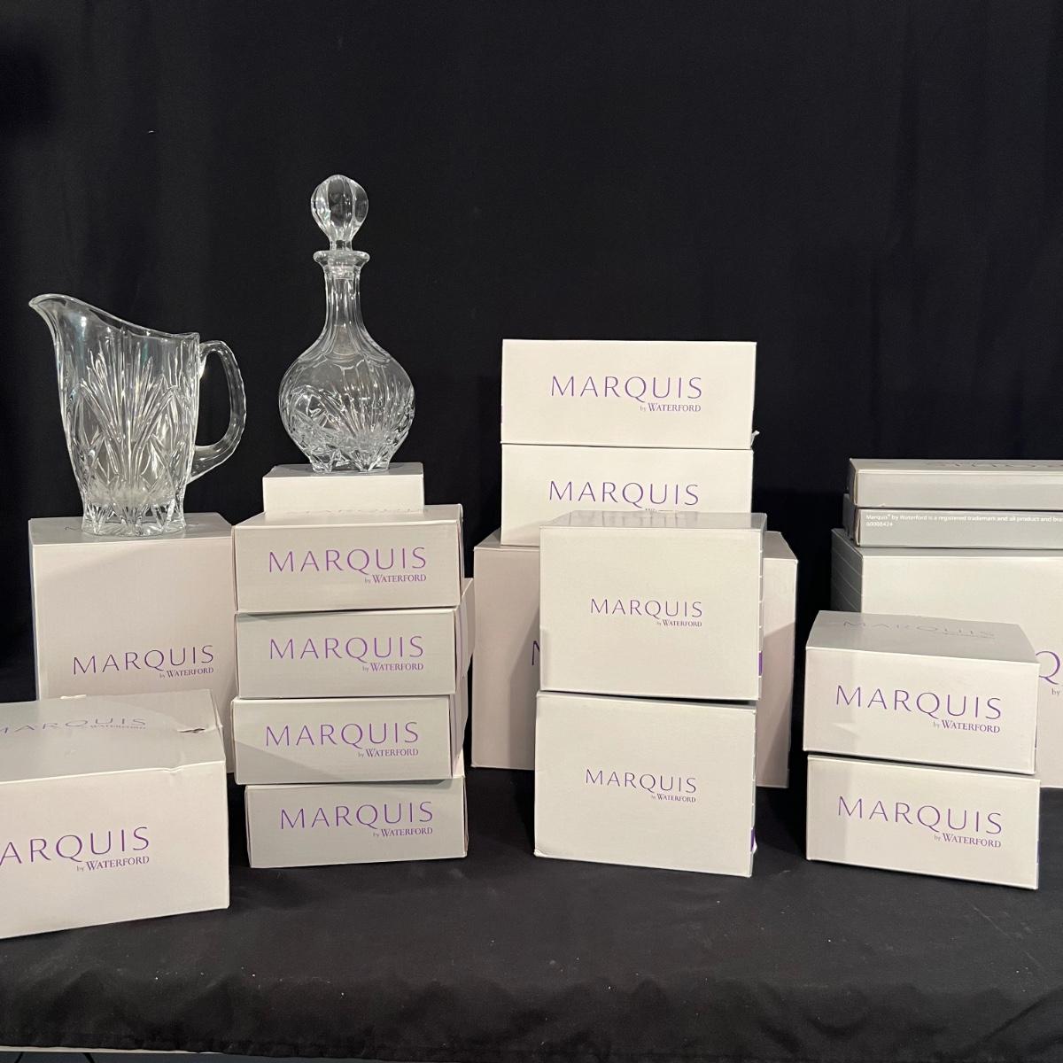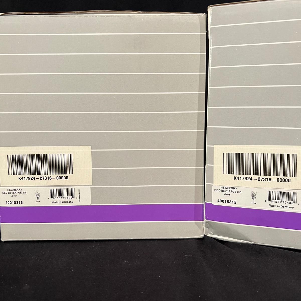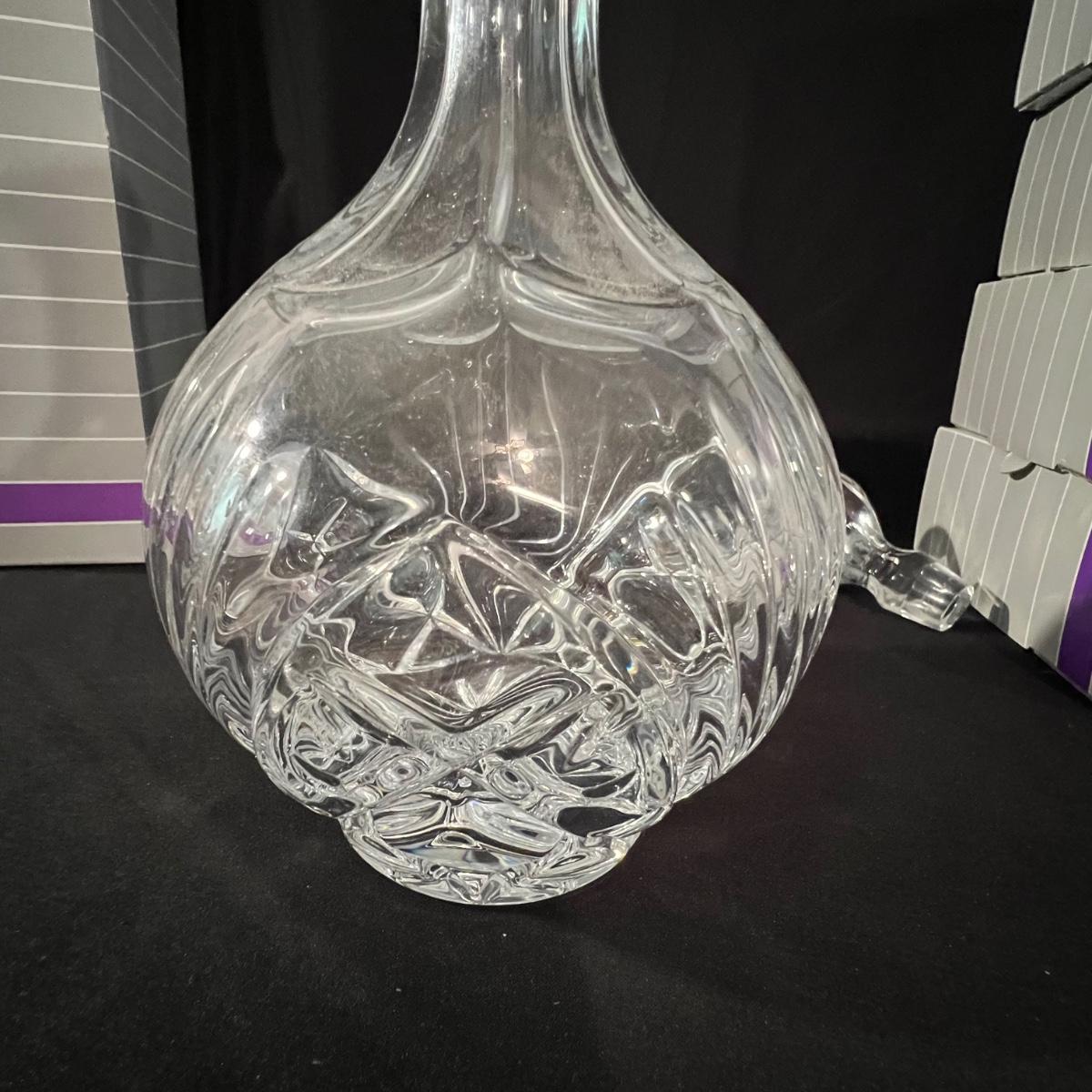 Over 35 pieces of Waterford crystal in their Newberry pattern. Lot includes pitcher, decanter, bowls, tumbler and iced beverage glasses plus more. Most items appear to be new in box; decanter and pitcher were not stored in their boxes and were out on display. See images for sizes and full inventory and note that there are duplicates of some items. The iced beverage and tumbler glasses are in packs of 6 and there are a total of 12 of each.