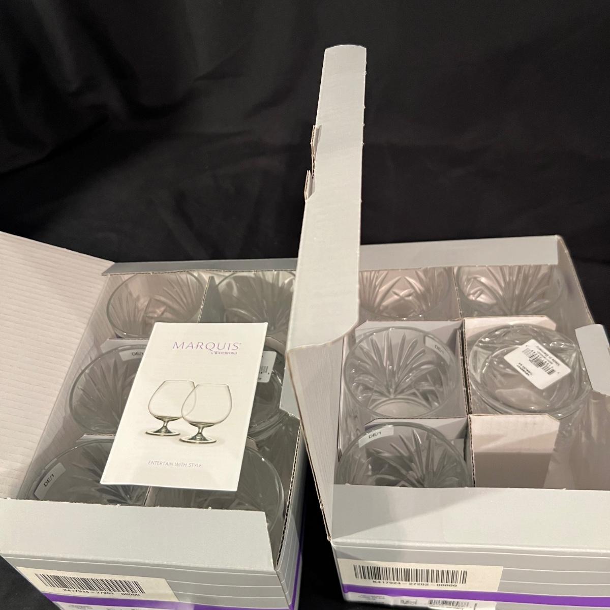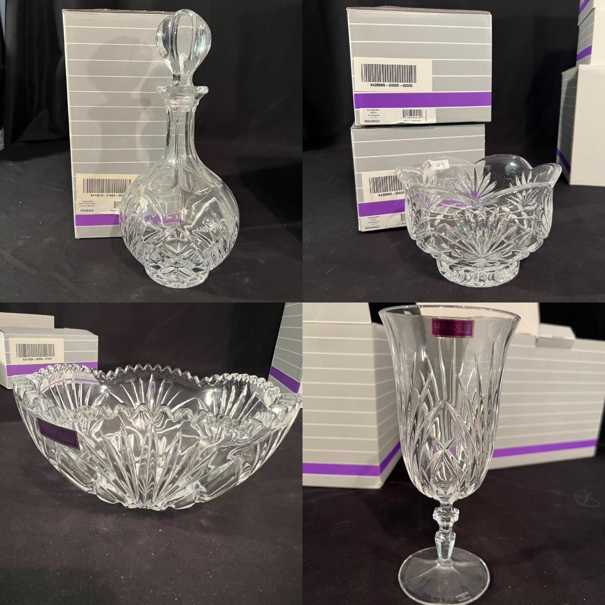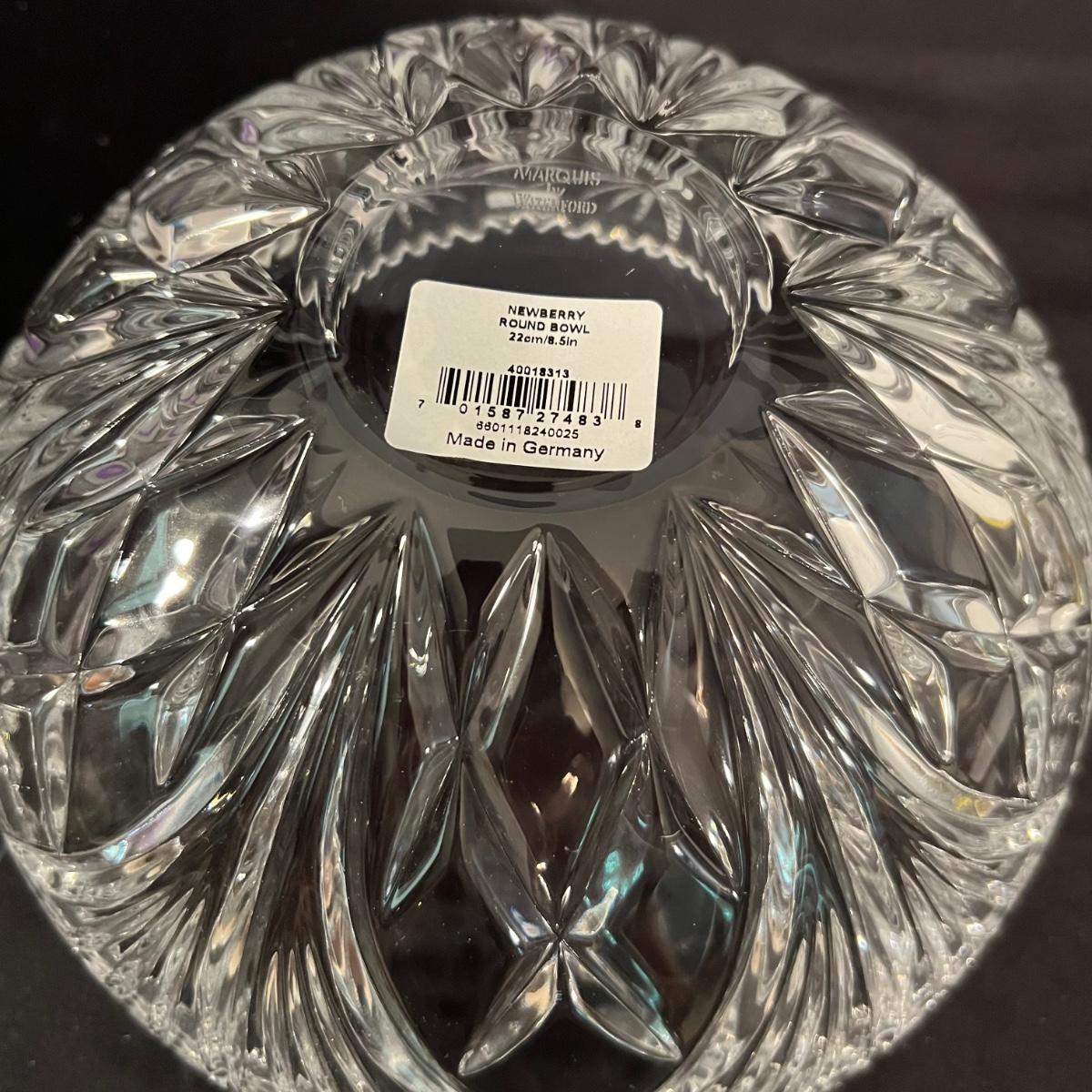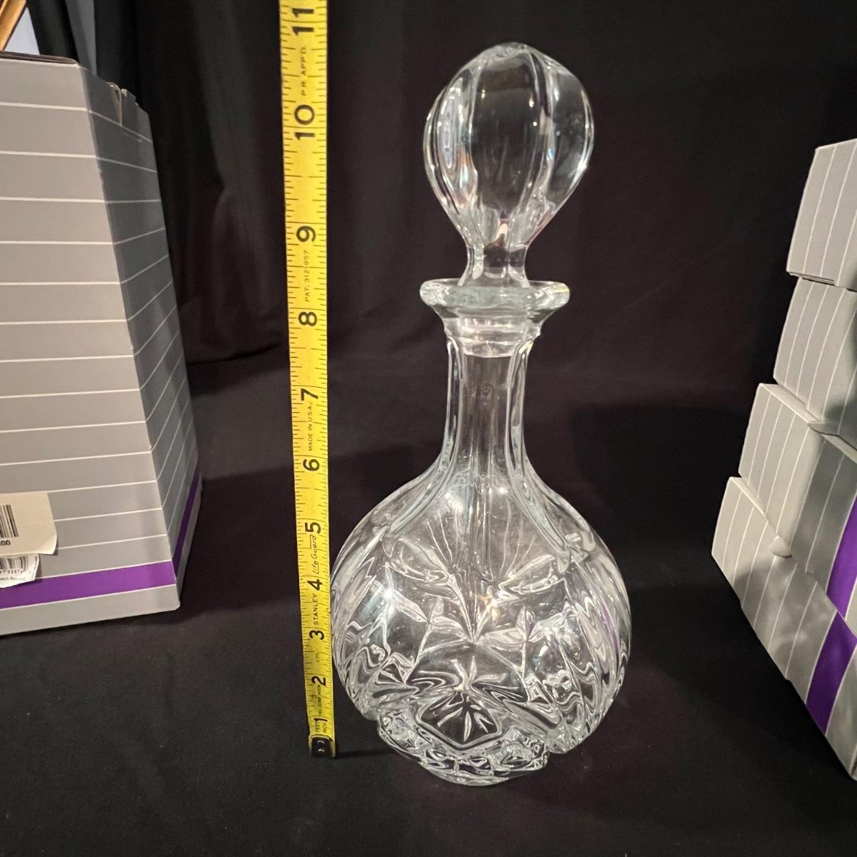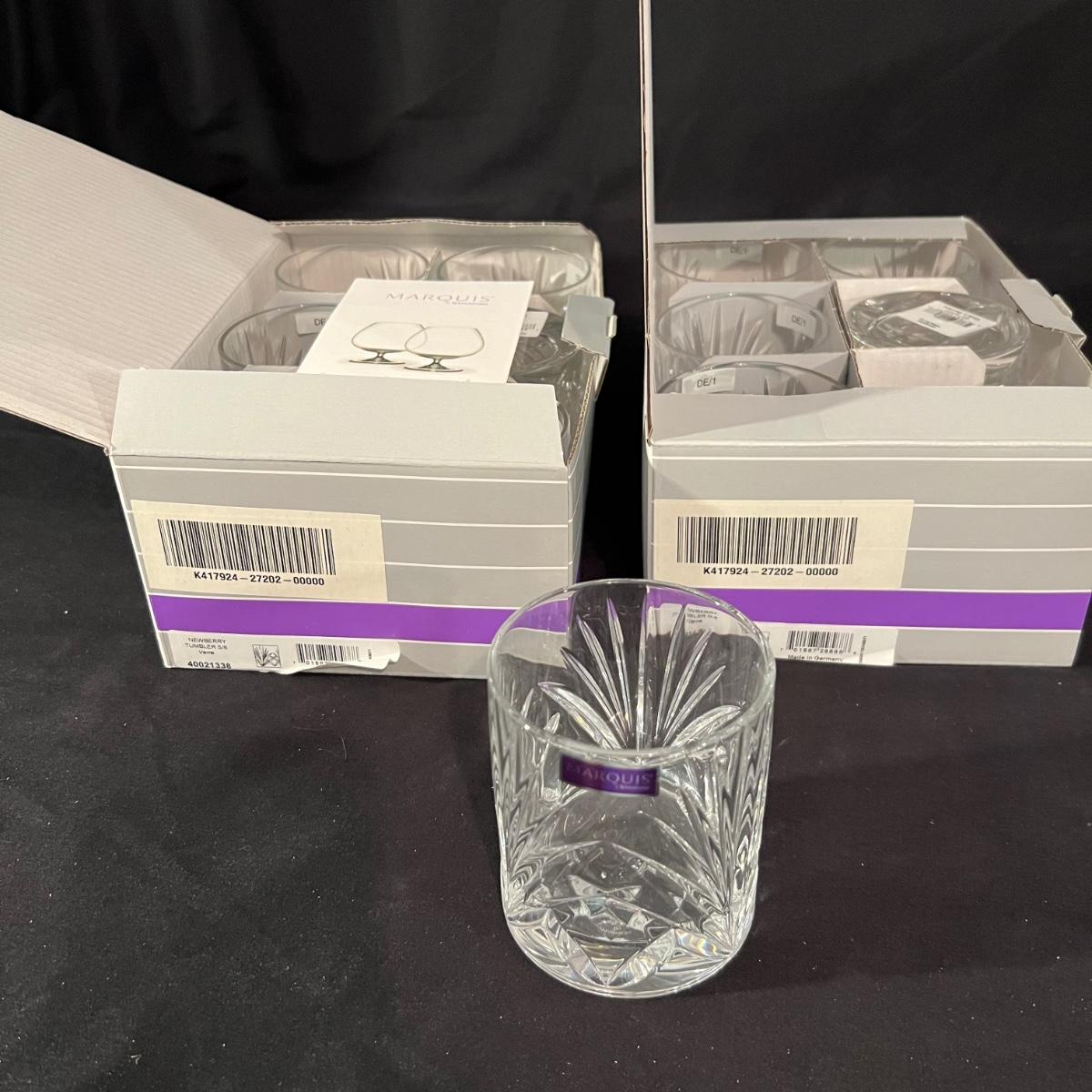 Over 35 pieces of Waterford crystal in their Newberry pattern. Lot includes pitcher, decanter, bowls, tumbler and iced beverage glasses plus more. Most items appear to be new in box; decanter and pitcher were not stored in their boxes and were out on display. See images for sizes and full inventory and note that there are duplicates of some items. The iced beverage and tumbler glasses are in packs of 6 and there are a total of 12 of each.