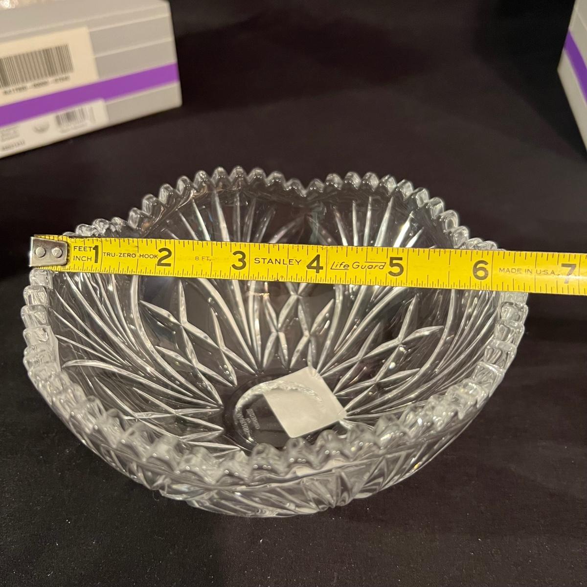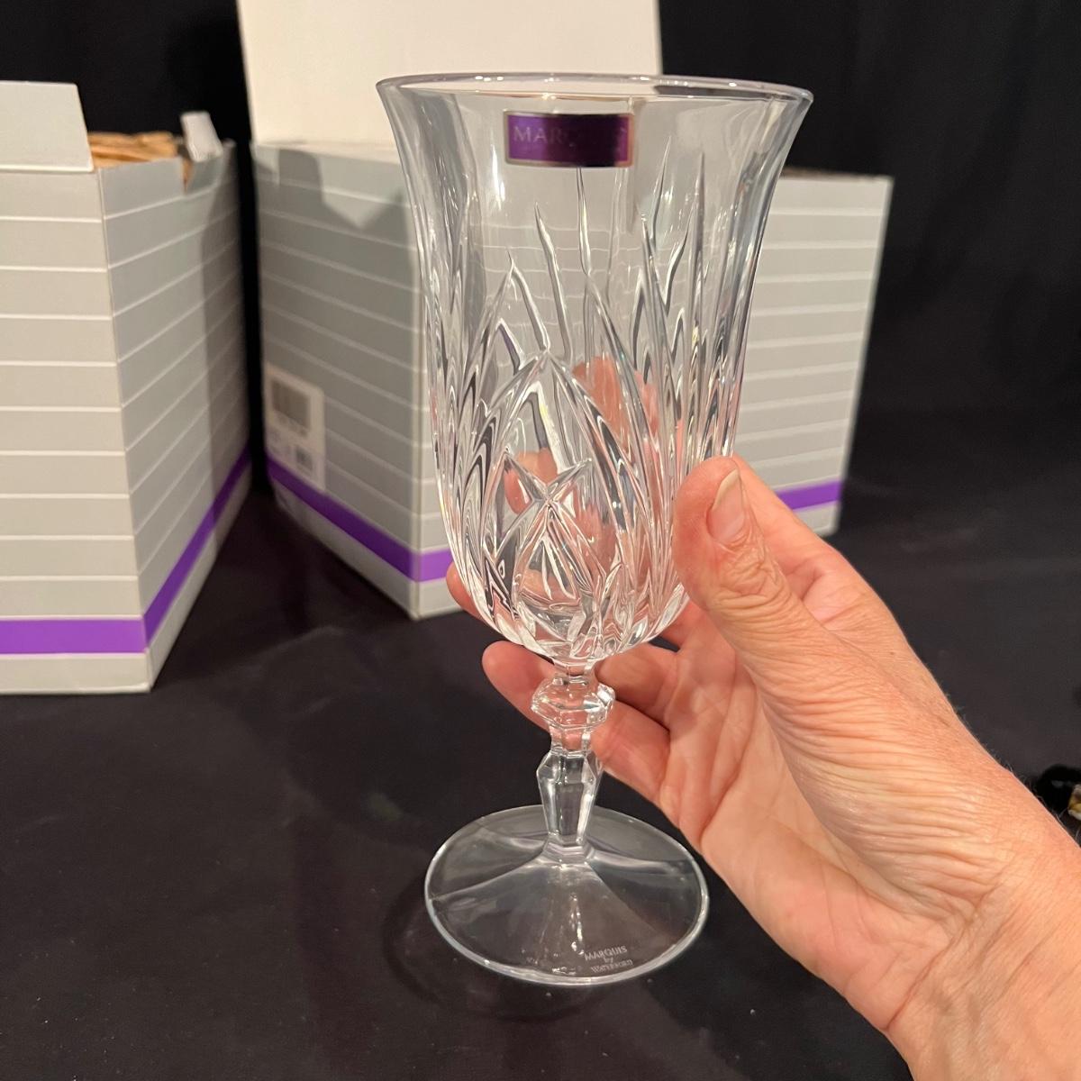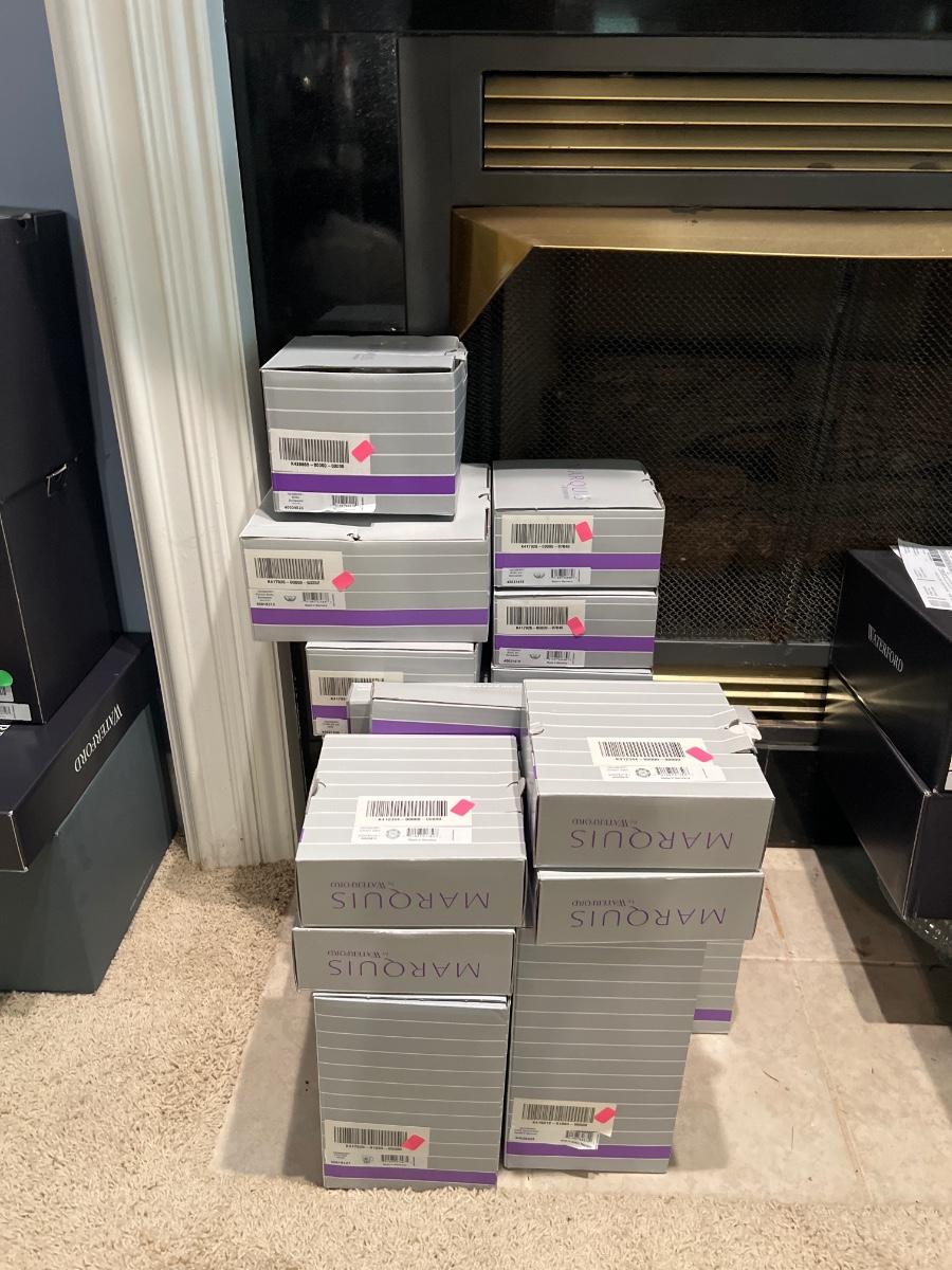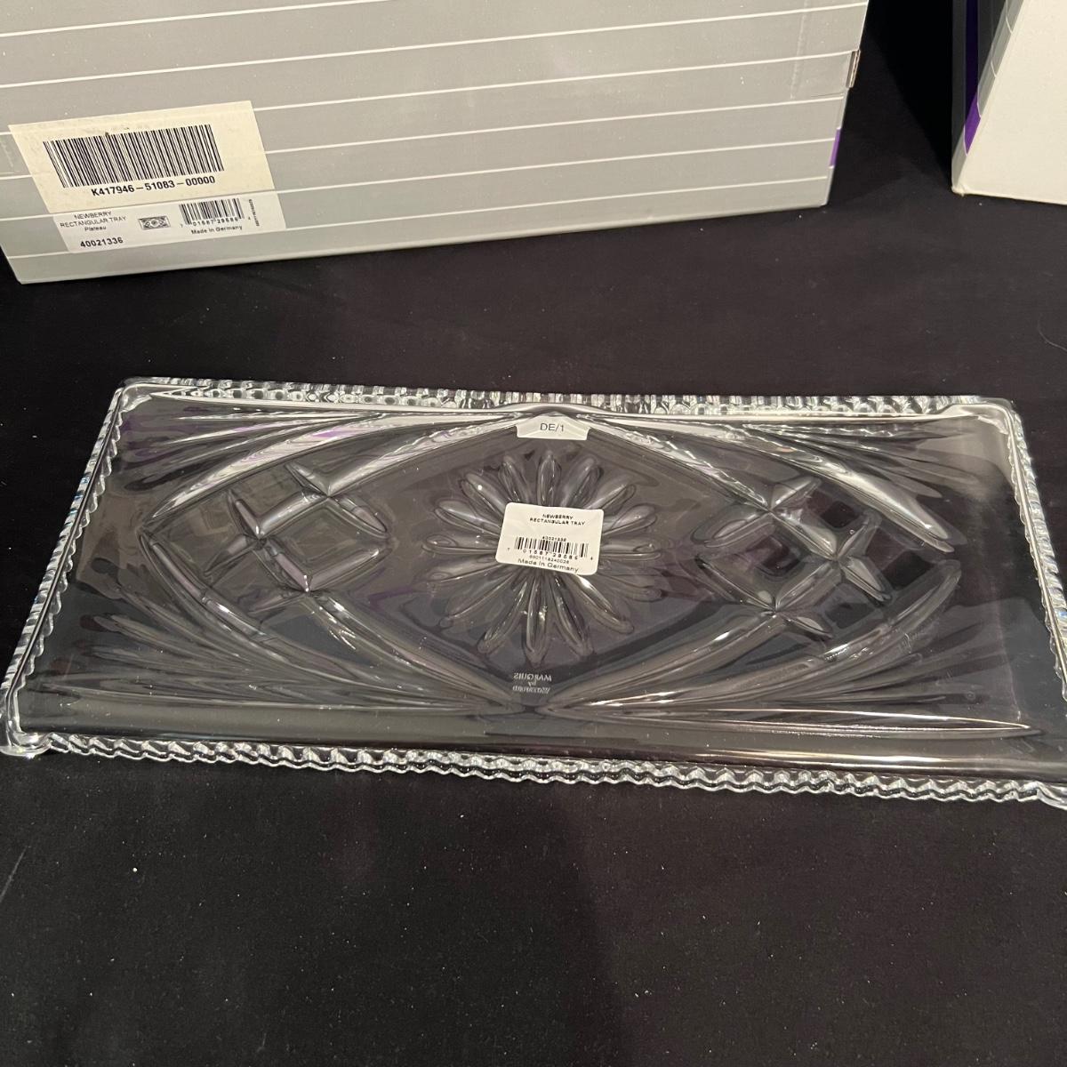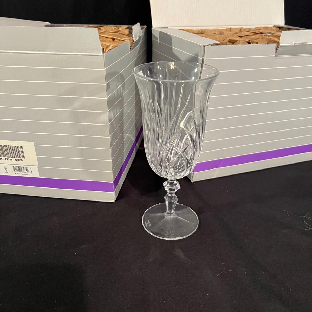 Over 35 pieces of Waterford crystal in their Newberry pattern. Lot includes pitcher, decanter, bowls, tumbler and iced beverage glasses plus more. Most items appear to be new in box; decanter and pitcher were not stored in their boxes and were out on display. See images for sizes and full inventory and note that there are duplicates of some items. The iced beverage and tumbler glasses are in packs of 6 and there are a total of 12 of each.