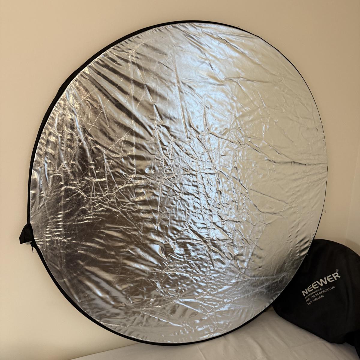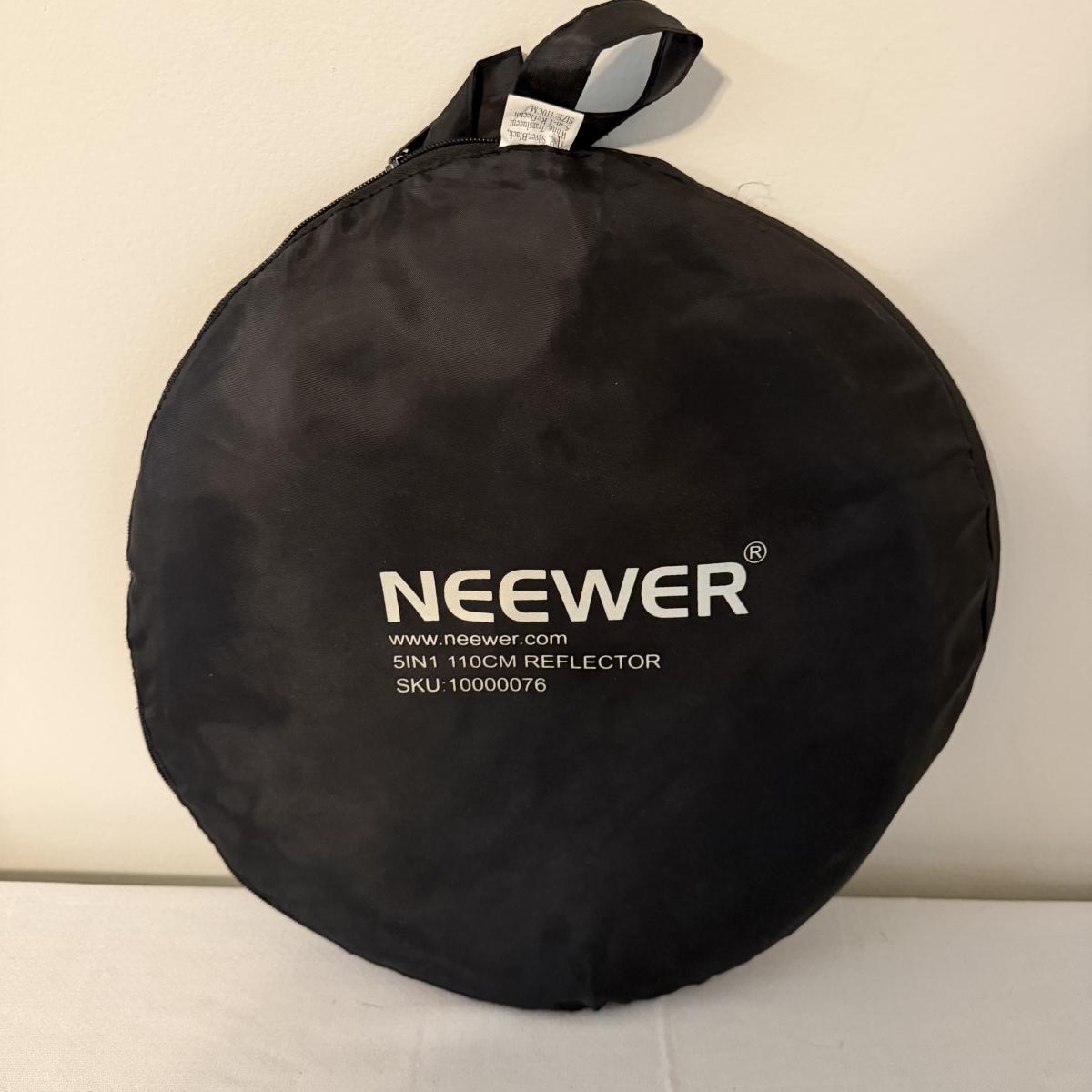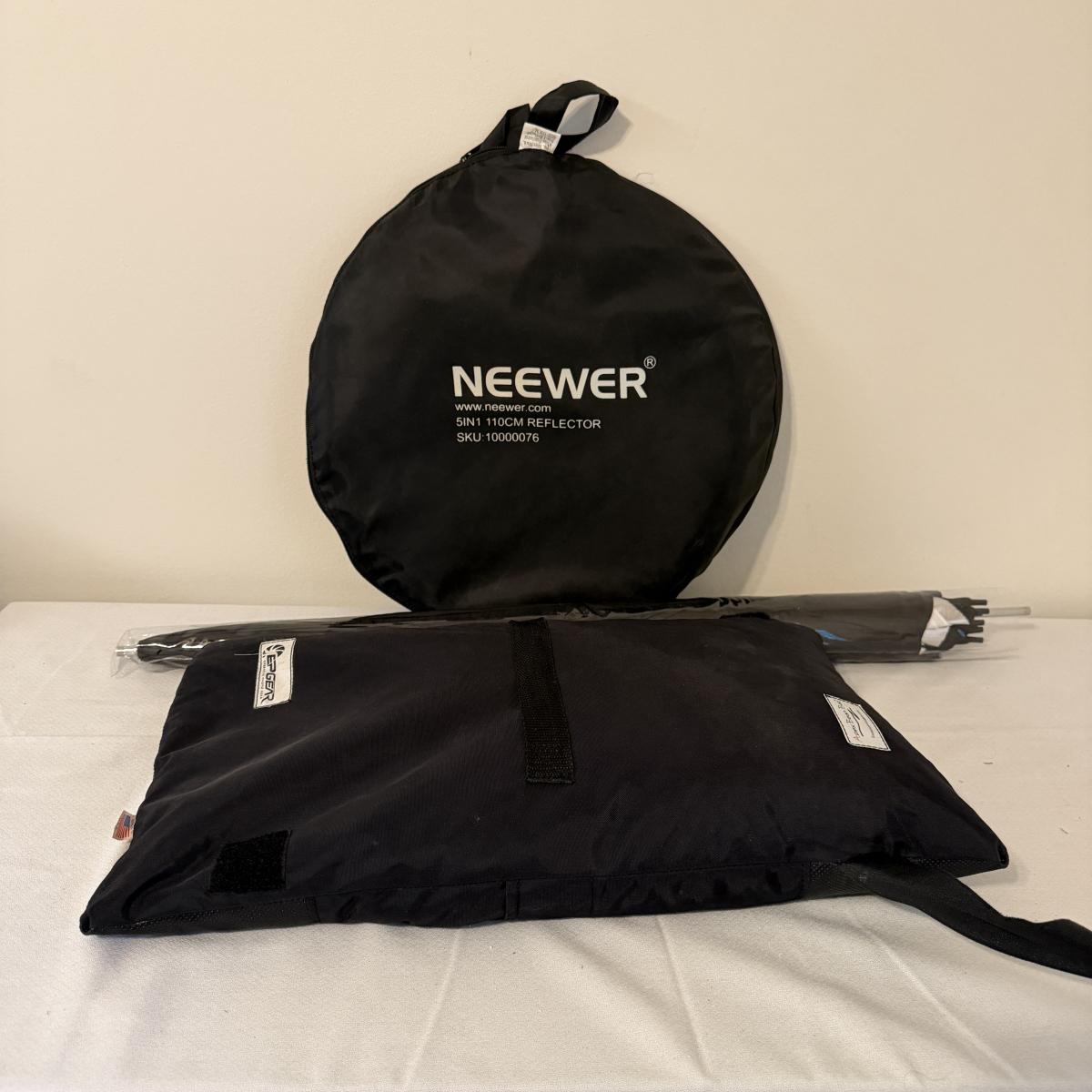 Lot includes a Neewer five in one 43”D reflector, Apex bean bag and a 46”D studio umbrella.