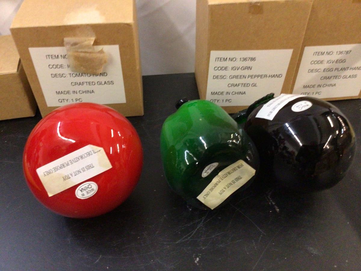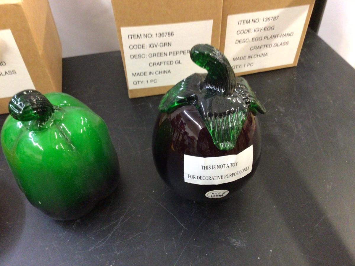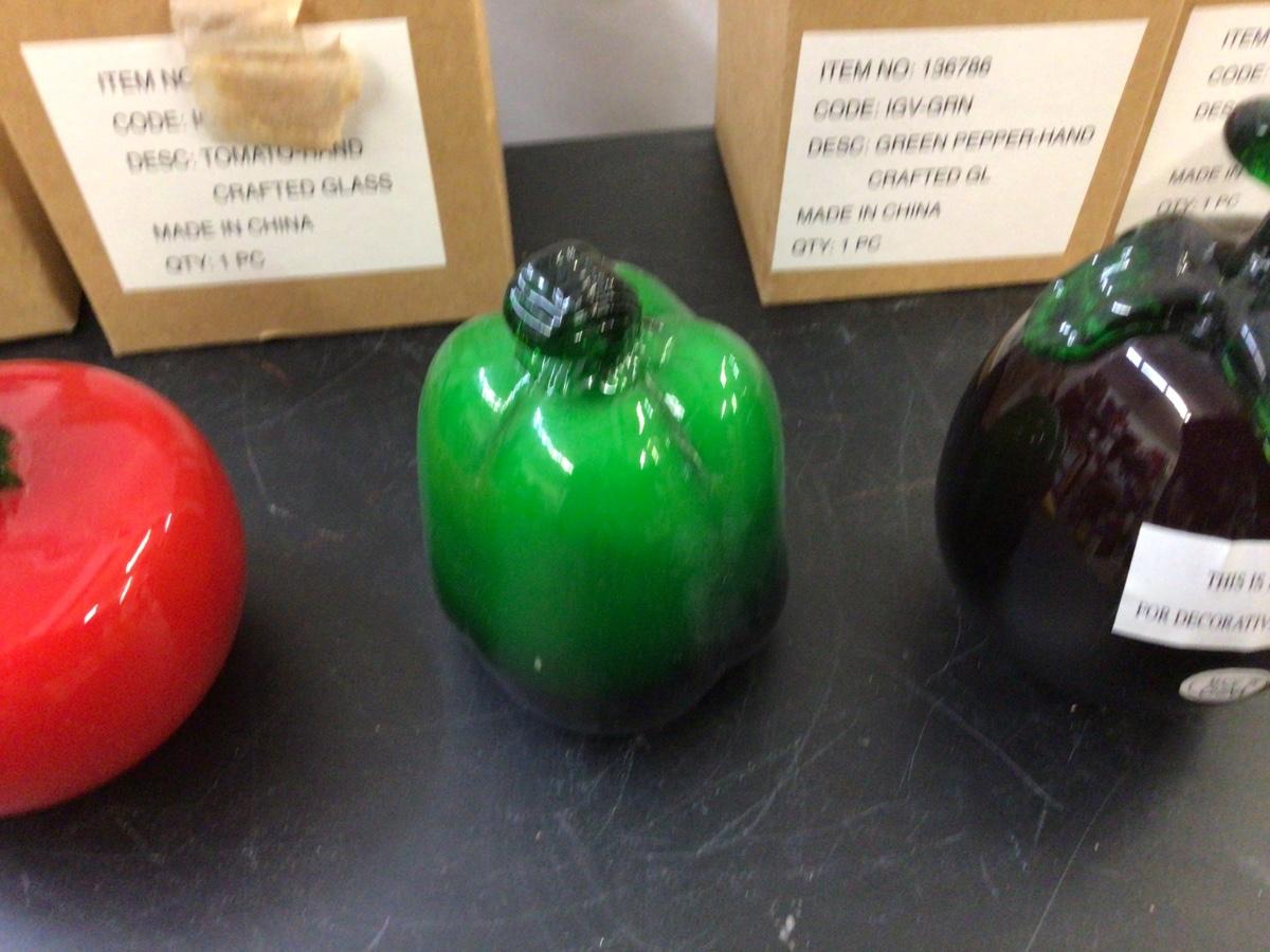 You get glass vegetables there is a Tomato, Green Pepper, Egg Plant, and two peppers.