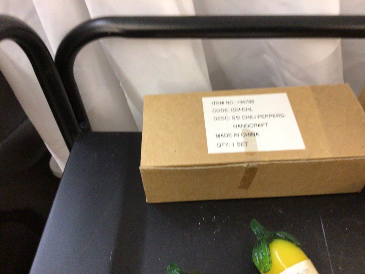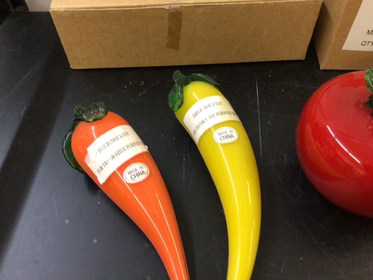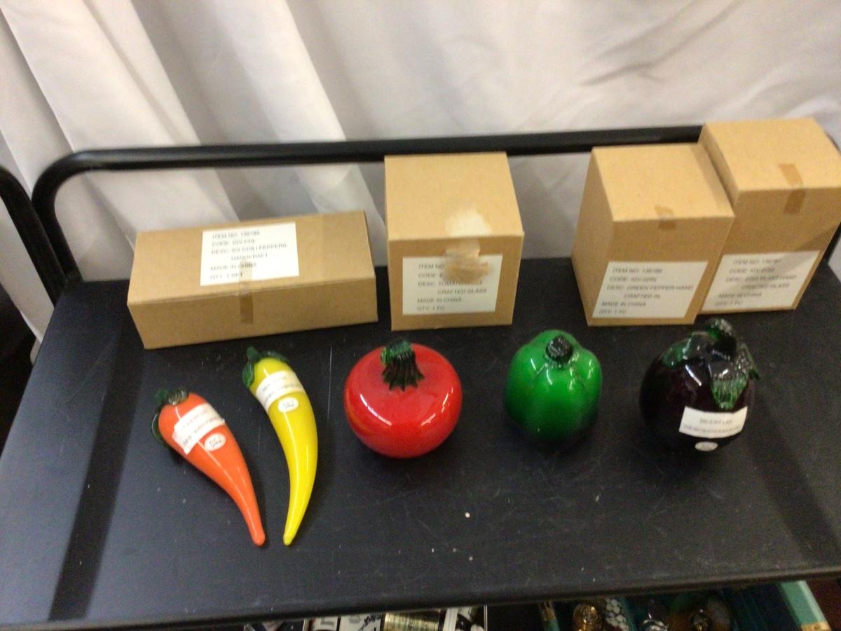 You get glass vegetables there is a Tomato, Green Pepper, Egg Plant, and two peppers.