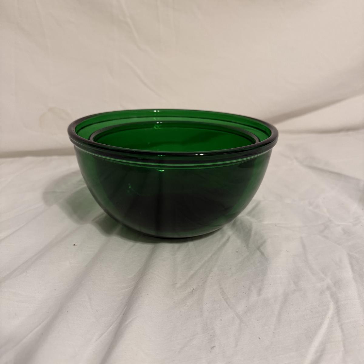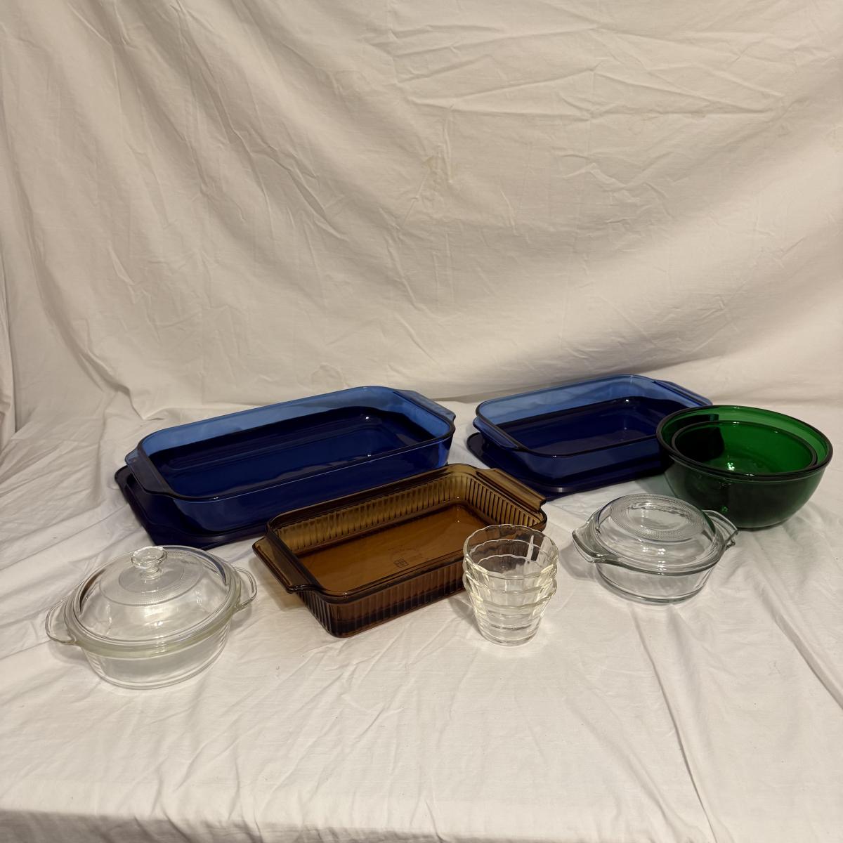 This lot contains ten items of mixed glass baking dishes. First there are two blue Pyrex casserole dishes both with lids. The largest is a 3QT 13” x 9” and the smaller is a 2.2QT 11” x 7”. Next is an Anchor Hocking 10” x 6” amber casserole dish. Next are two round Anchor Hocking clear baking dishes with lids, the larger one holds a pint. Moving on we have two unmarked green glass nesting bowls. Our last items in this lot are three 5oz clear glass ramekins. Shipping Available. Shipping can be costly. We suggest contacting our preferred local shipping provider, Postage Express, with dimensions and getting an estimate before bidding: (828) 255-9250 or shipping@postageexpressnc.com.