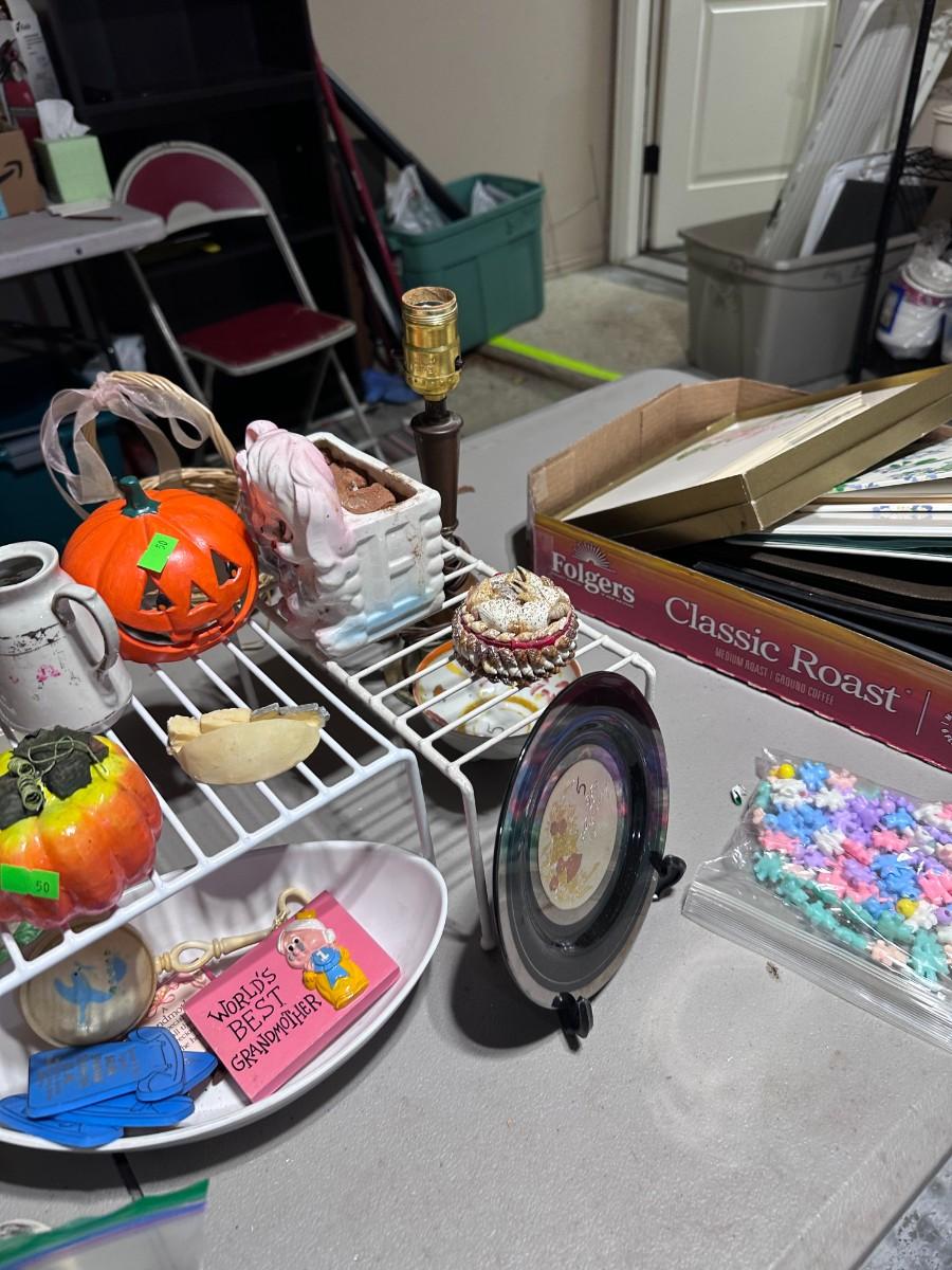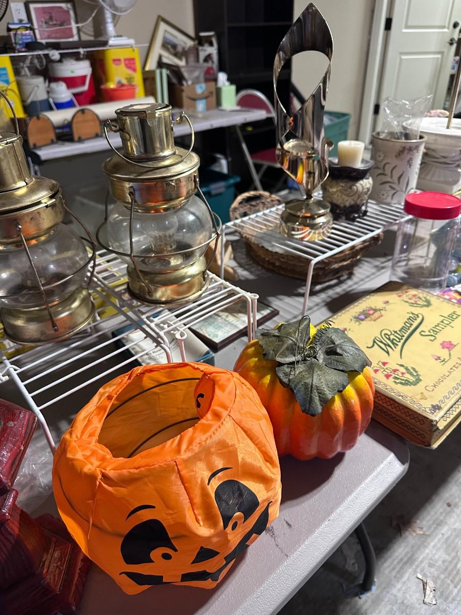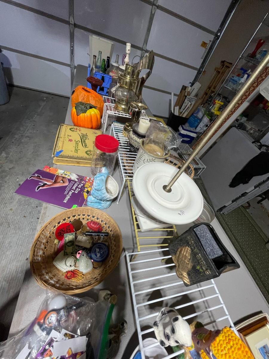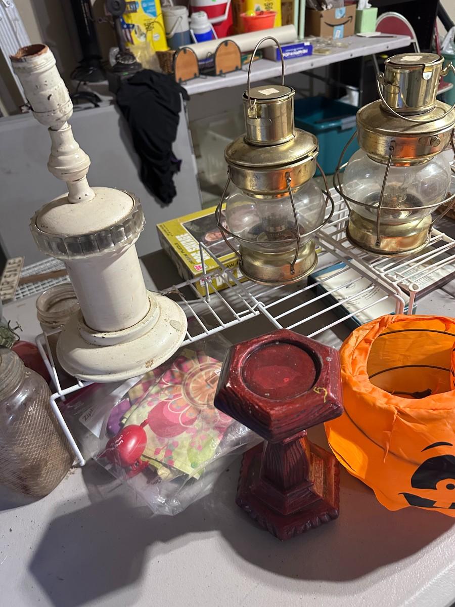 Multiple oil lamps, trinkets, halloween items, and antique glass containers