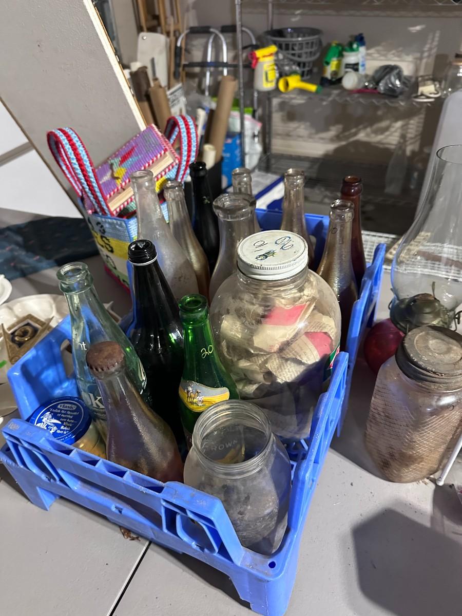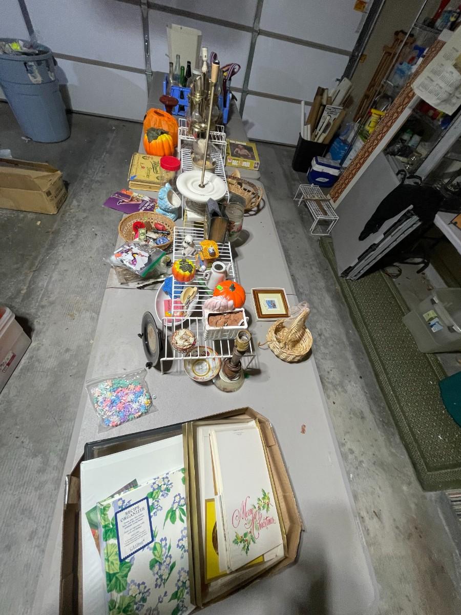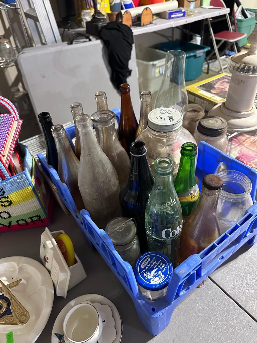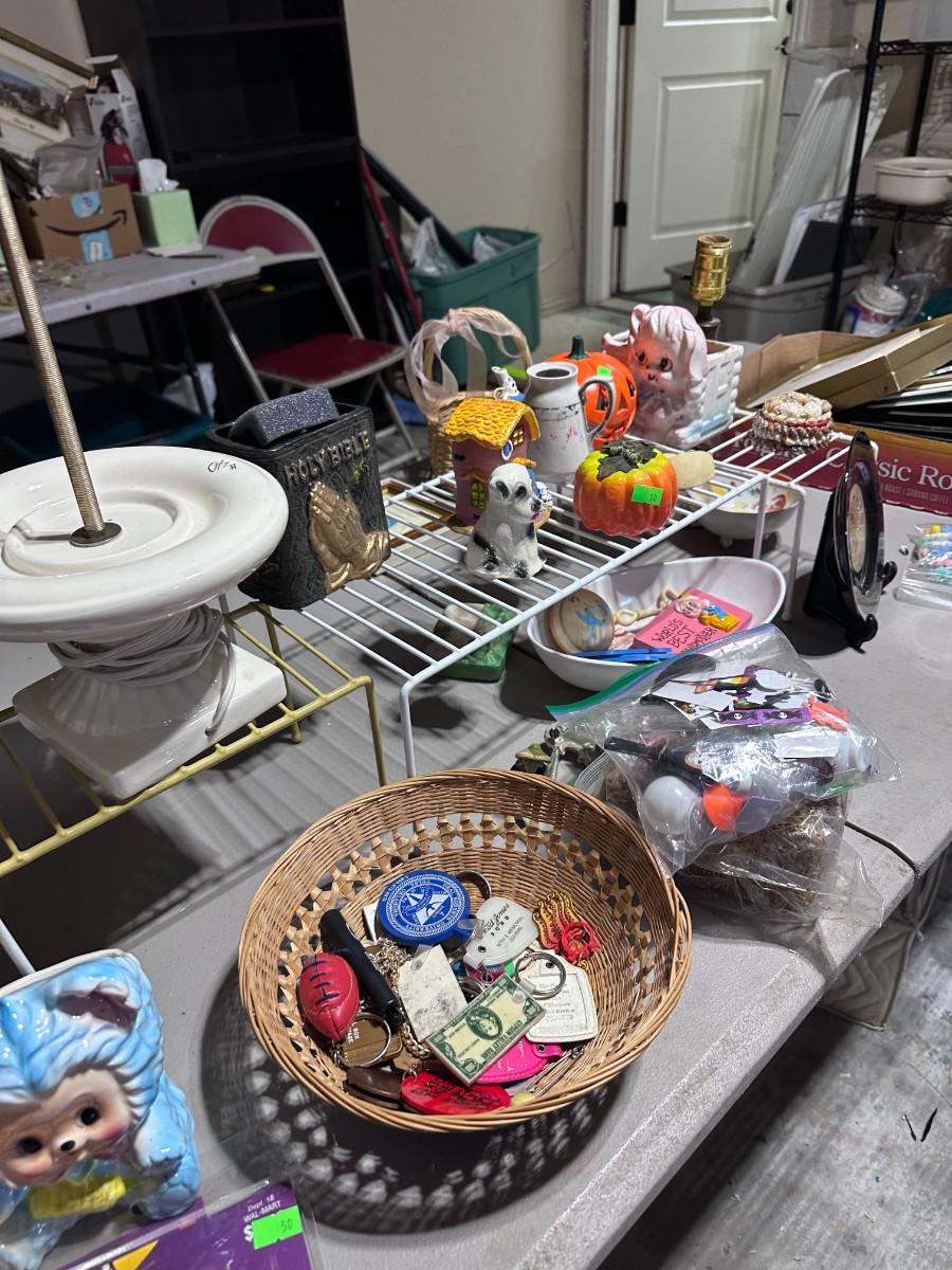 Multiple oil lamps, trinkets, halloween items, and antique glass containers