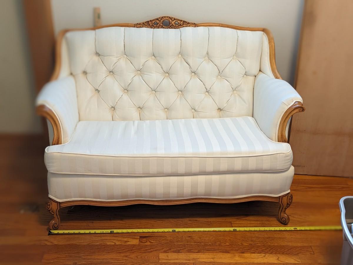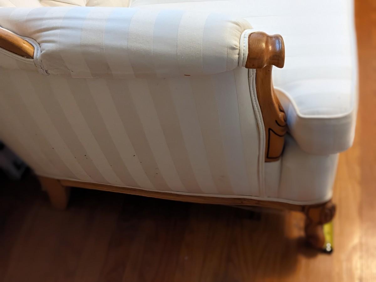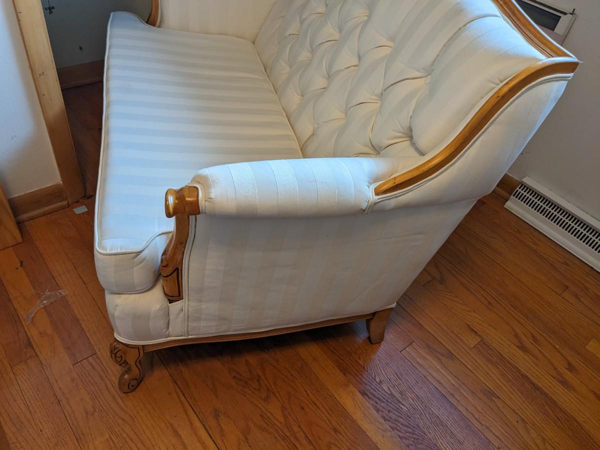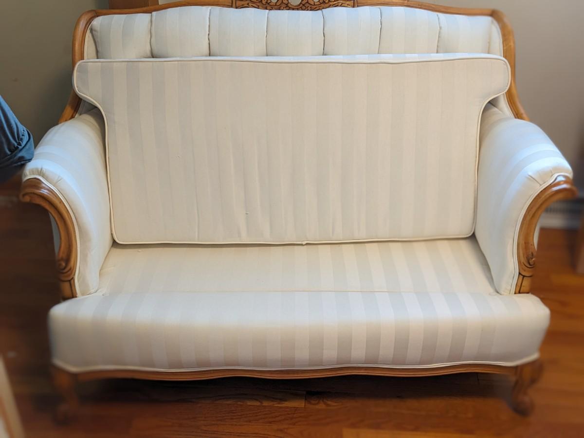 Excellent condition, cushions are very comfortable, beautiful off-white upholstery. joints tight, nice woodwork.