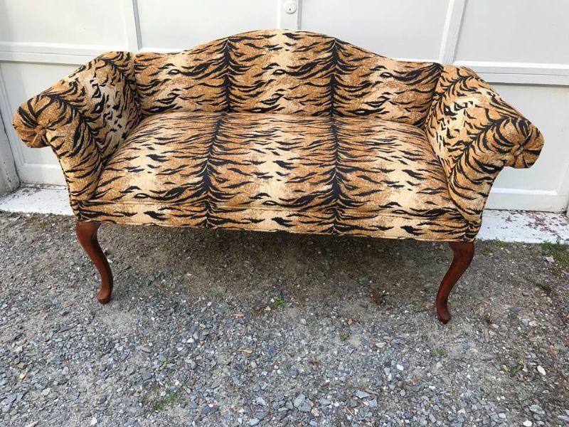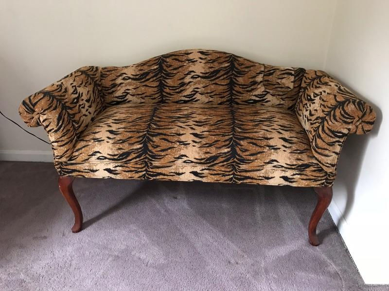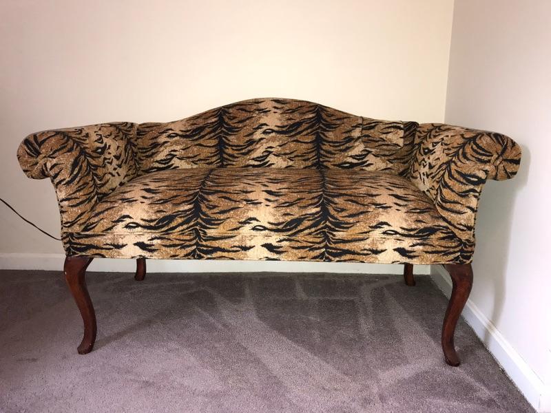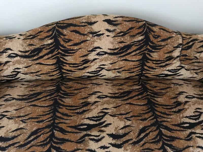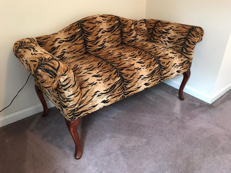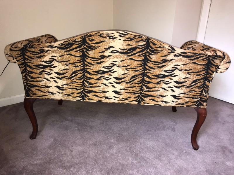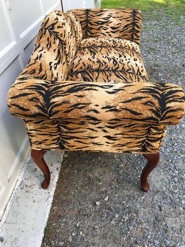 This is a settee love seat boudoir seat. It is newly upholstered in March 2018 with new padding and fabric. The fabric is a tiger pattern with matching piping. It would great at the end of your bed or a vanity bench or many other useful purposes. The width is 51” and the height is 29” and the depth front to back is 23”.
