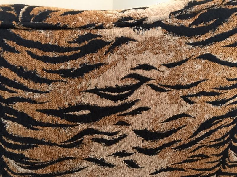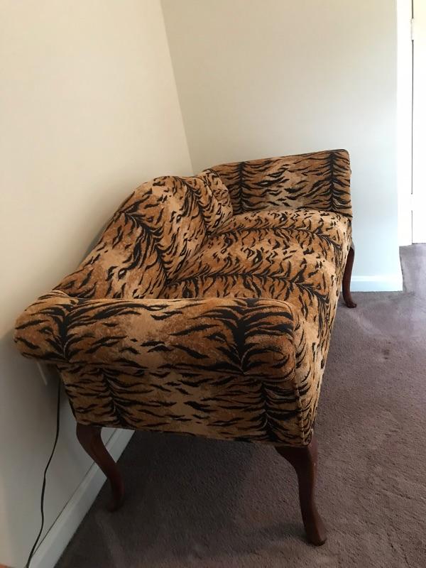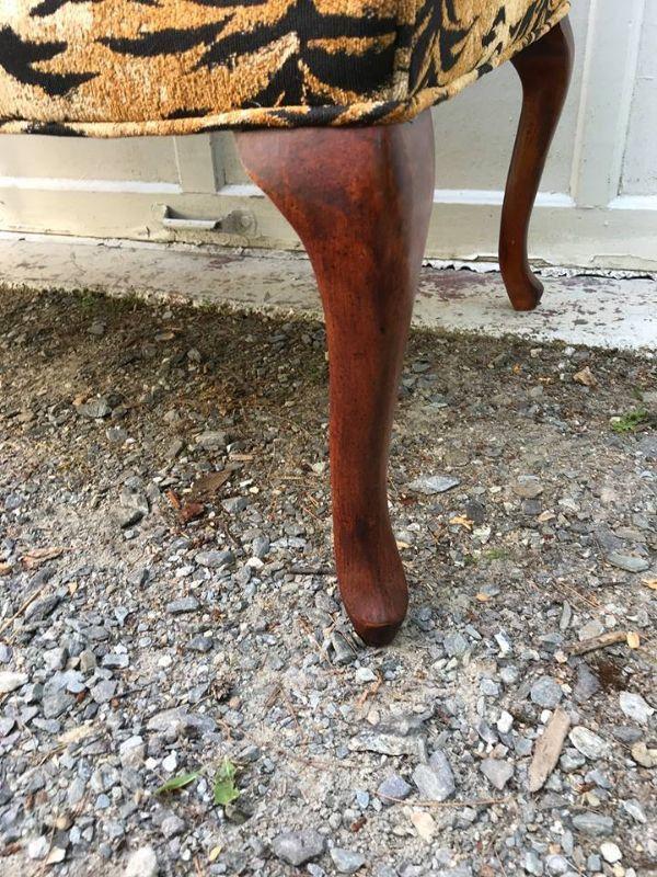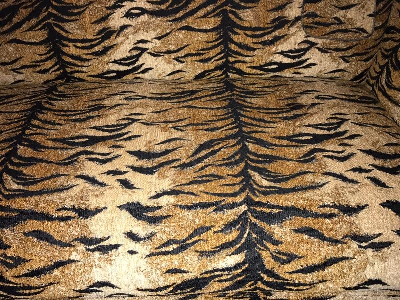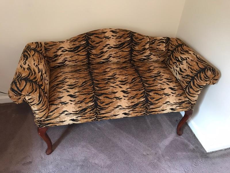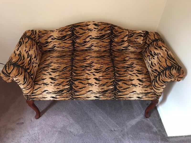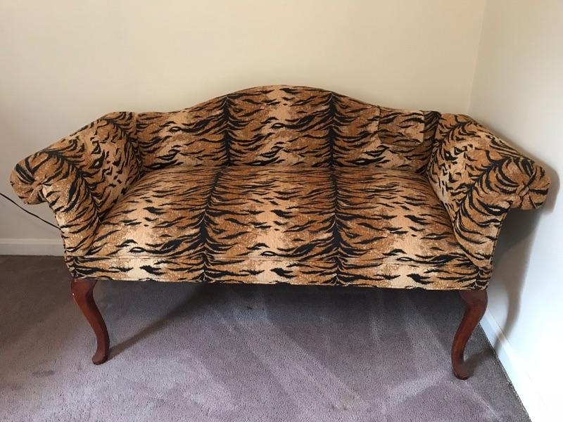 This is a settee love seat boudoir seat. It is newly upholstered in March 2018 with new padding and fabric. The fabric is a tiger pattern with matching piping. It would great at the end of your bed or a vanity bench or many other useful purposes. The width is 51” and the height is 29” and the depth front to back is 23”.