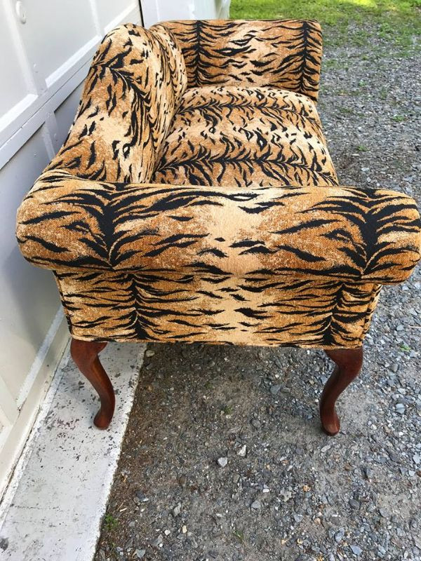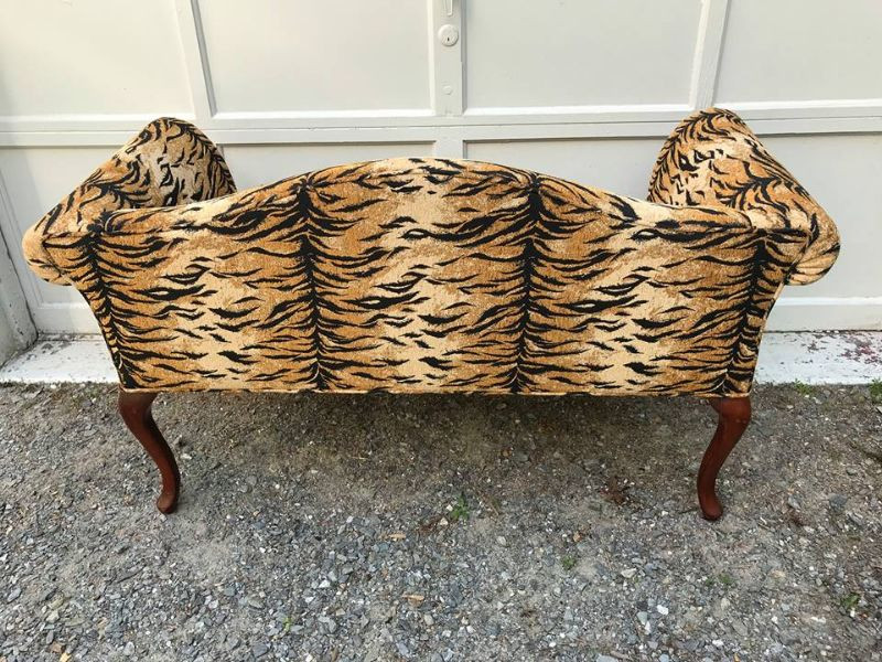 This is a settee loveseat boudoir seat. It is newly upholstered in March 2018 with new padding and fabric. The fabric is a tiger pattern with matching piping. It would great at the end of your bed or a vanity bench or many other useful purposes. The width is 51” and the height is 29” and the depth front to back is 23”.