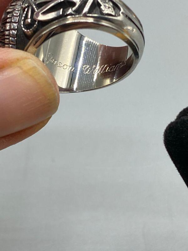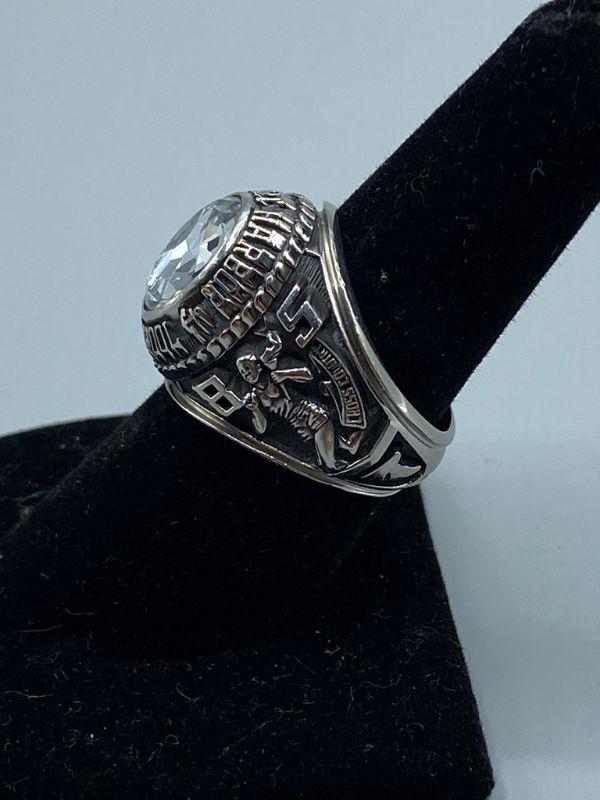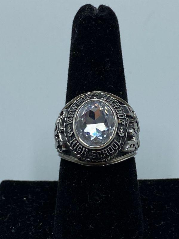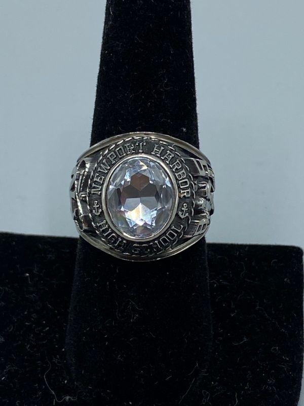 Vintage 1985 Newport Harbor High School class ring. Men's Ring. Silver tone metal, zirconia stone. Engraved on the inside "Jason Williams".