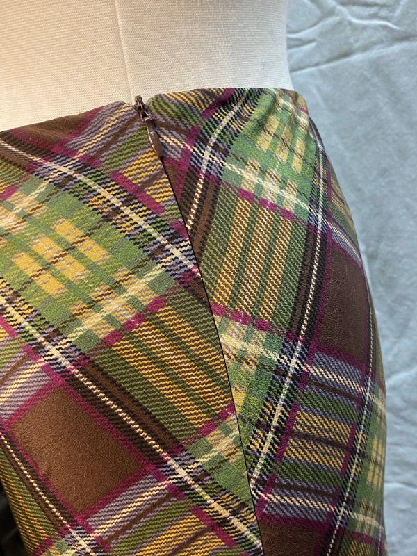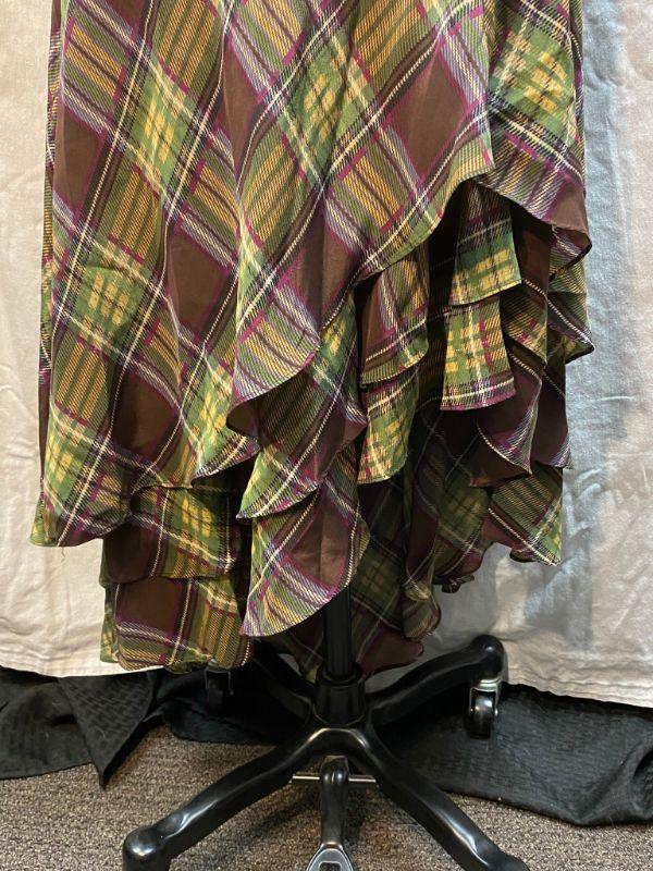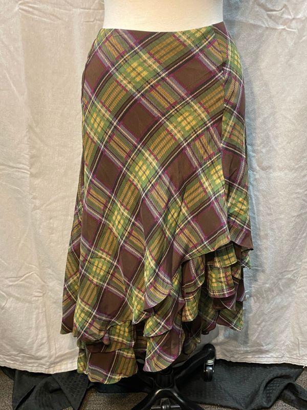 Newport News flowy plaid skirt. Light green and brown plaid. Ruffle layered bottom. Has a high/low hem to the left side. Zipper close. Good condition.