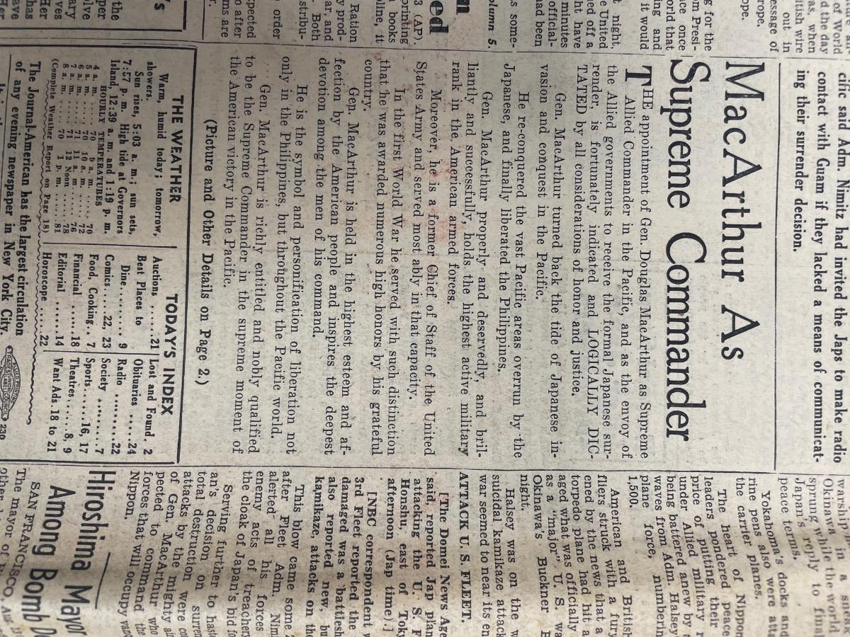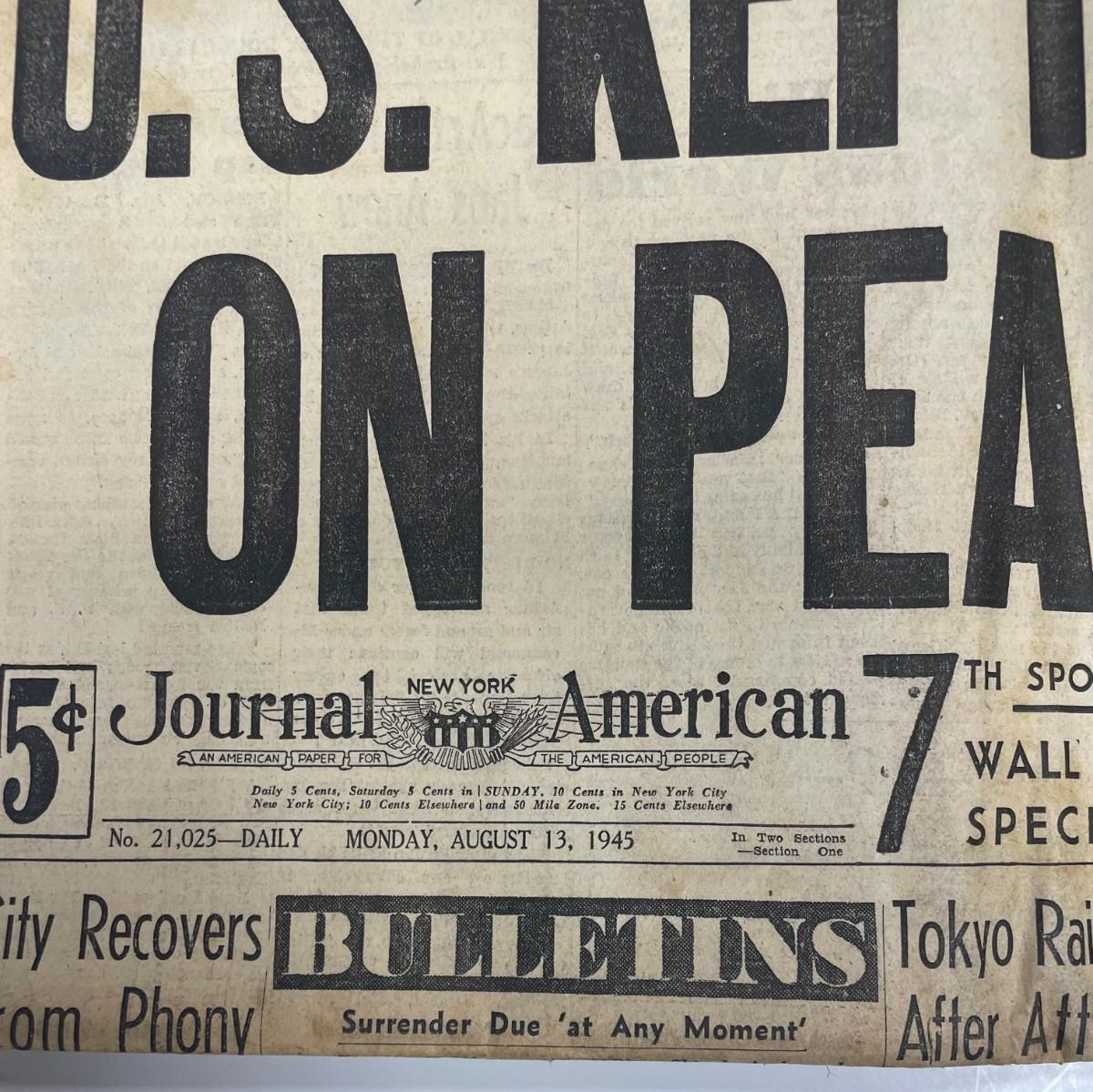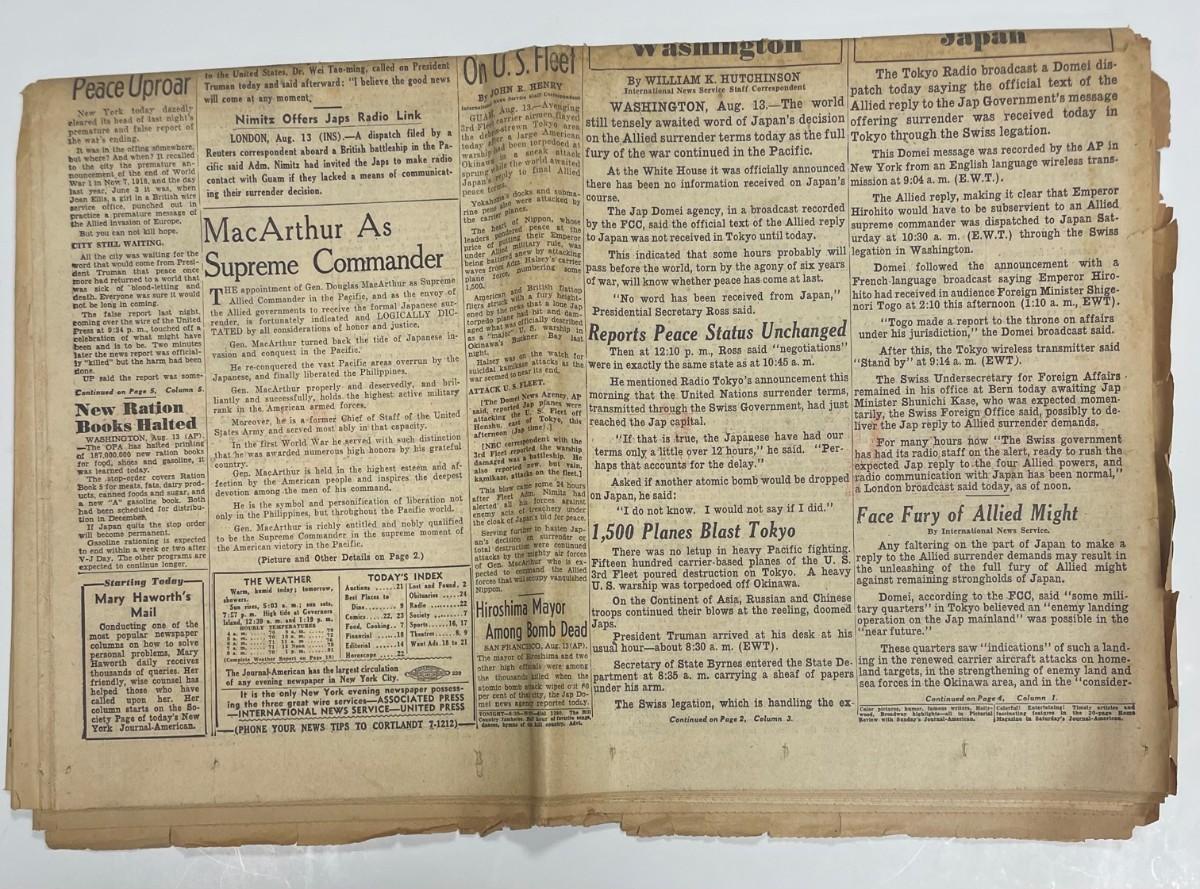 Description: Newspaper: Journal American /August 13th 1945/ HIROSHITO CONFERS WITH TOGO. U.S KEPT WAITING ON PEACE REPLY / WW2. Measurement approximate: Material: Paper