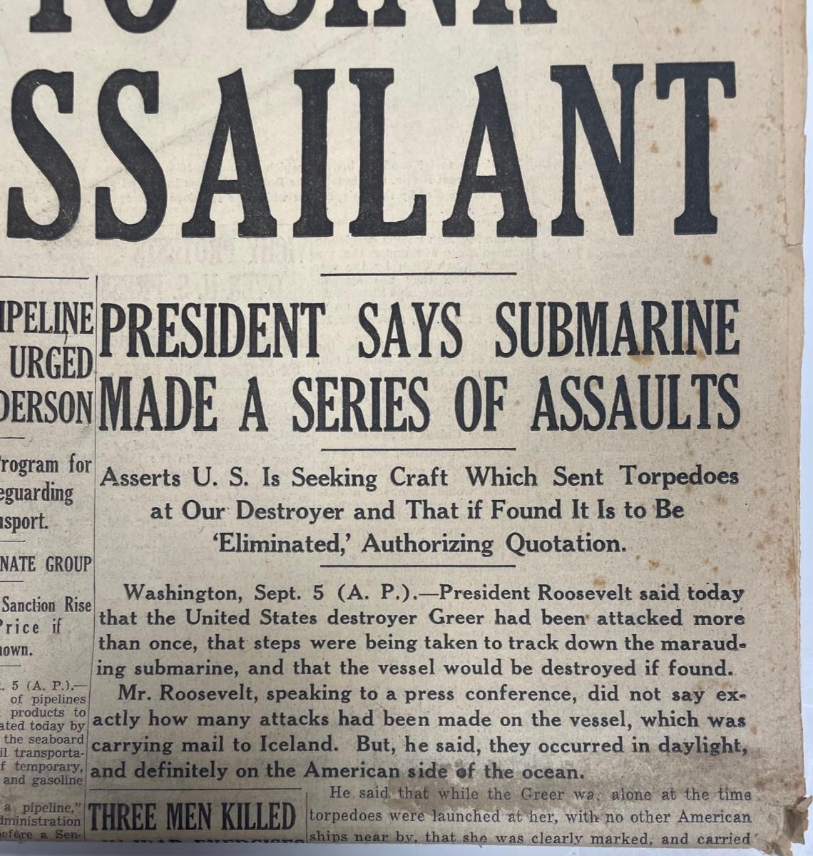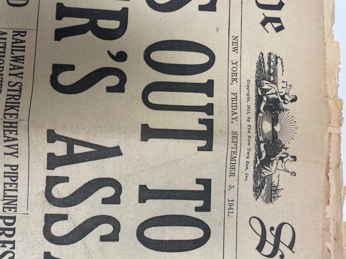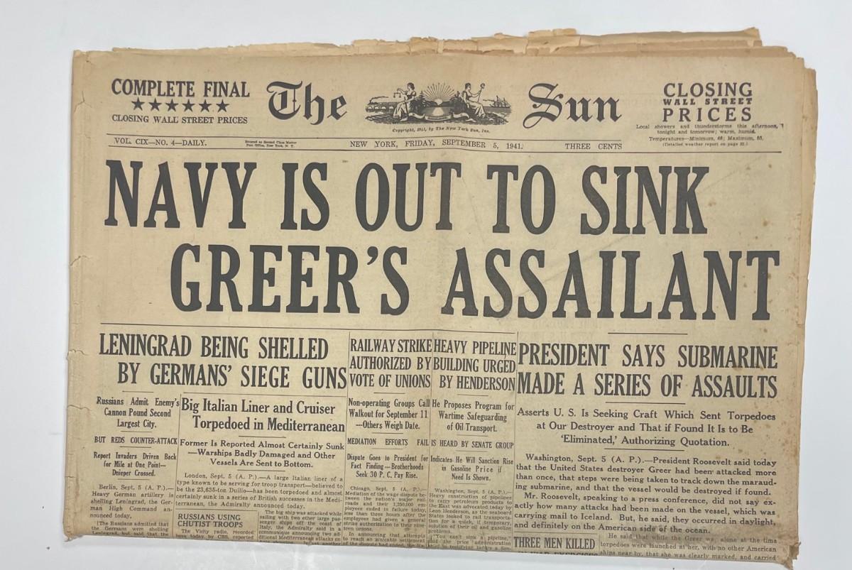Description: Newspaper: THE SUN/ September 5th 1941/NAVY OUT TO SINK GREER'S ASSAILANT/ WW2. Measurement approximate: Material: Paper