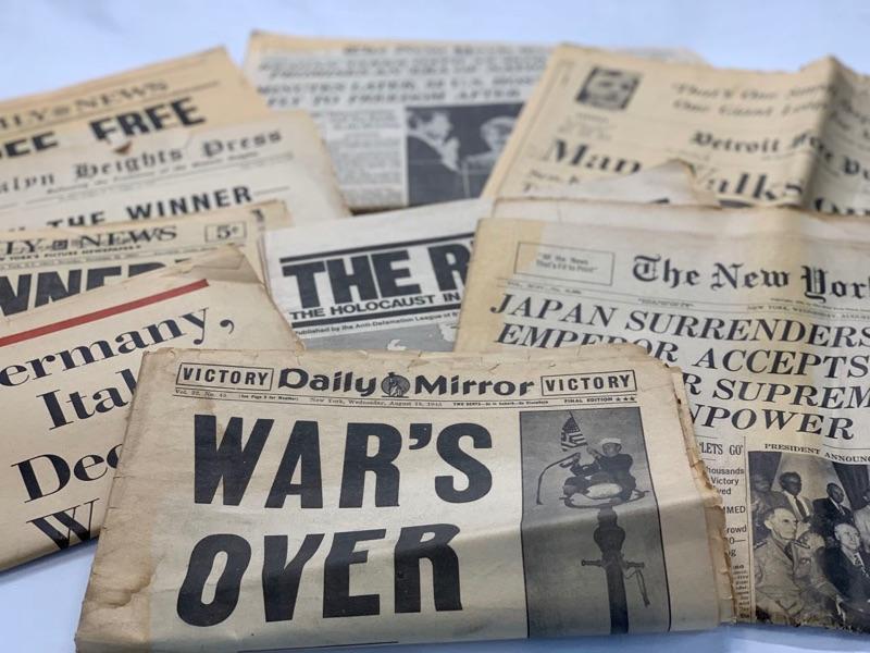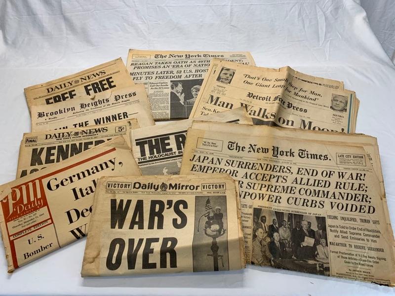 Various newspaper of world events, Daily News "1945", "1963", The New York Times "1945", War's Over, Man Walks on the Moon, Kennedy. Shipping available for extra cost.