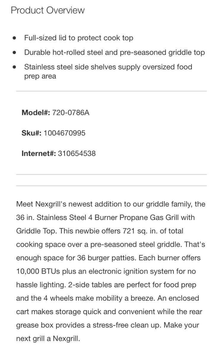 NEXGRILL ~ Griddle Top Propane Stainless Steel Grill ~ Gently Used