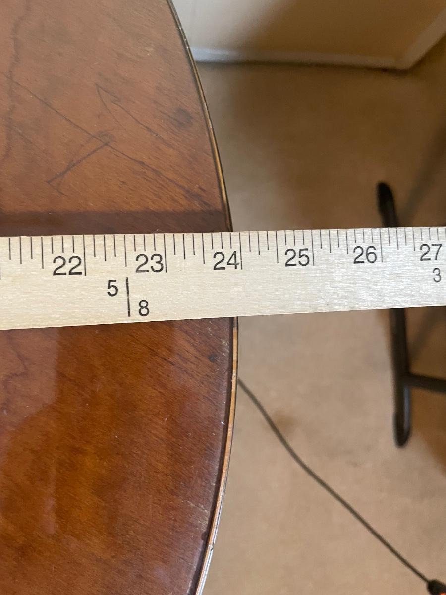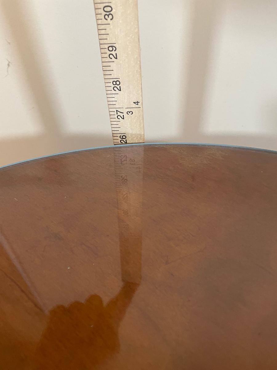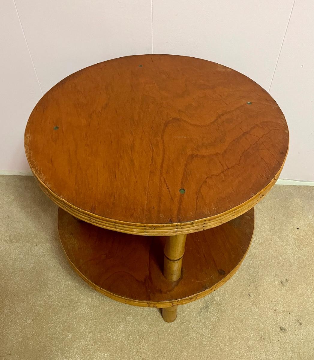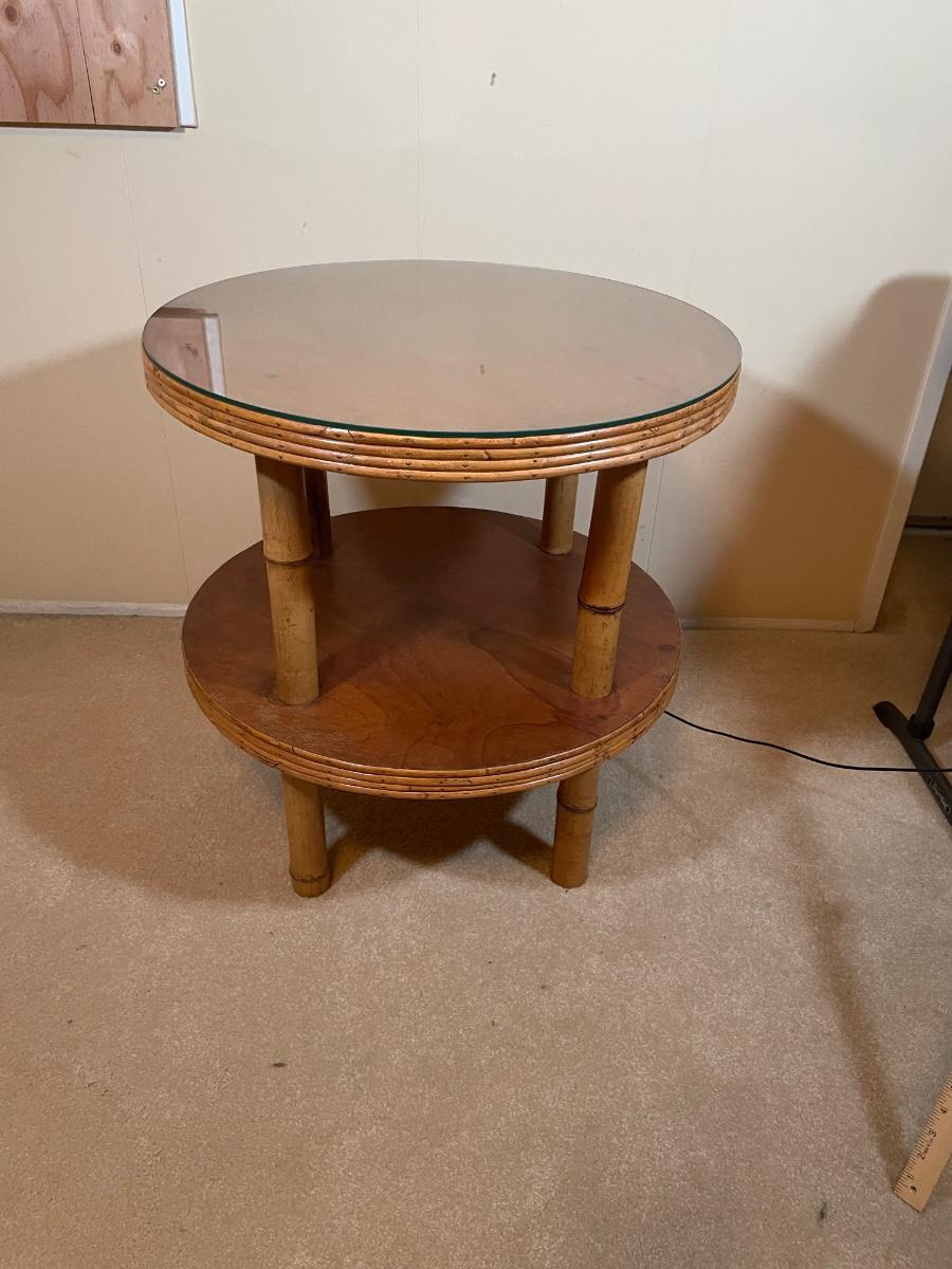 Made from bamboo and plywood. Approx. 28" tall and 24" in diameter. Upper piece has a custom round glass top. Good condition.
