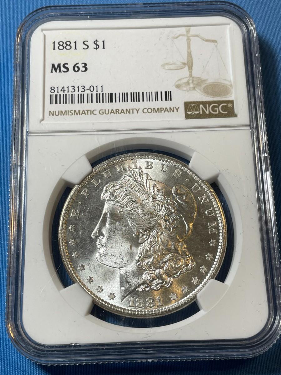 NGC CERTIFIED 1881-S MS63 GRADED MORGAN SILVER DOLLAR AS PICTURED. (COIN #011). $5 DOMESTIC SHIPPING.