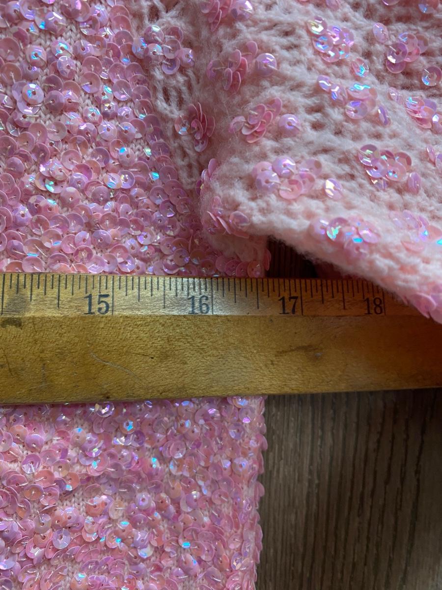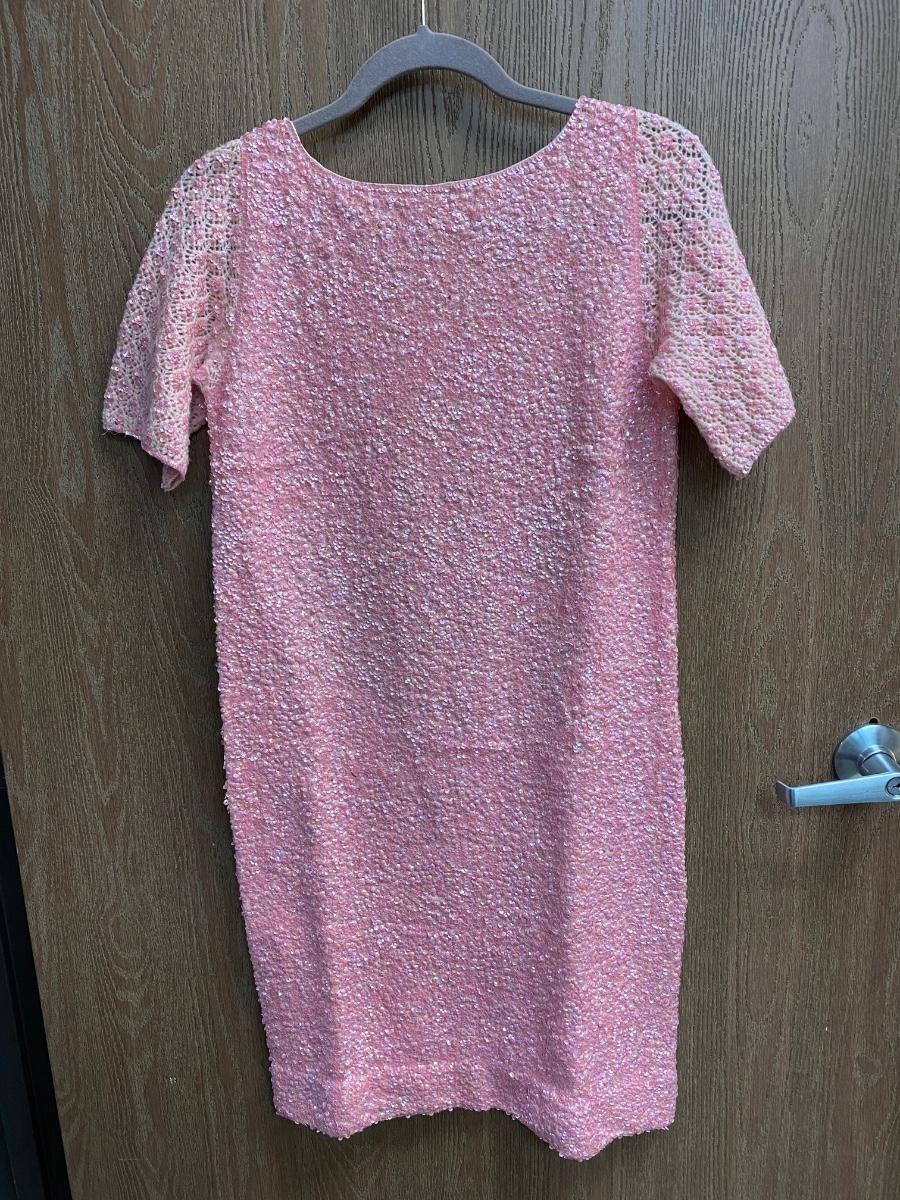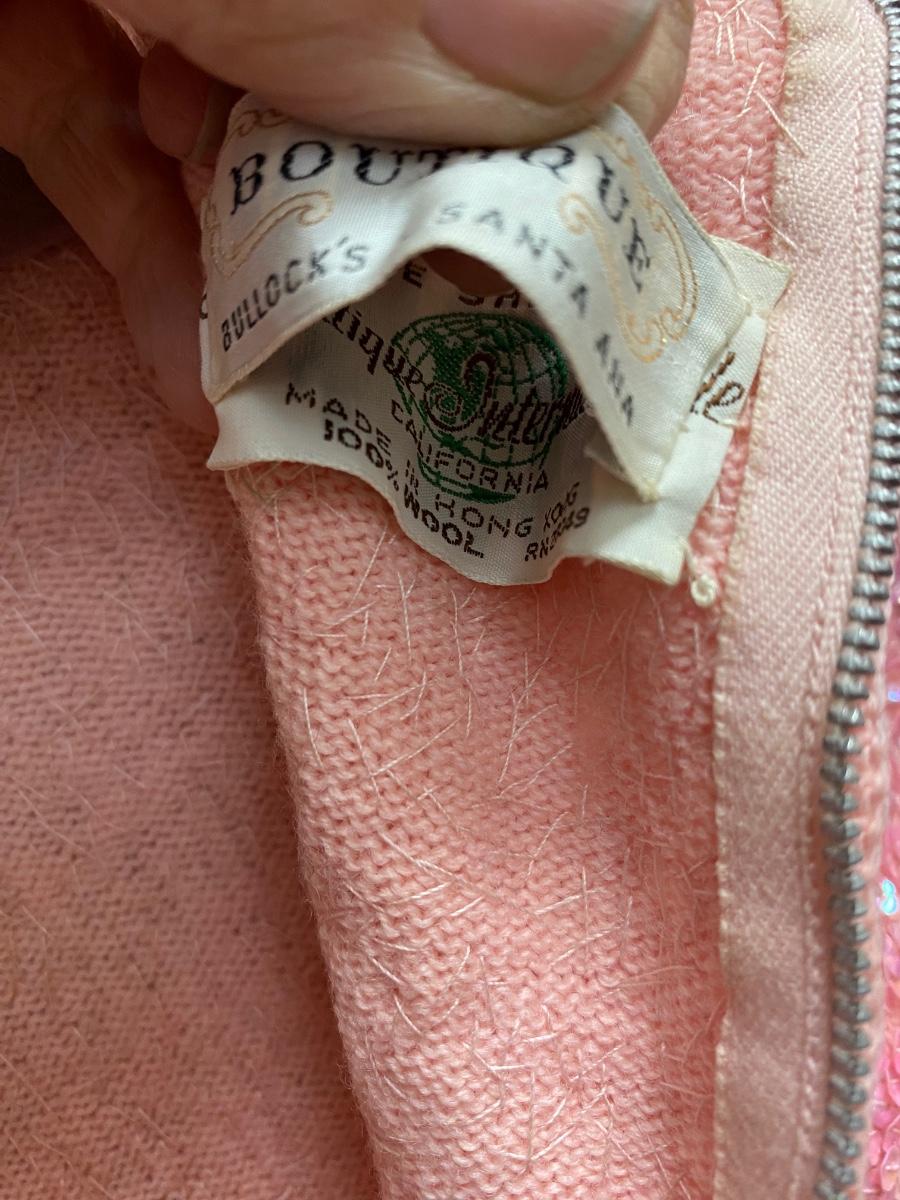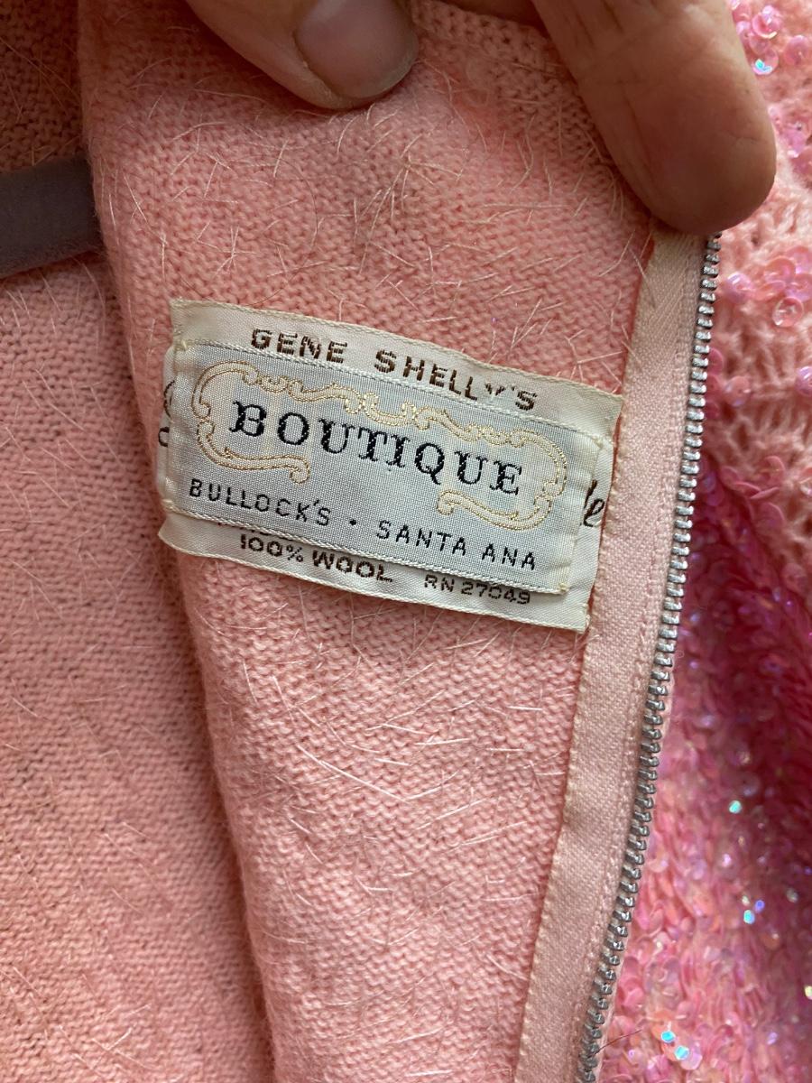 Vintage Retro Wool Pink Sequined Sheath Dress Gene Shell's Boutique Bullock's Santa Ana. In good vintage condition. May have light discoloration but no holes or stains found. Zipper back. No size tag, waist measured about 16" across. Dress is pretty straight fit, no curve to measurements.