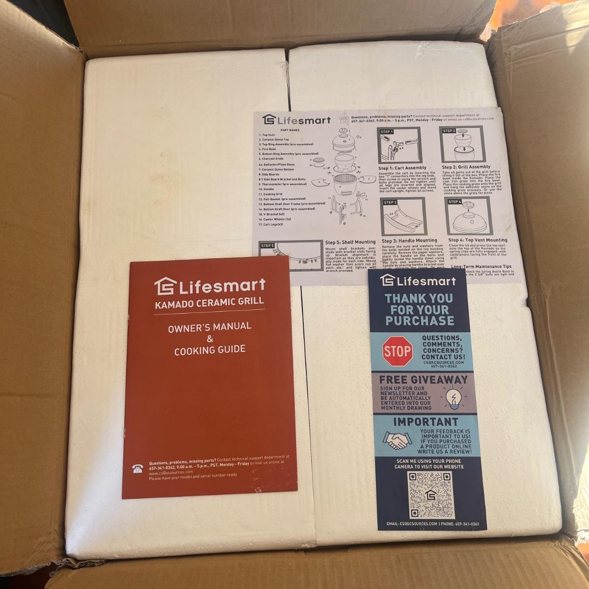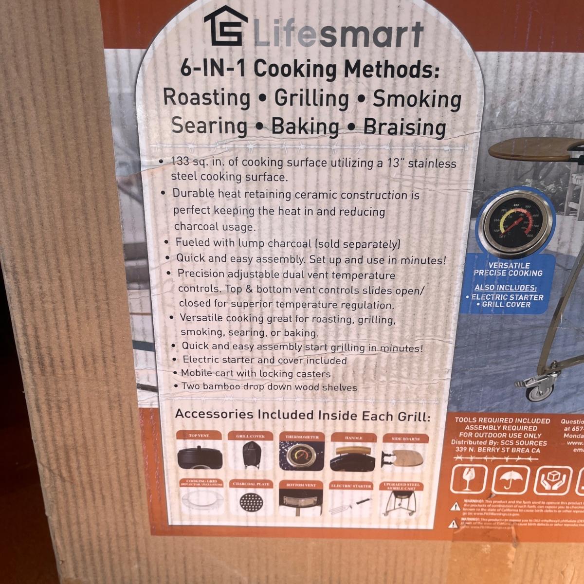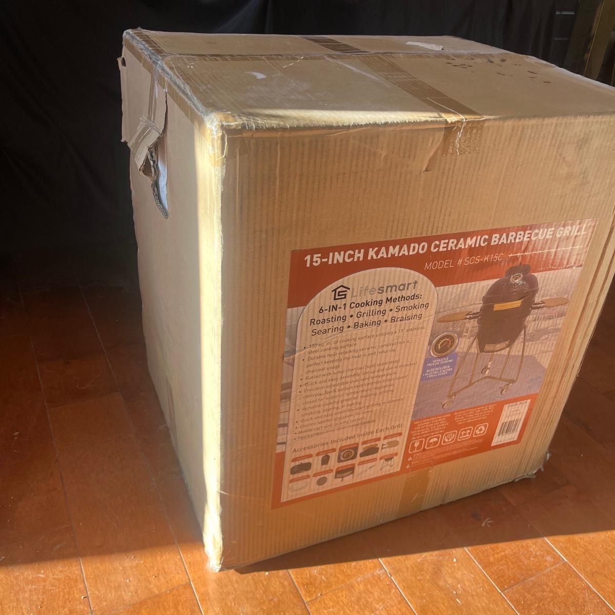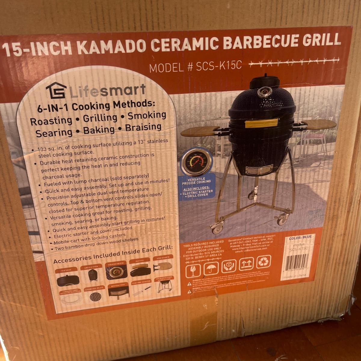 Lot includes a NIB 15” Kamado ceramic barbecue grill. Box measures 22” x 19” x 24”H.