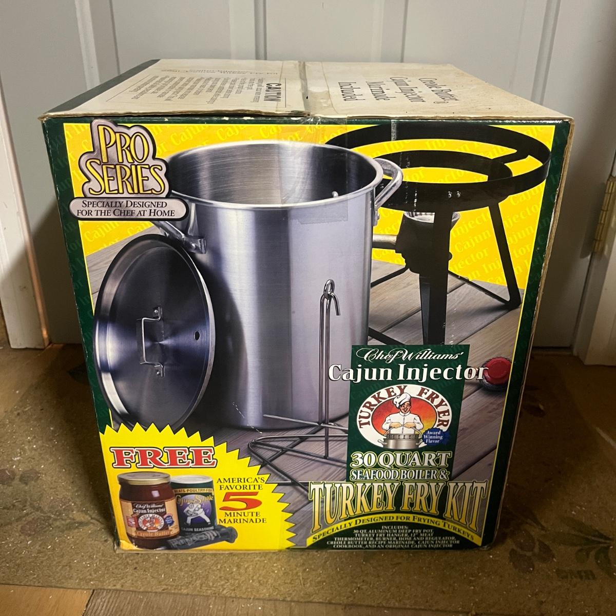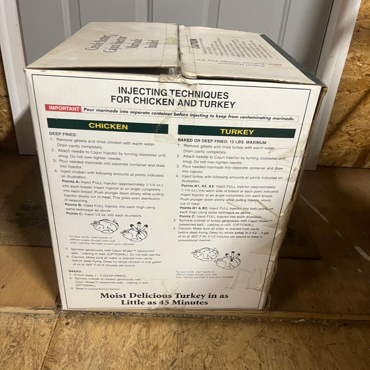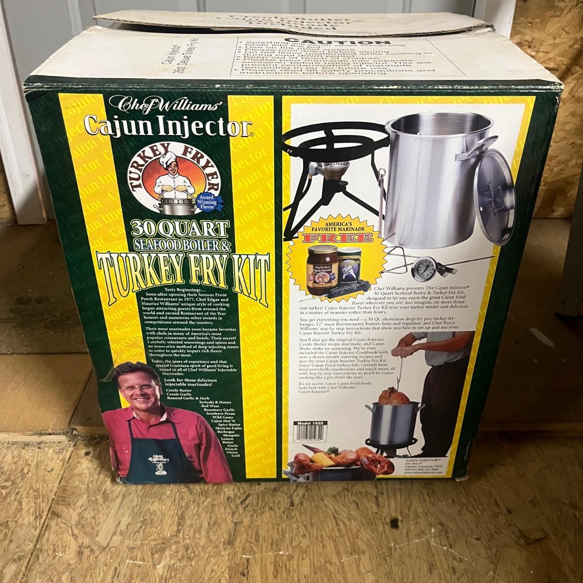 Lot includes a NIB 36 quart turkey fryer kit. Box was just open to show contents. Box measures 15” x 15” x 17”H.