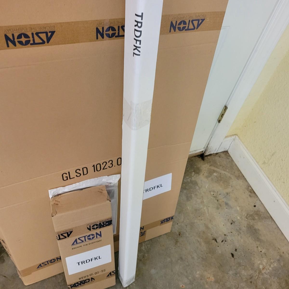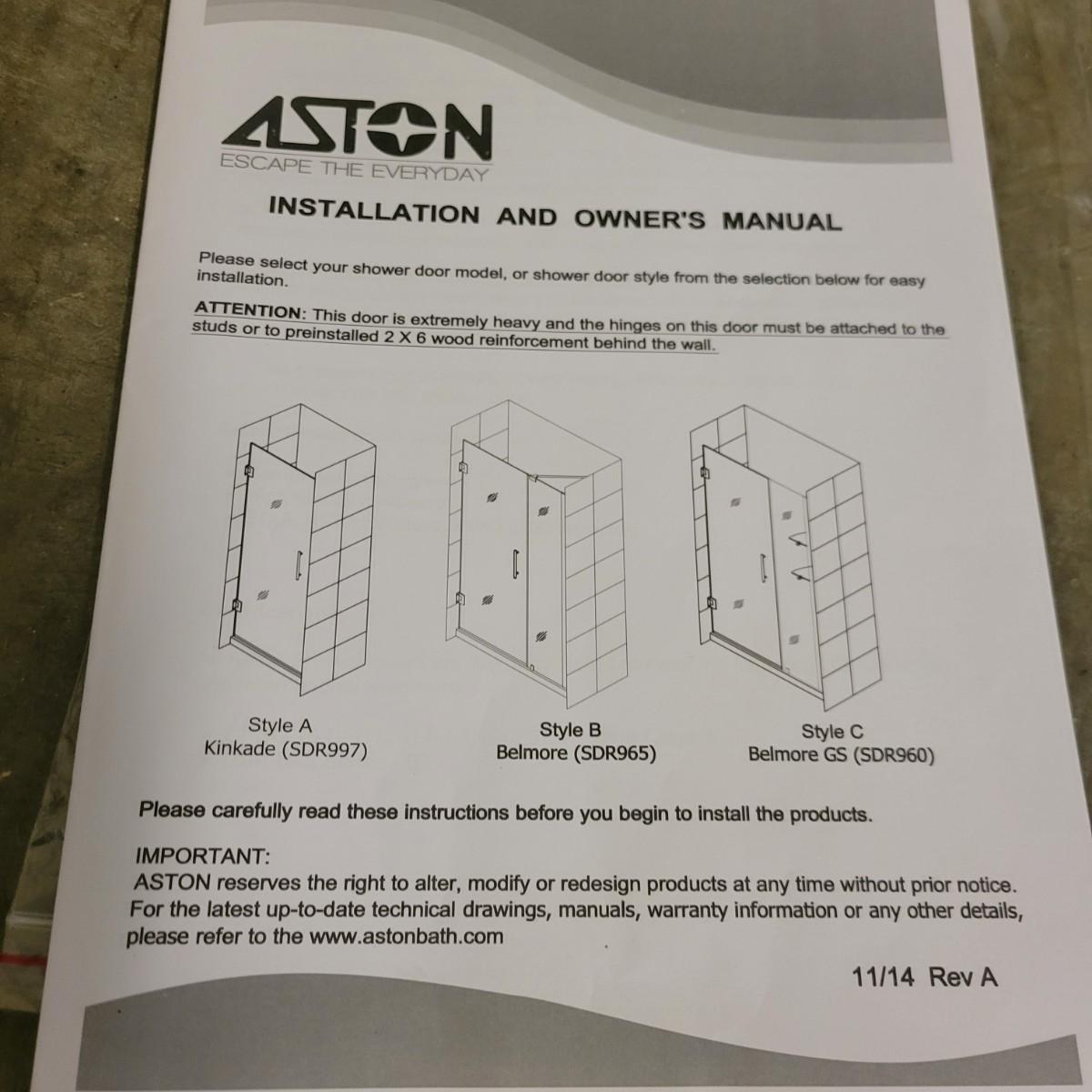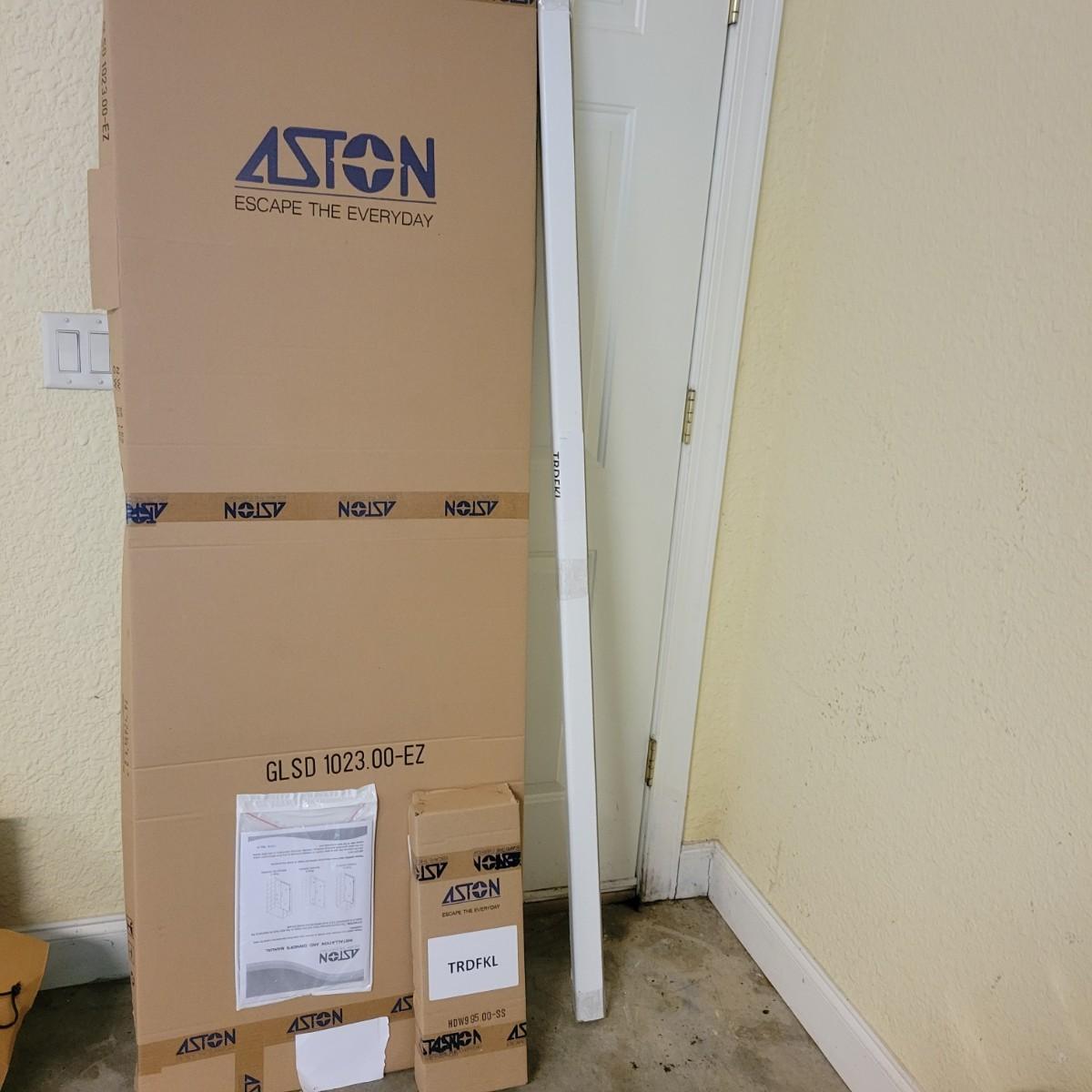 A brand new Aston tempered glass shower door that includes hanging hardware. It measures approximately 24.75" x 2" x 74". It appears to be the Kinkade style A door, as there is only one piece of glass. Includes all hardware. Local pickup only