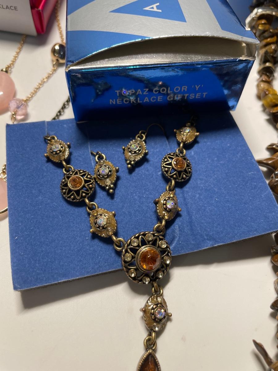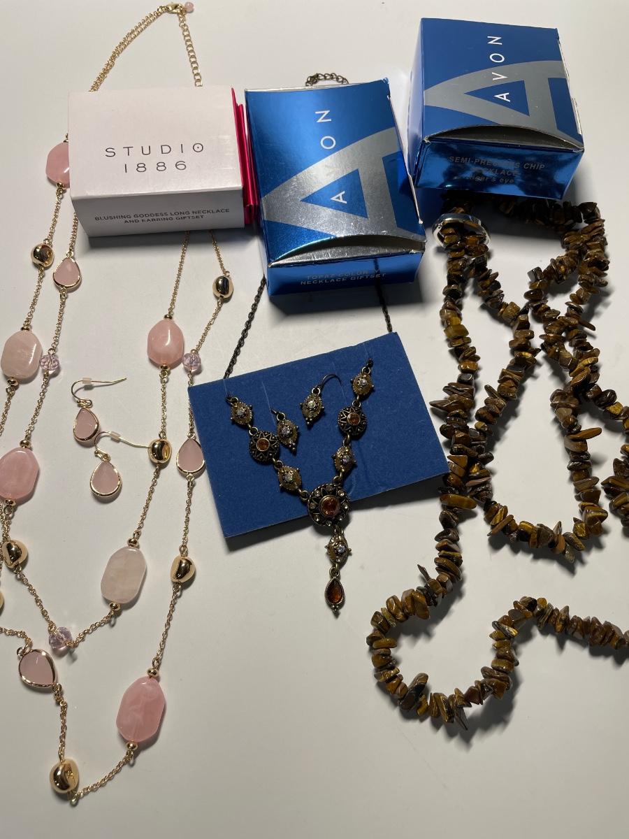 NIB Avon Pink necklace set, Topaz necklace set, Tigers Eye necklace