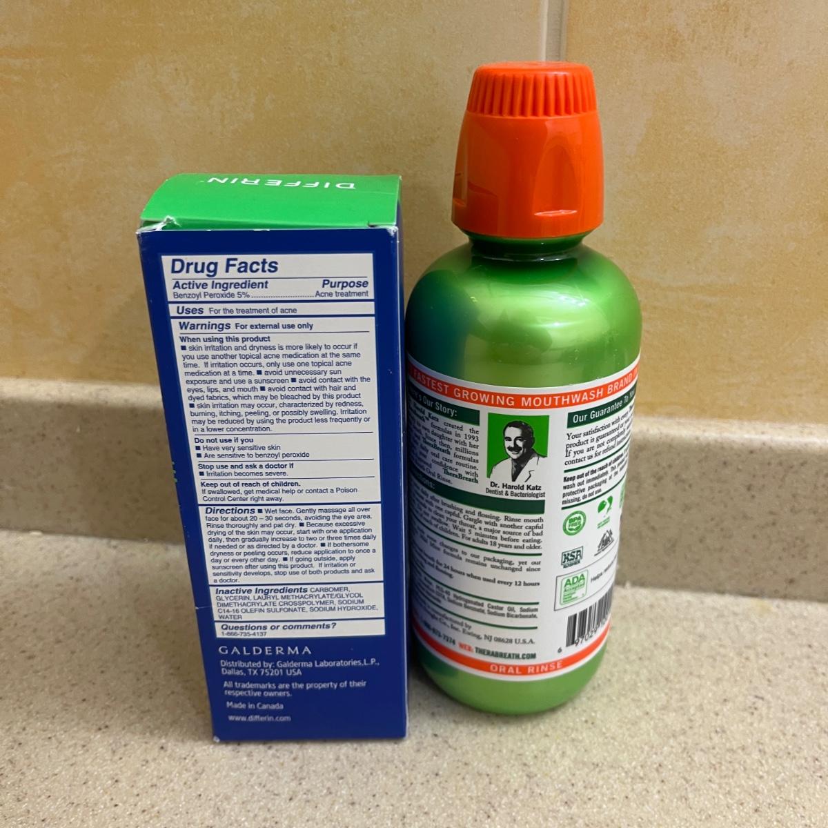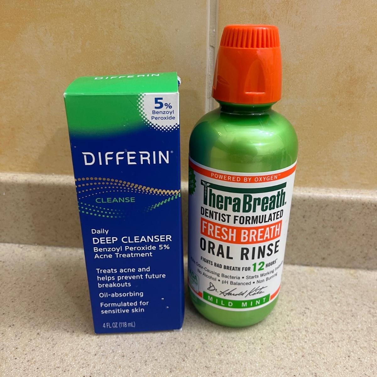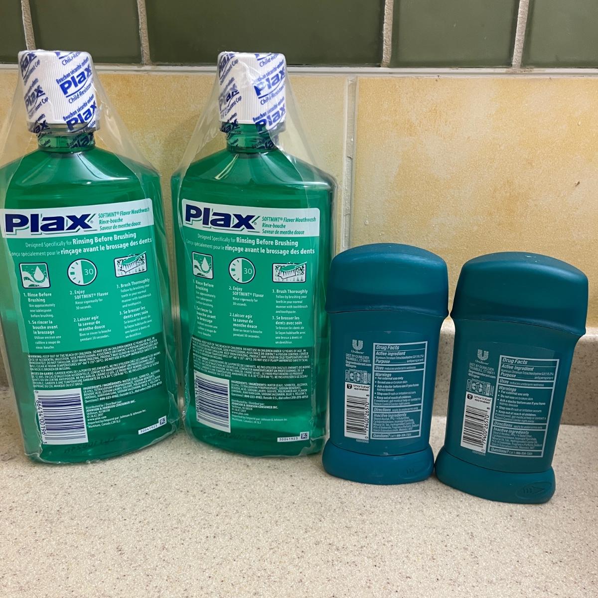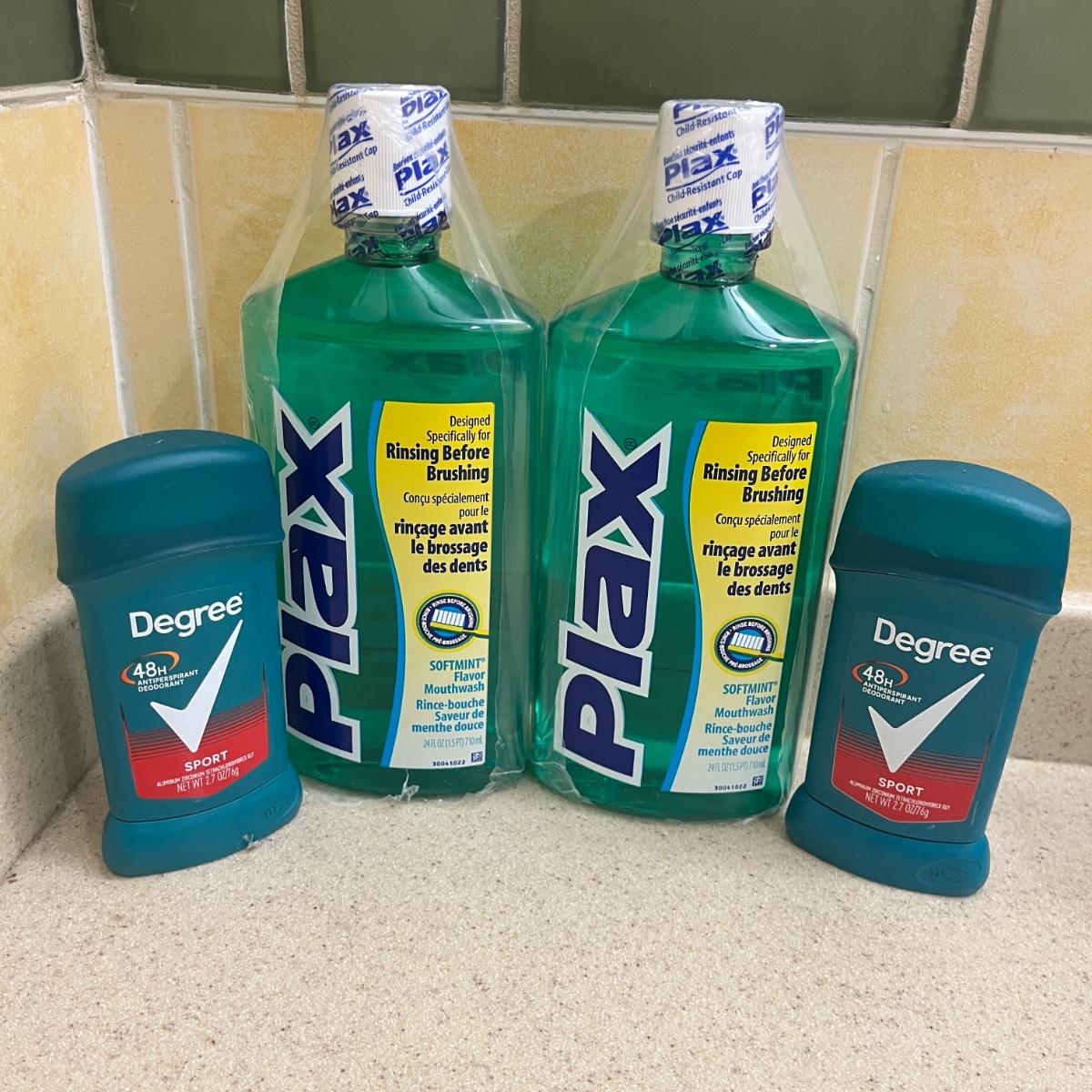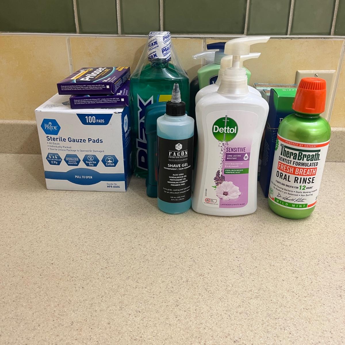 Lot includes two boxes of Prilosec OTC, two bottles of Plax mouthwash, two Degree anti-perspirants, two boxes of Just For Men facial haircolor kits, Dial body wash, two bottles of Dettol body wash, Vaseline moisturizer, Thera Breath oral rinse, Differin cleanser, and sterile gauze pads.