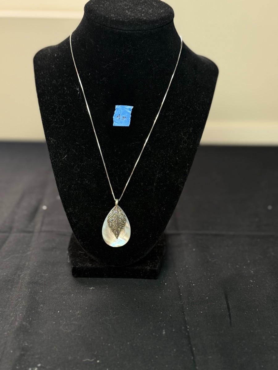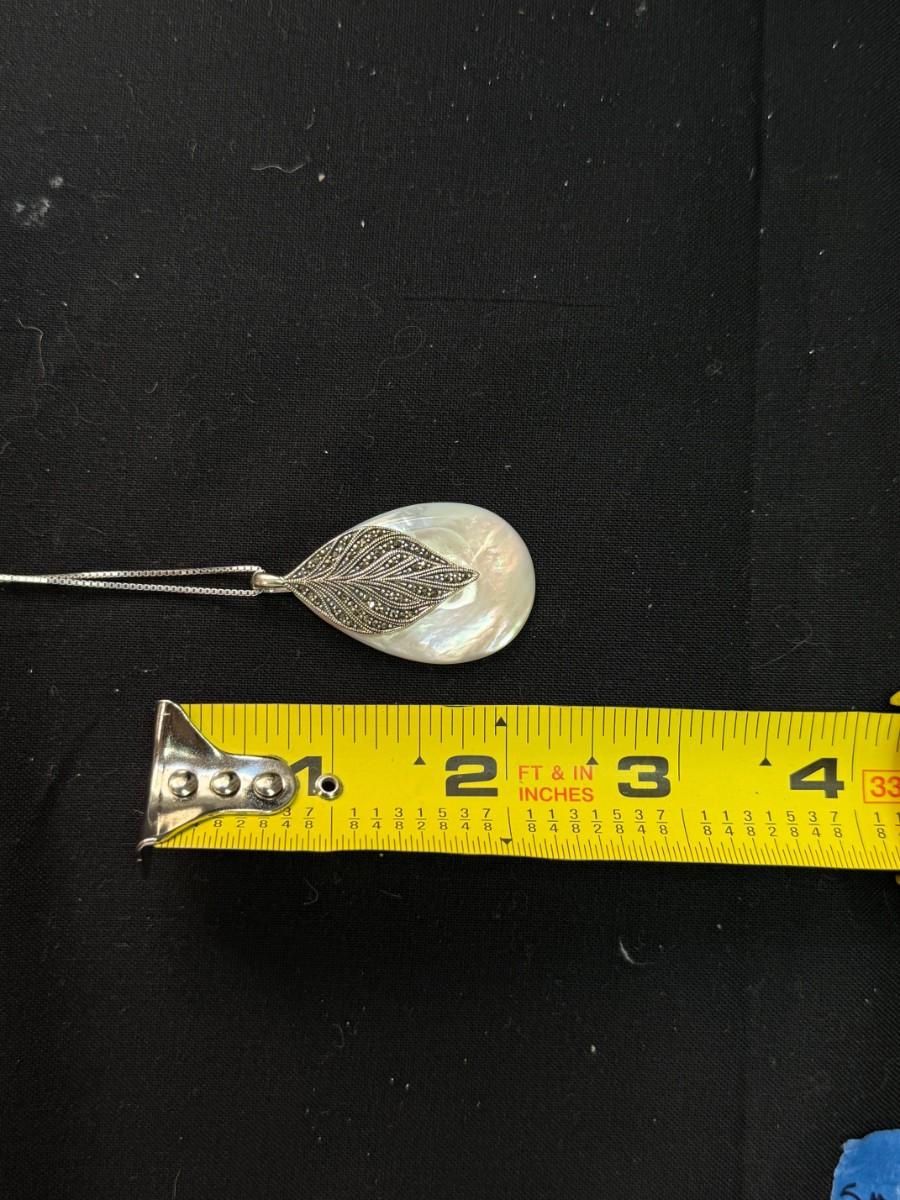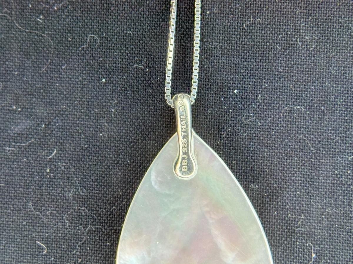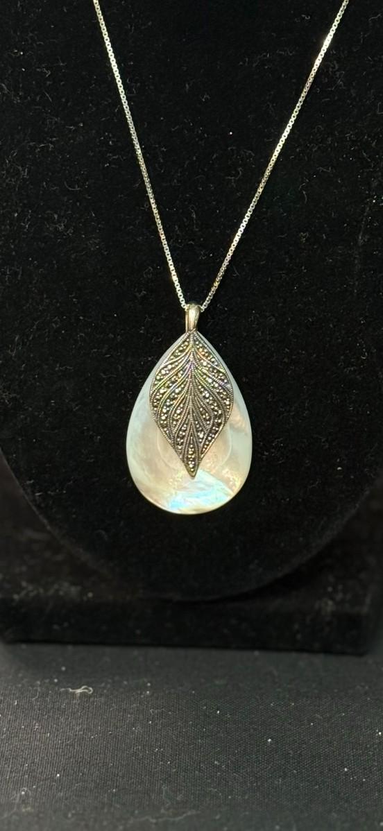 NIB BBJ 925 Silver Mother of Pearl Tear Drop w/ Marcasite Leaf Overlay Necklace