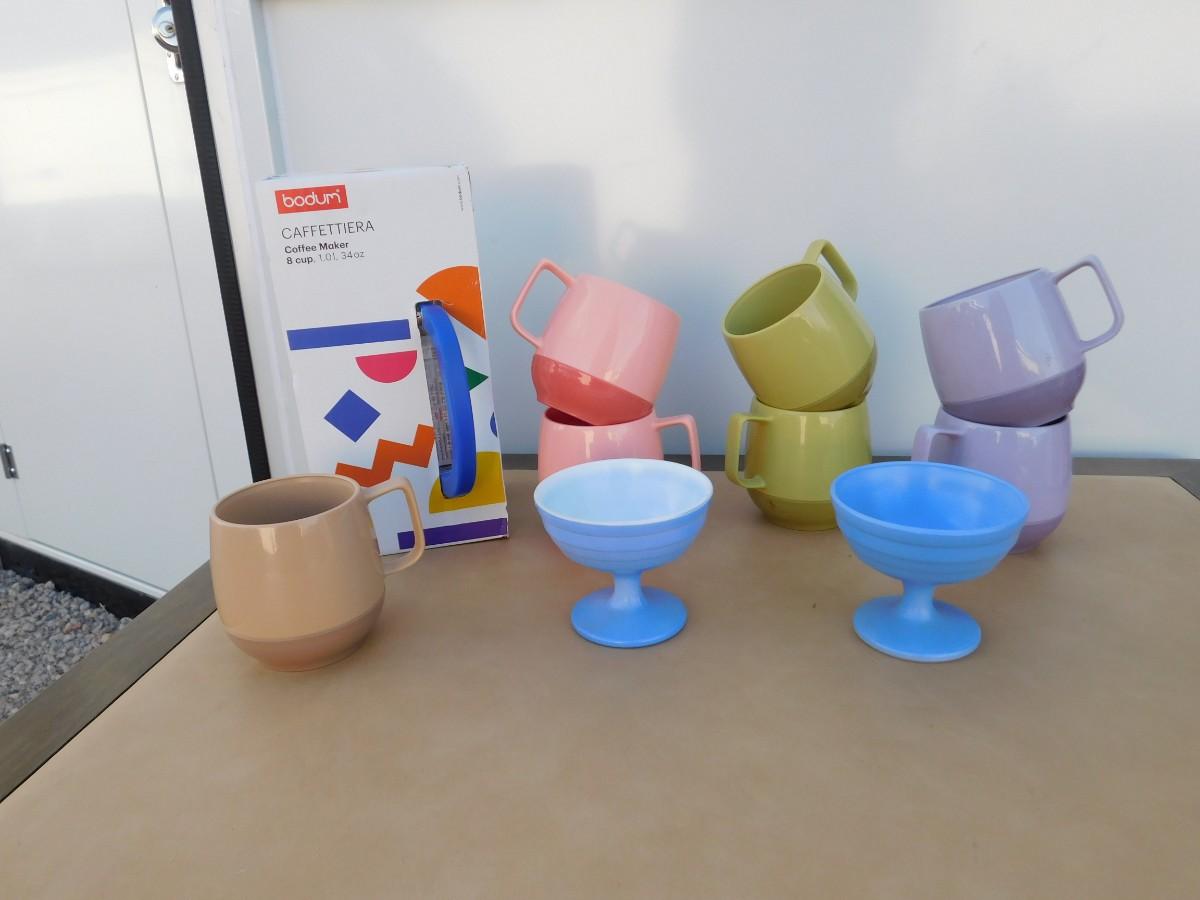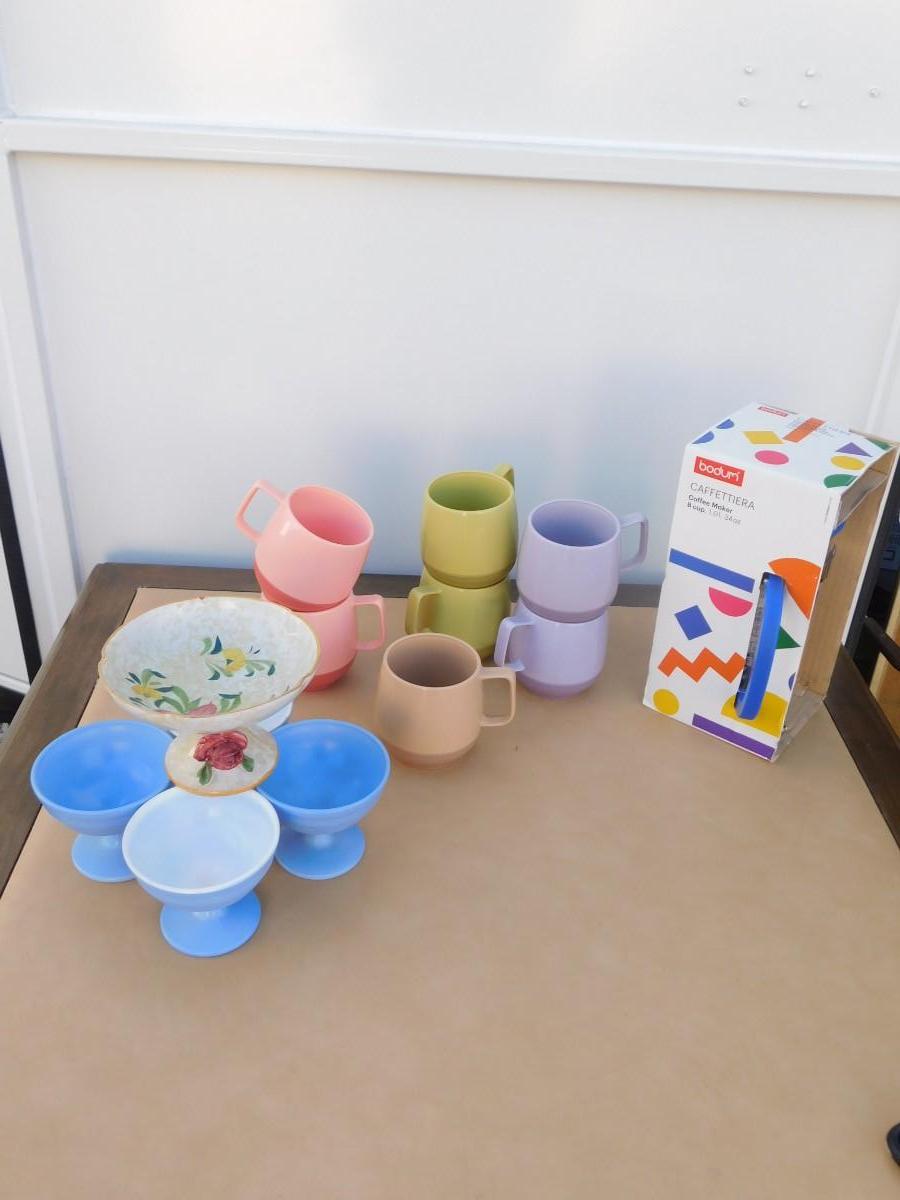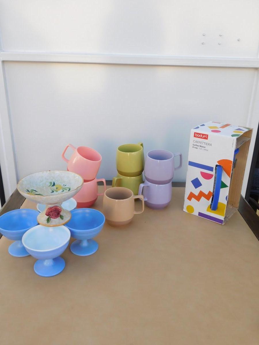 NIB COFFEE PRESS, VINTAGE COFFEE CUPS, ICE CREAM COMMODES, ITALIAN DISH