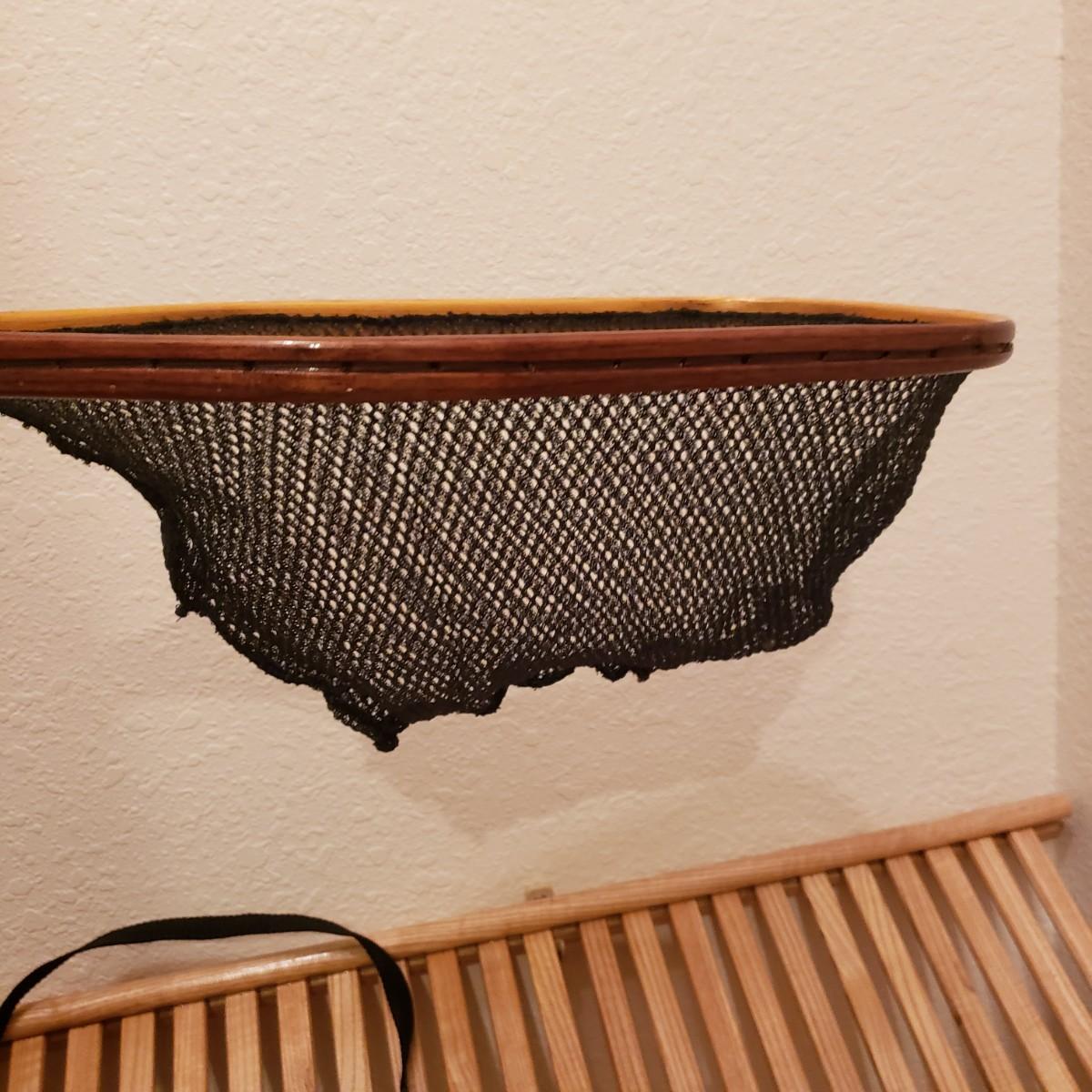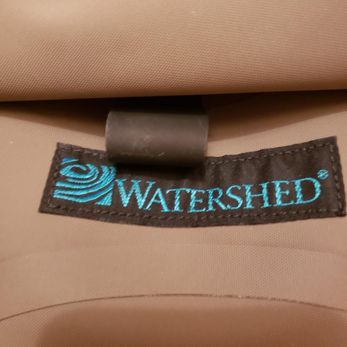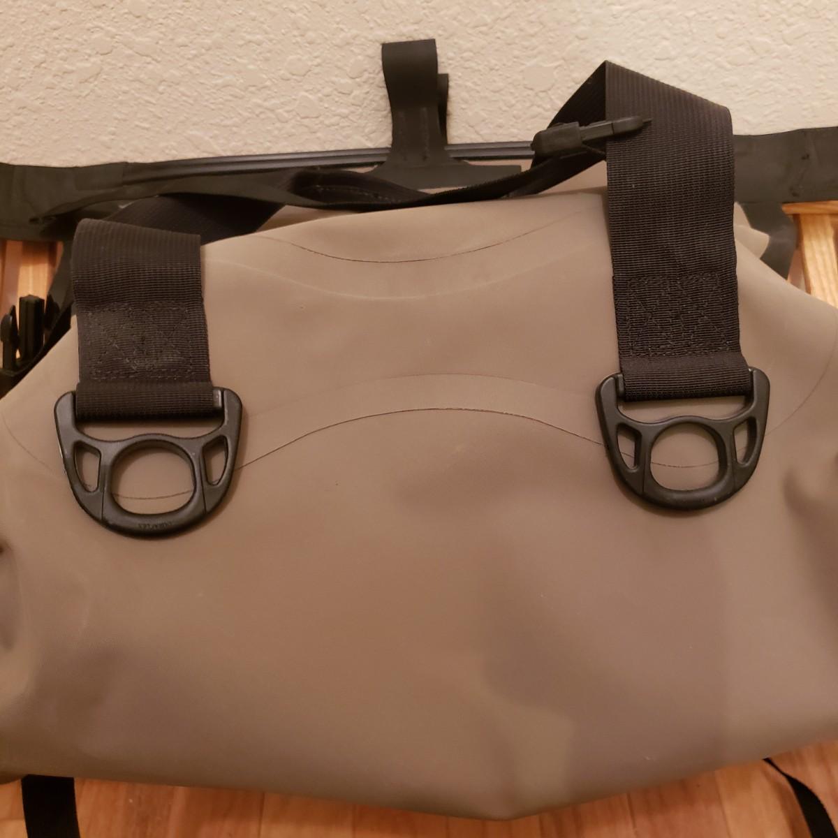 There are two wooden handled fly fishing landing nets by Cabela's and Orvis measuring 23". The new Columbia Flats Chest Pack says O/S. The pack is lined with sheeps wool like material. The boots appear to be Weinbrenner brand and measure approximately 12" in length and 4" wide. The soles are covered in a thick felt like material. The Watershed water proof bag is a heavy rubber like material.