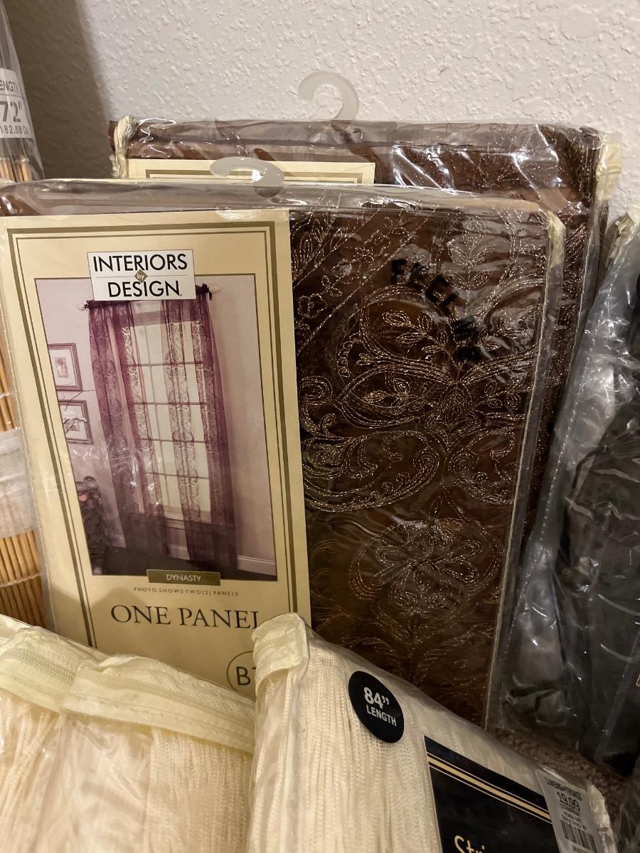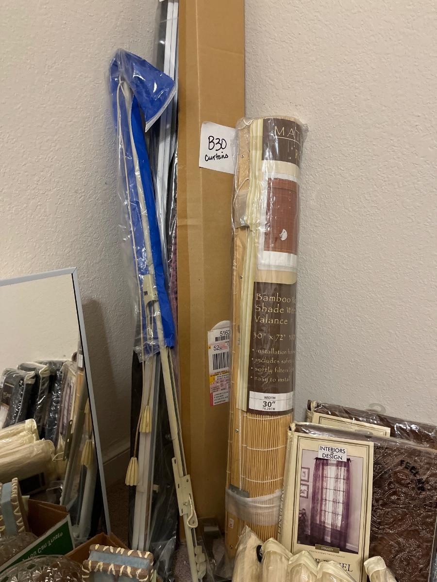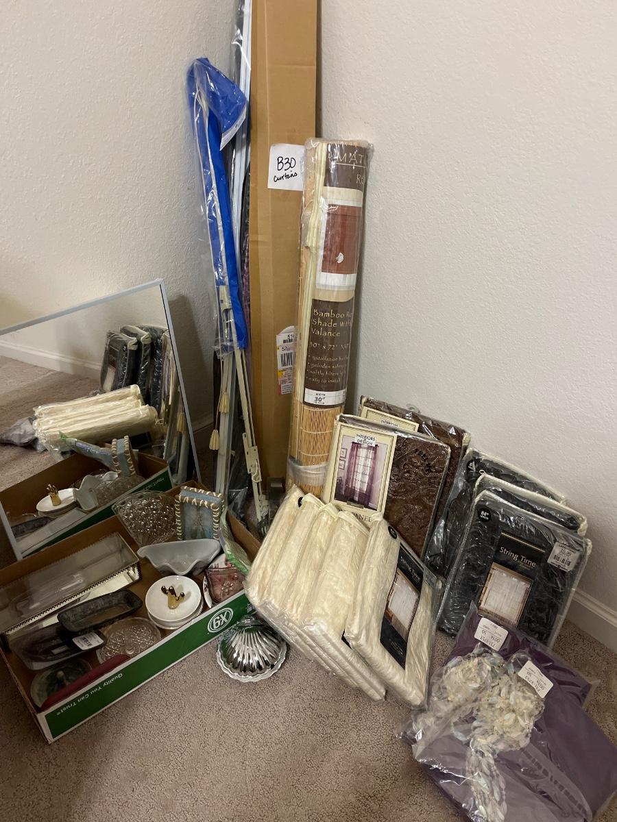 NIB curtains, rods medicine cabinet/mirror and misc glassware