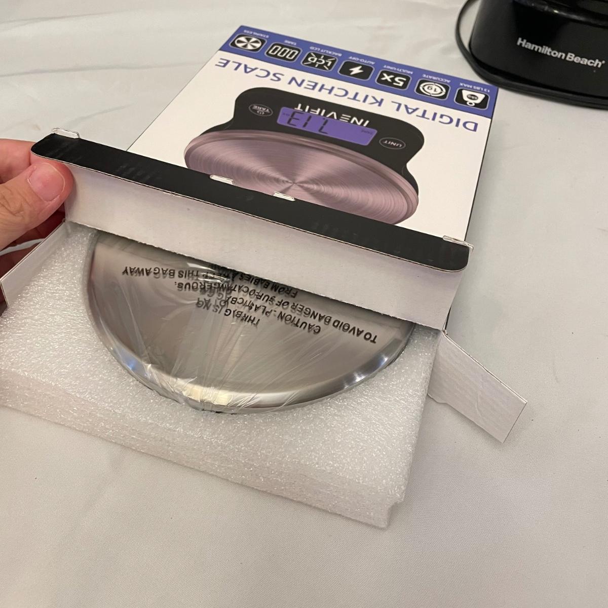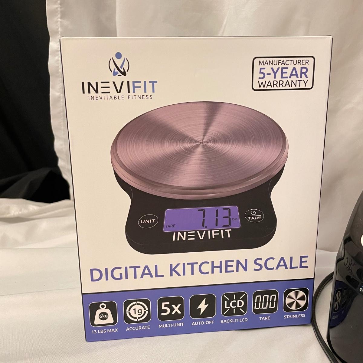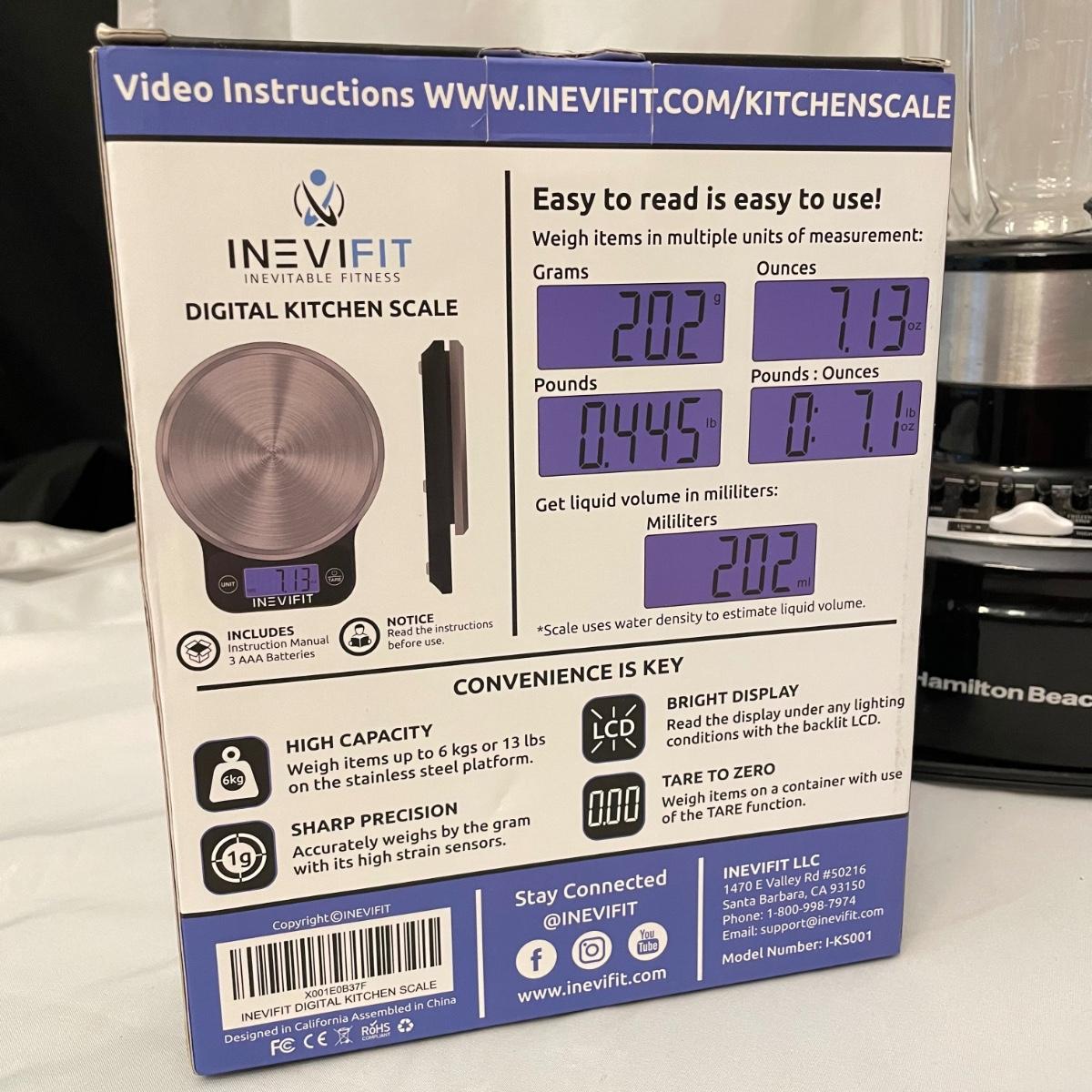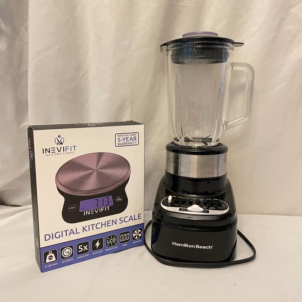 Inevifit digital kitchen scale still in packaging boasts a 13lb capacity and more perks on its box. Scale was not tested. Lot also includes a Hamilton Beach blender with 1.2L glass pitcher and lid. Blender powered on when plugged in. Pitcher has a small cloudy area, this appears to be permanent. Local pick up only.
